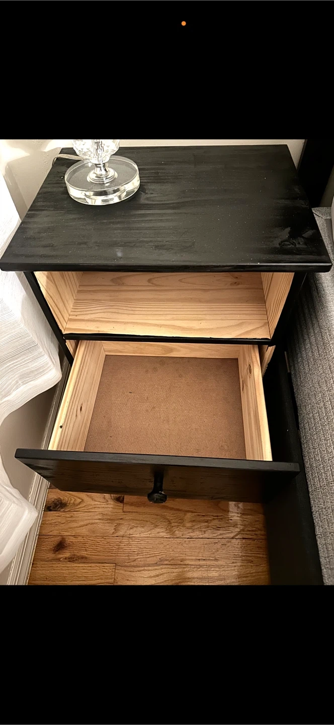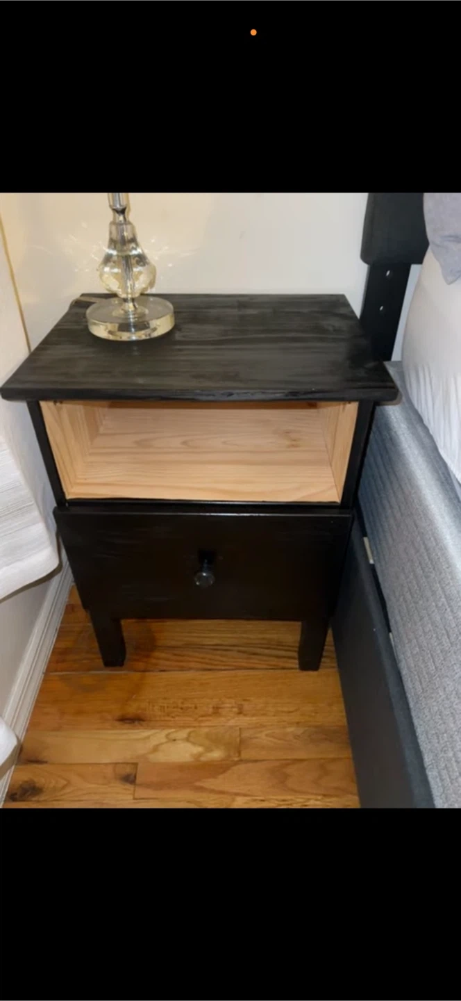 This nightstand features a black painted exterior with a natural wood interior shelf and drawer. It has one drawer with a round knob for storage. The piece is made of wood with a dark finish on the top and sides.