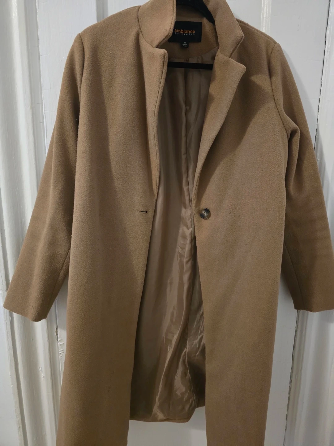Ambiance outerwear camel colored coat. Wool blend material with a satin lining. It has a single button closure. This coat is suitable for cooler weather.