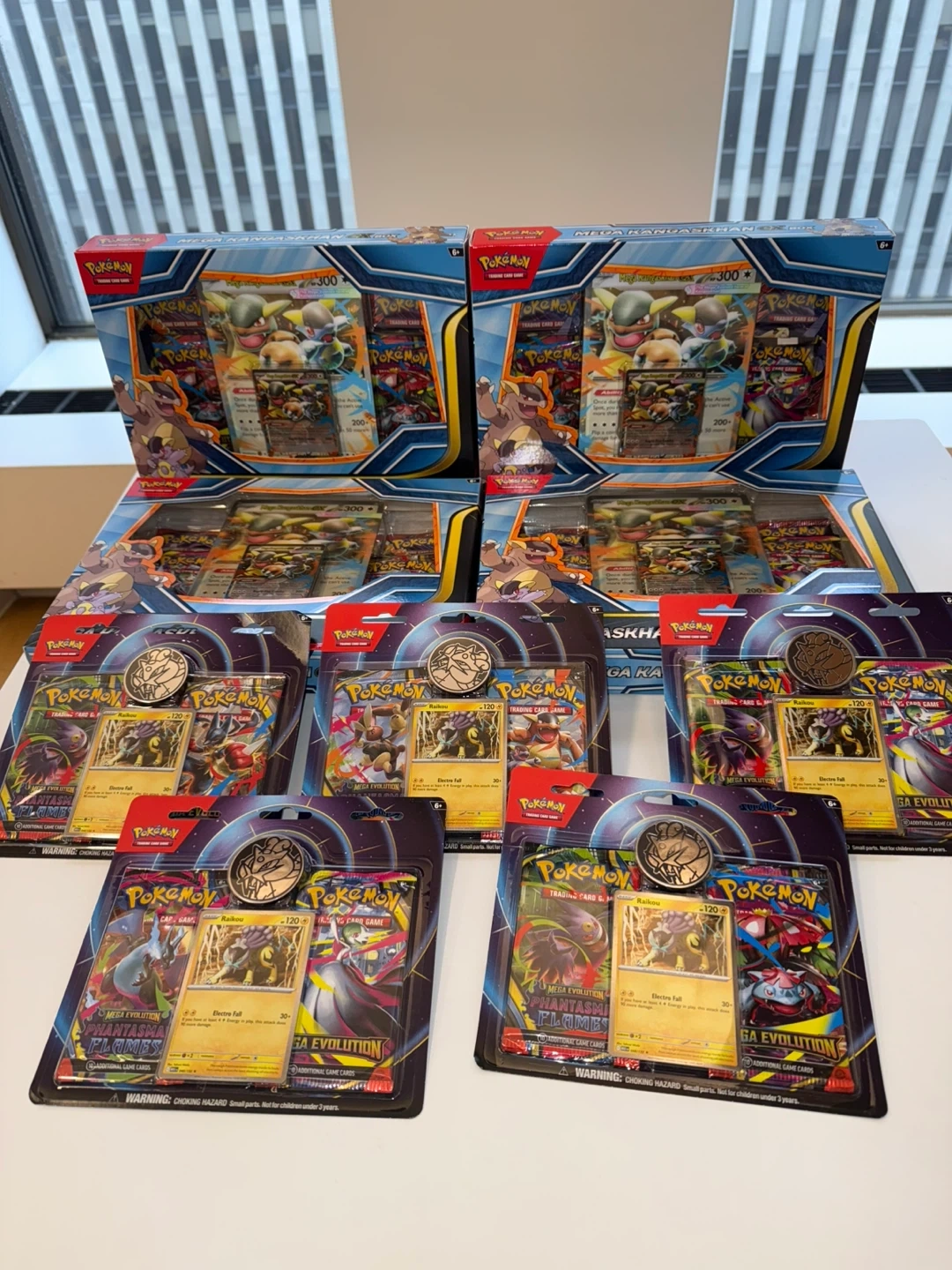 Pokemon Trading Card Game Mega Kangaskhan and Phantasma Flames boxes and blister packs. Includes multiple booster packs and a special coin in each blister pack. These are great for collectors and players alike!