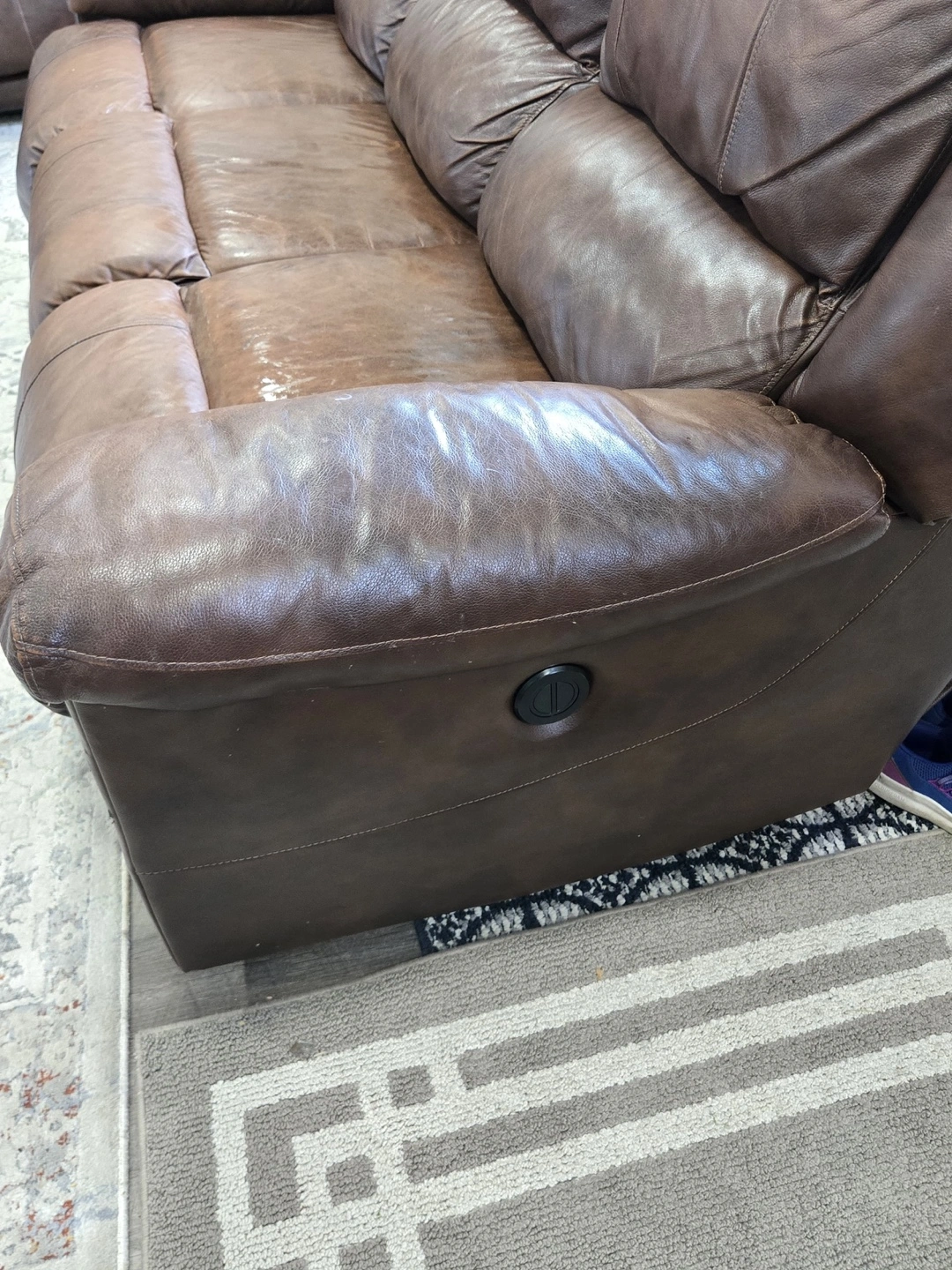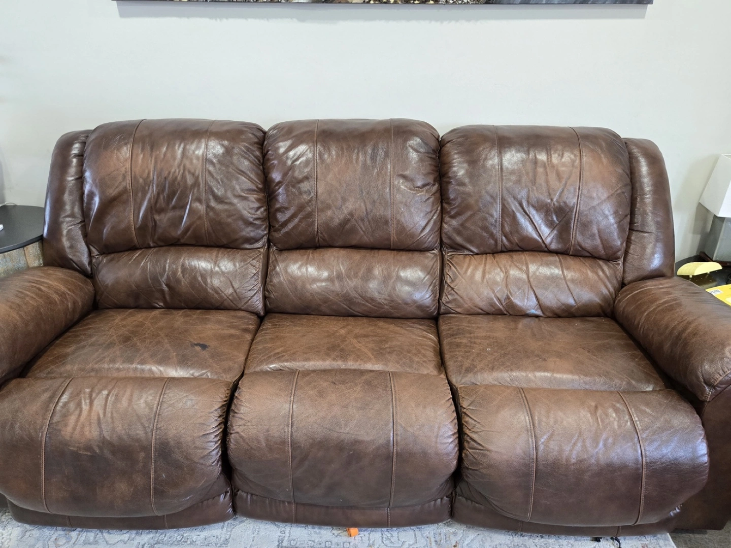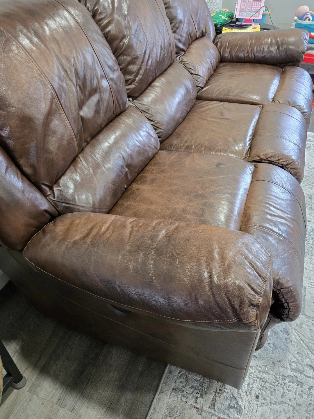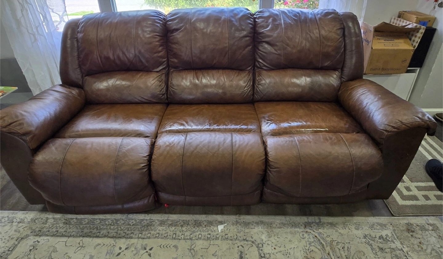 Selling a brown leather reclining sofa. It's a comfortable three-seater, perfect for a living room or entertainment space. The sofa shows some signs of wear, but it's still in good condition and has plenty of life left
