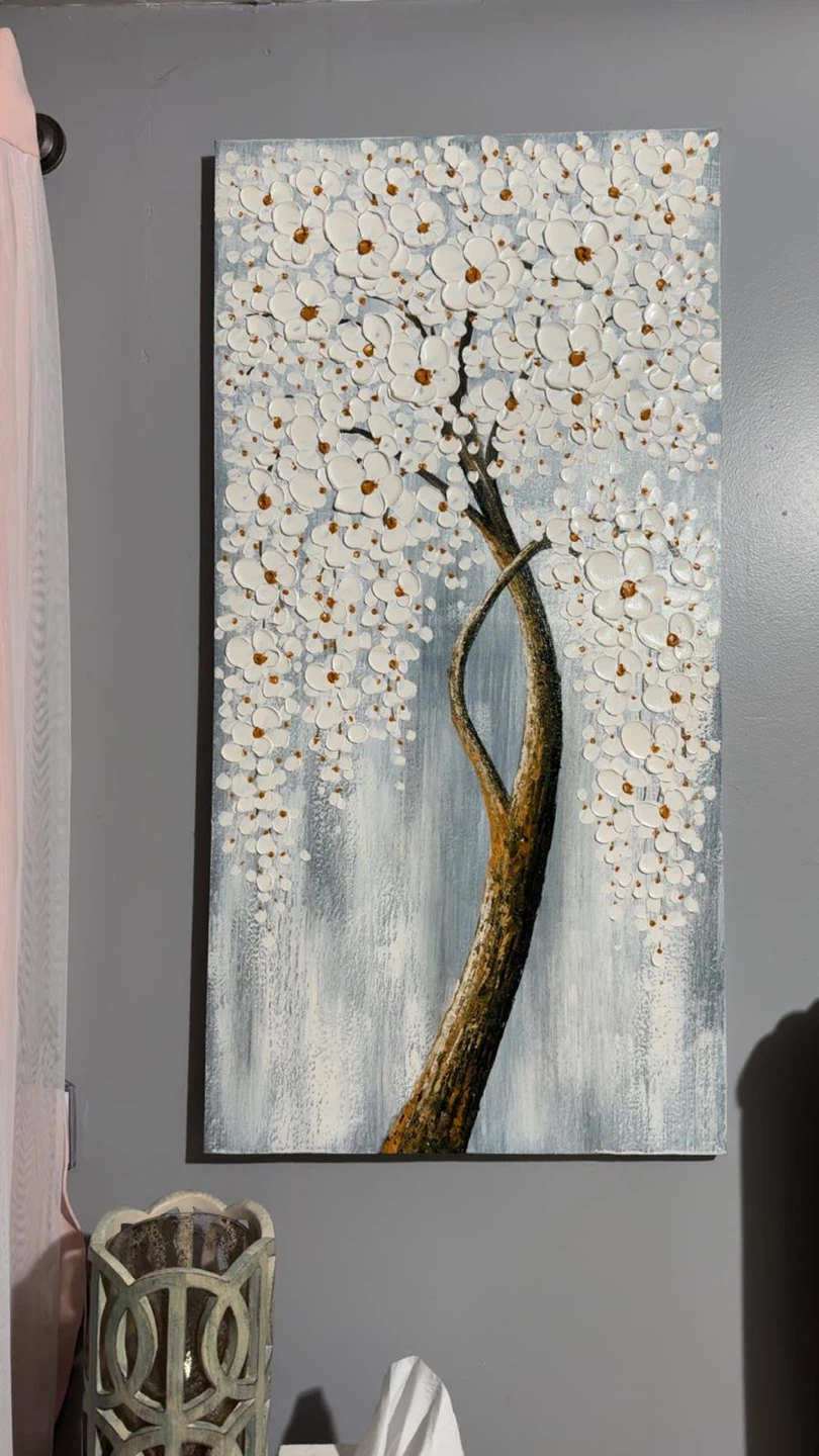 Textured painting of a white blossom tree. It features a thick impasto technique for a 3D effect on the flowers. This piece adds a touch of nature to any room!