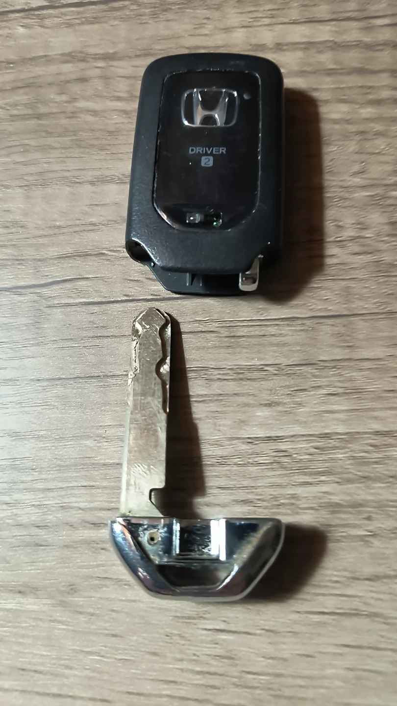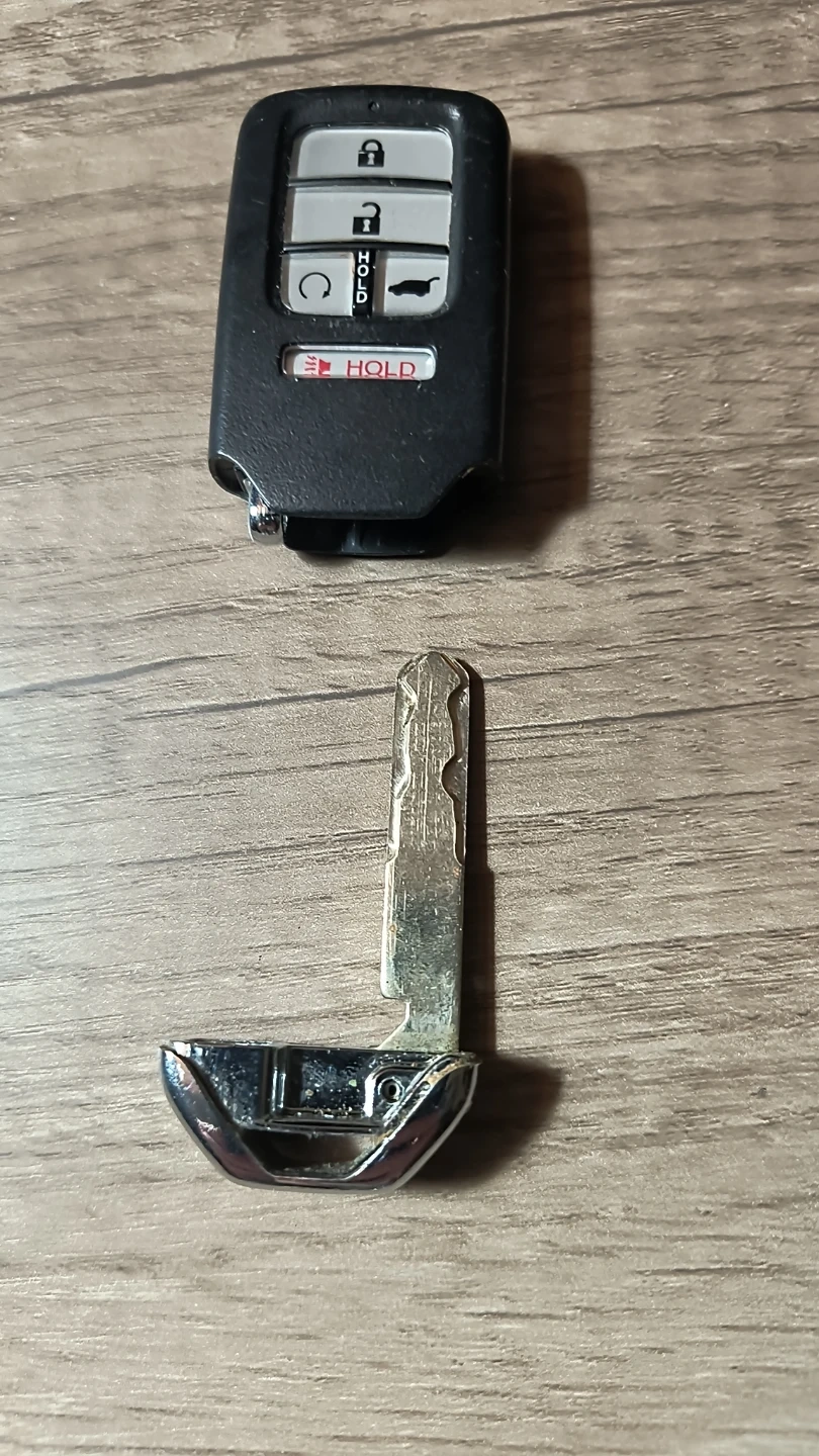 This is a Honda key fob remote. It has lock, unlock, and trunk buttons. The emergency key is included and it's the driver 2 model.