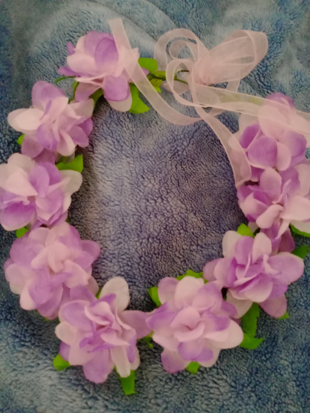 This is a lovely flower crown wreath. It's made with artificial purple and white flowers and green leaves. A sheer ribbon tie is attached for adjustment.