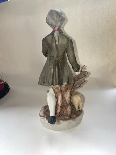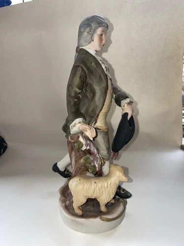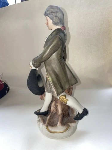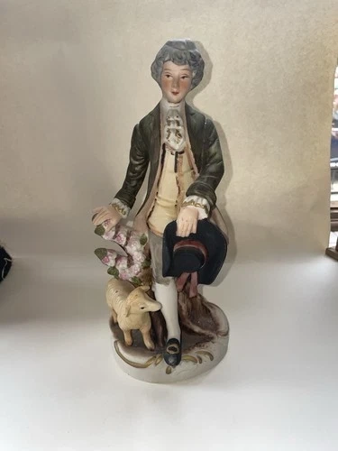 This Arnart Royal Crown-style Victorian porcelain figurine features a multicolored design with a green and beige color scheme, standing at 11 inches tall. Made of ceramic and porcelain.