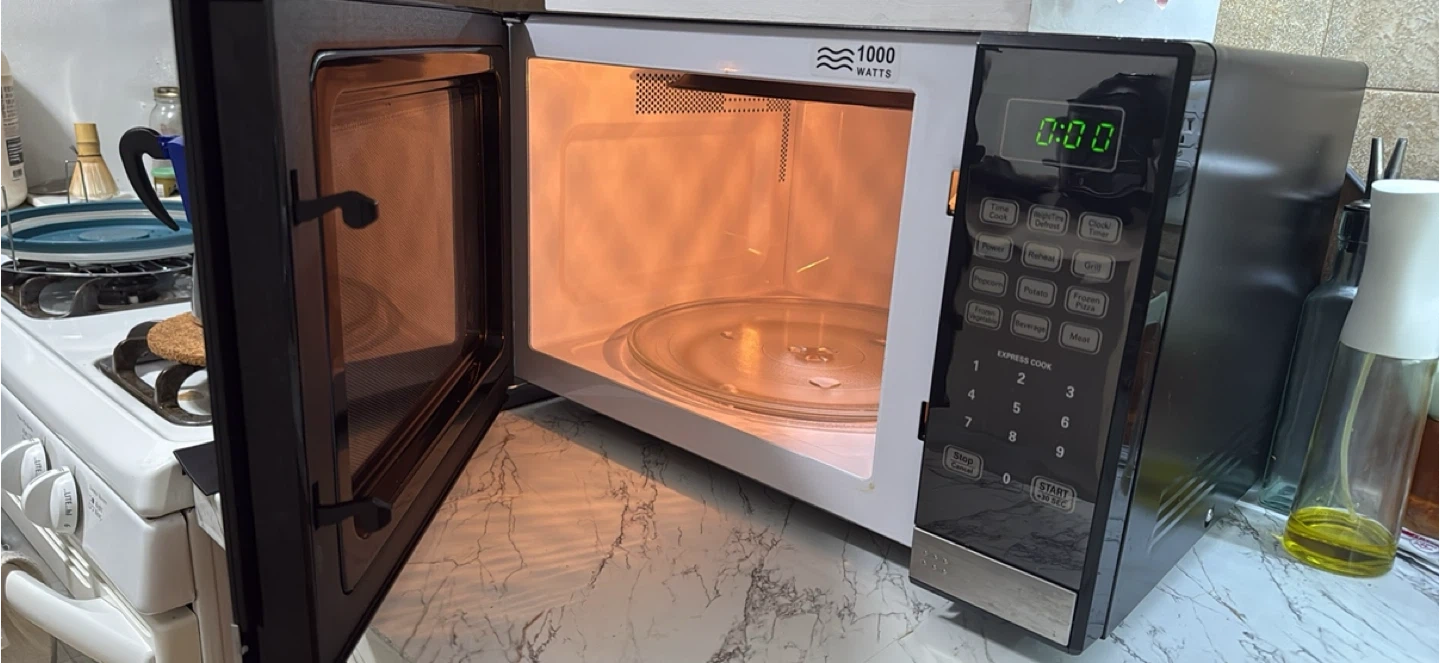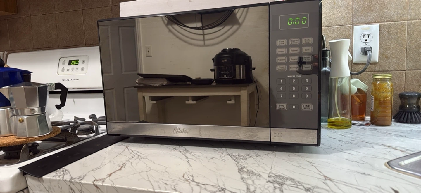 Oster 1000W mirrored microwave with 10 power levels. It features express cook buttons and a digital display. It's black with a stainless steel trim. It comes with grill attachment and 2 microwave save covers.