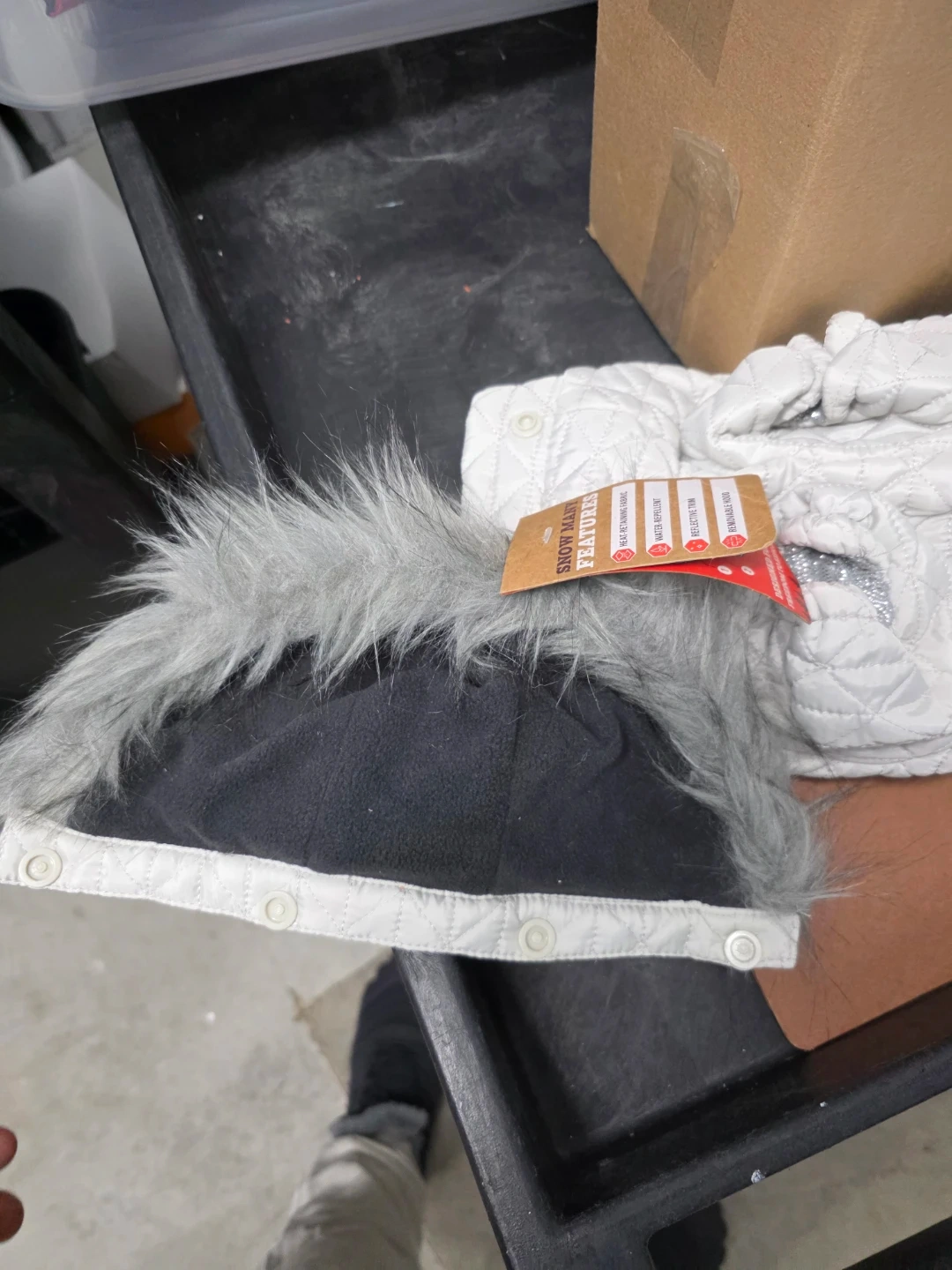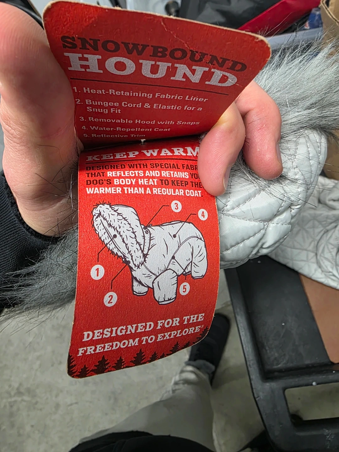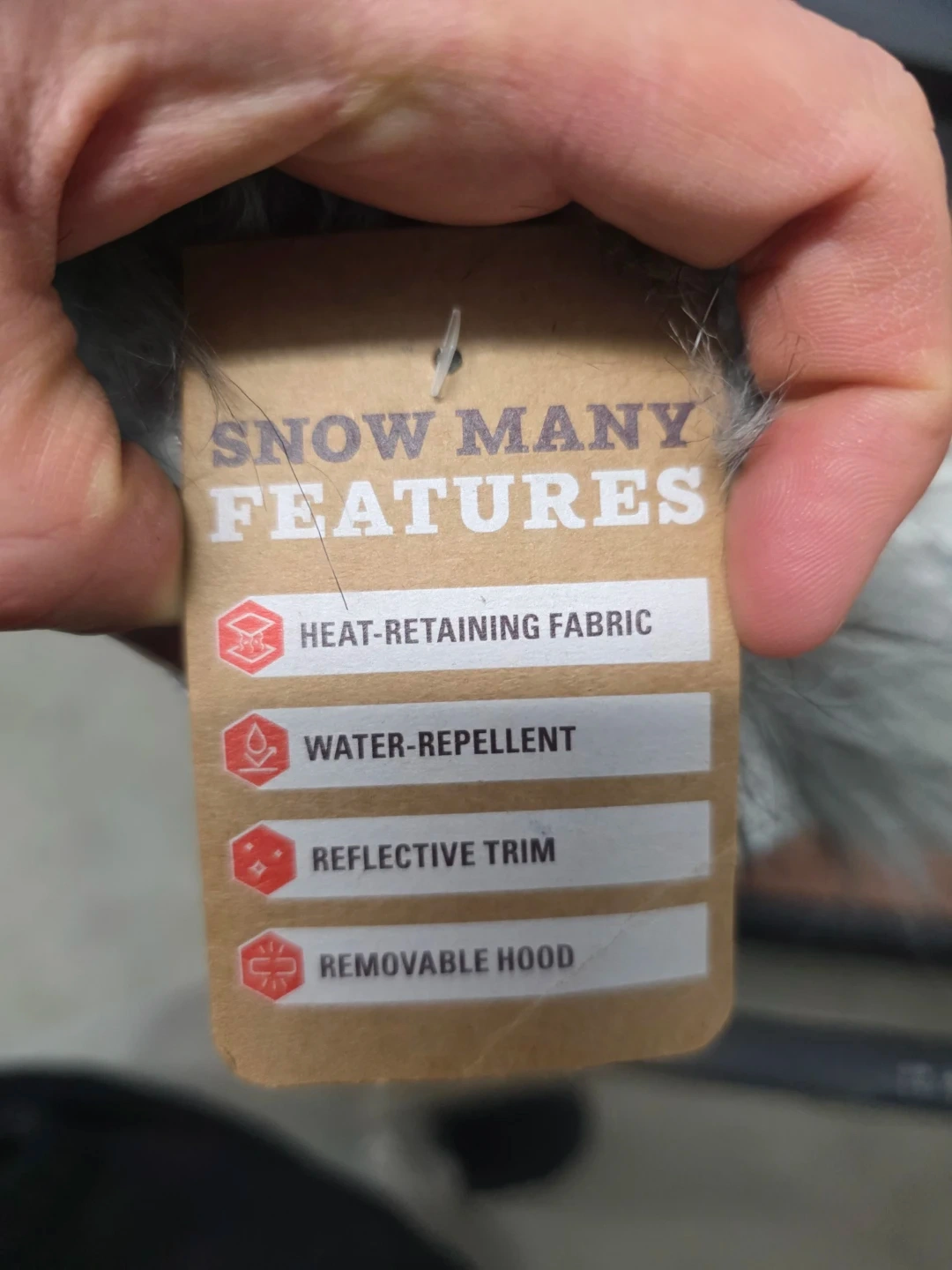 Offering a stylish and functional gray dog coat with the 'Snow Many Features' tag! It boasts heat-retaining fabric, water-repellent material, reflective trim, and a removable hood. Keep your furry friend warm and visible during those winter walks