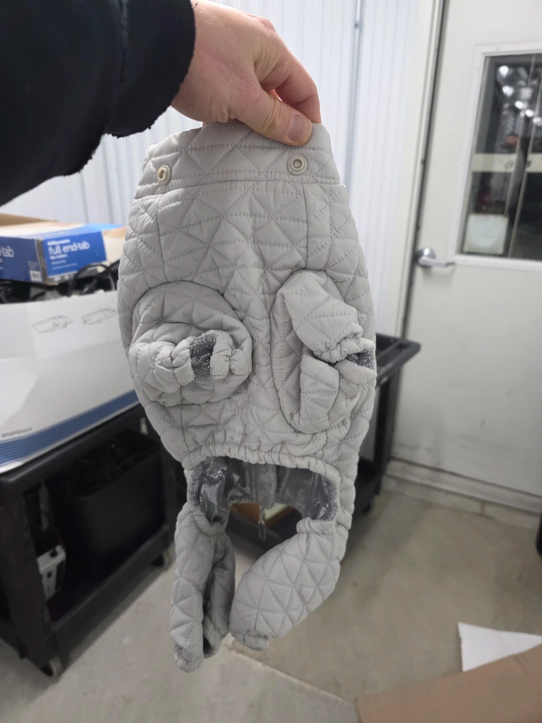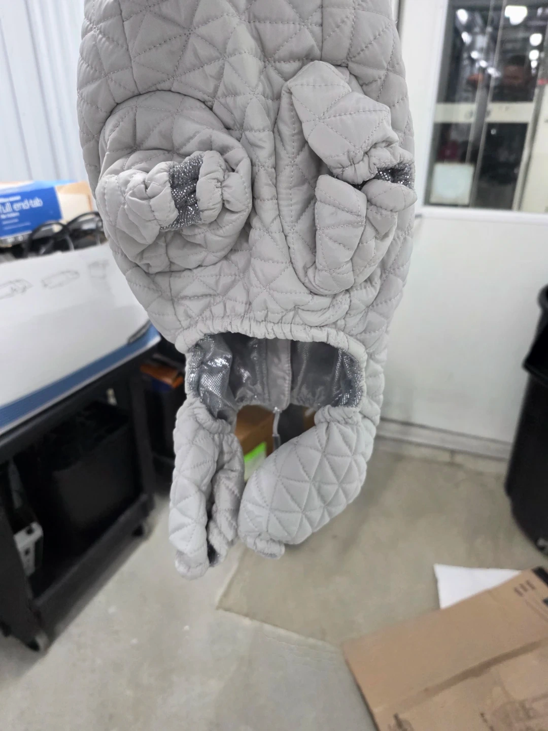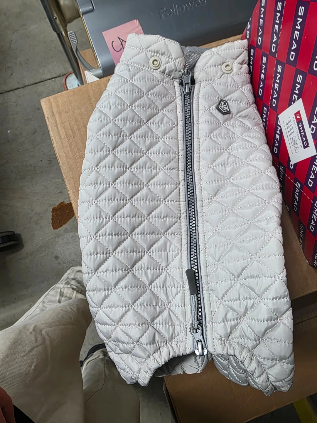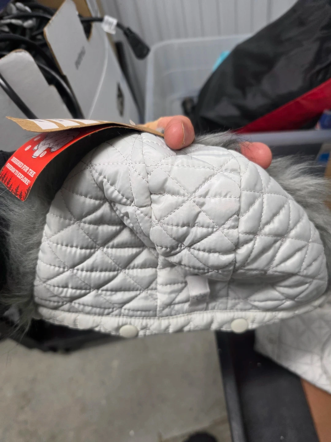 Offering a stylish and functional gray dog coat with the 'Snow Many Features' tag! It boasts heat-retaining fabric, water-repellent material, reflective trim, and a removable hood. Keep your furry friend warm and visible during those winter walks