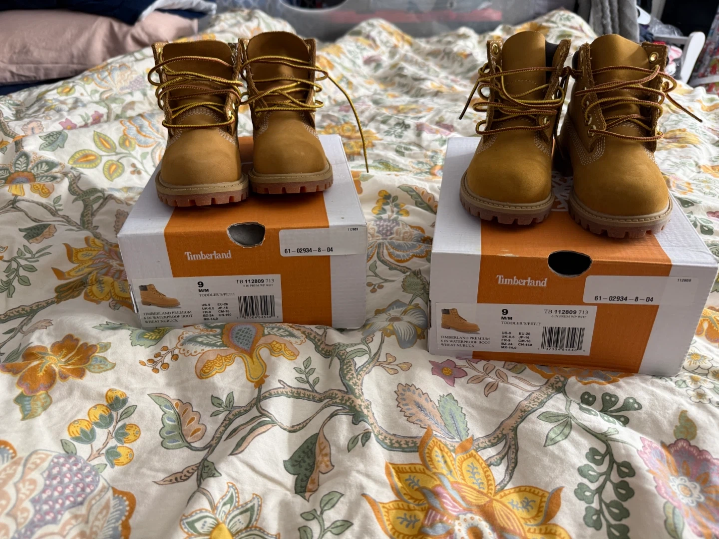 I'm selling these Timberland toddler premium 6-inch waterproof boots. They are in great condition and come with the original box! Perfect for keeping your little one's feet dry and stylish.. worn only once both size 9 good condition