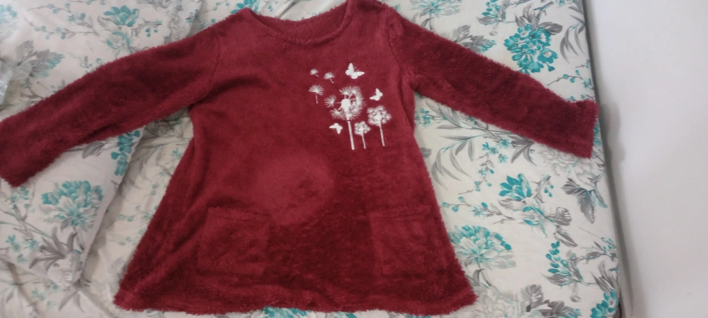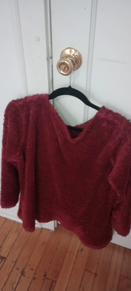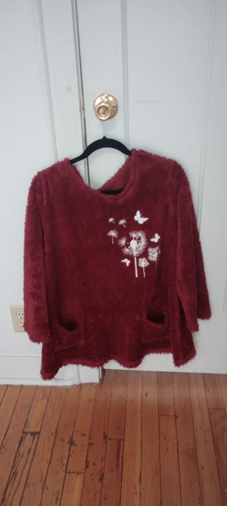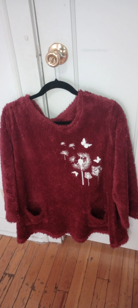 A cozy burgundy fuzzy top with a dandelion and butterfly design! It has a soft, plush texture and two cute front pockets. Perfect for staying warm and stylish! I can make it less if want