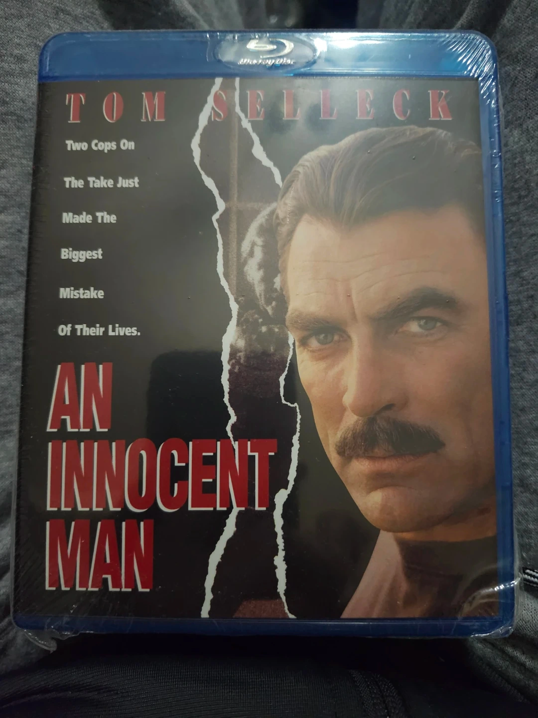 This is the Blu-ray edition of the movie An Innocent Man, starring Tom Selleck. It's still sealed in its original plastic wrap. This film follows two cops on the take just made the biggest mistake of their lives. It's a crime drama.