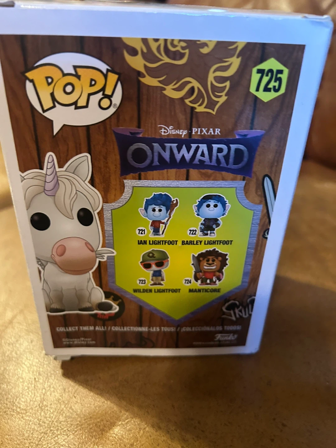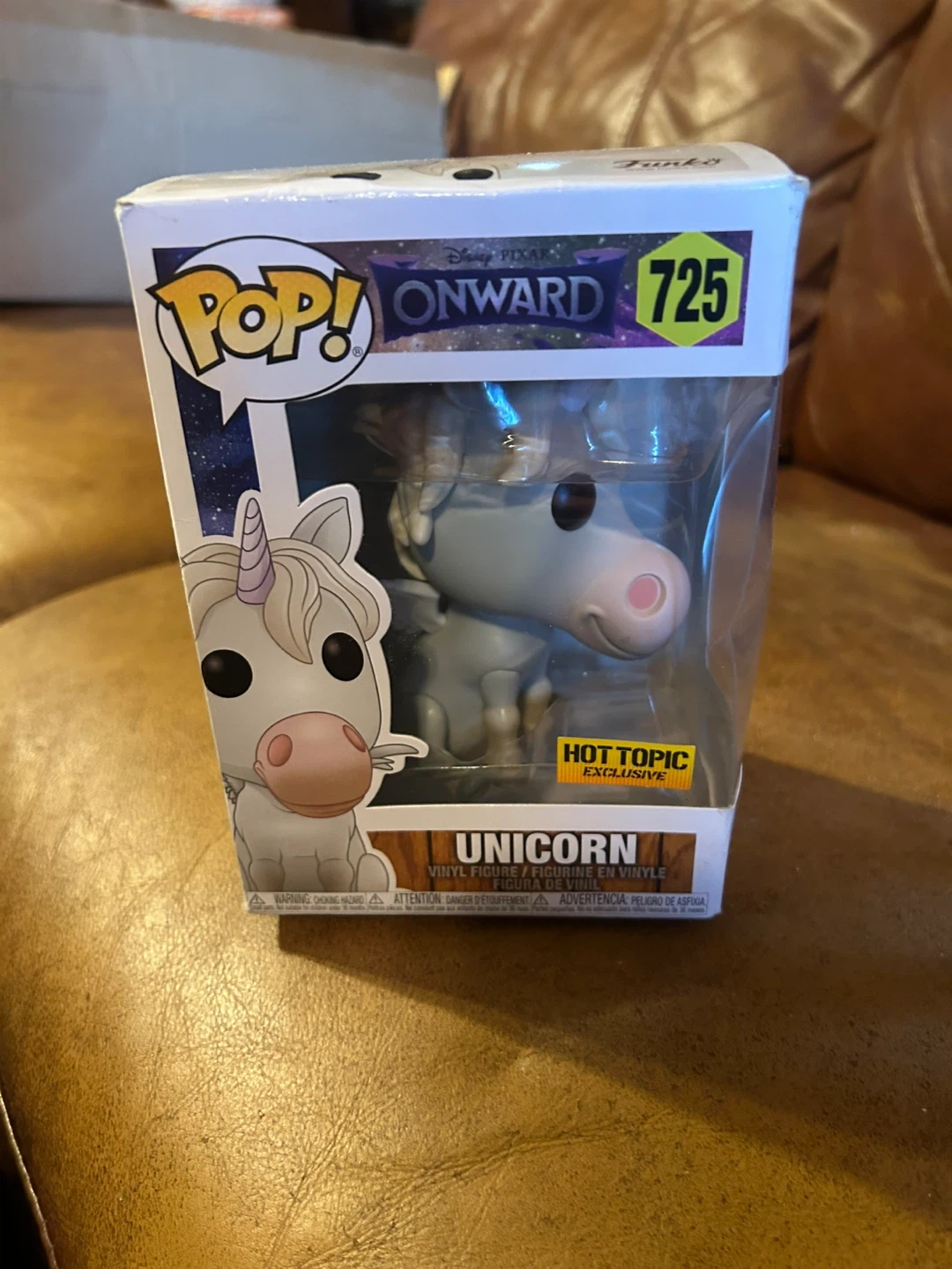 Selling a Funko Pop! figure from the Disney Pixar movie Onward. This is the Unicorn character, number 725 in the series. It's a Hot Topic exclusive and comes in its original box. Perfect for any Funko collector or Disney fan!