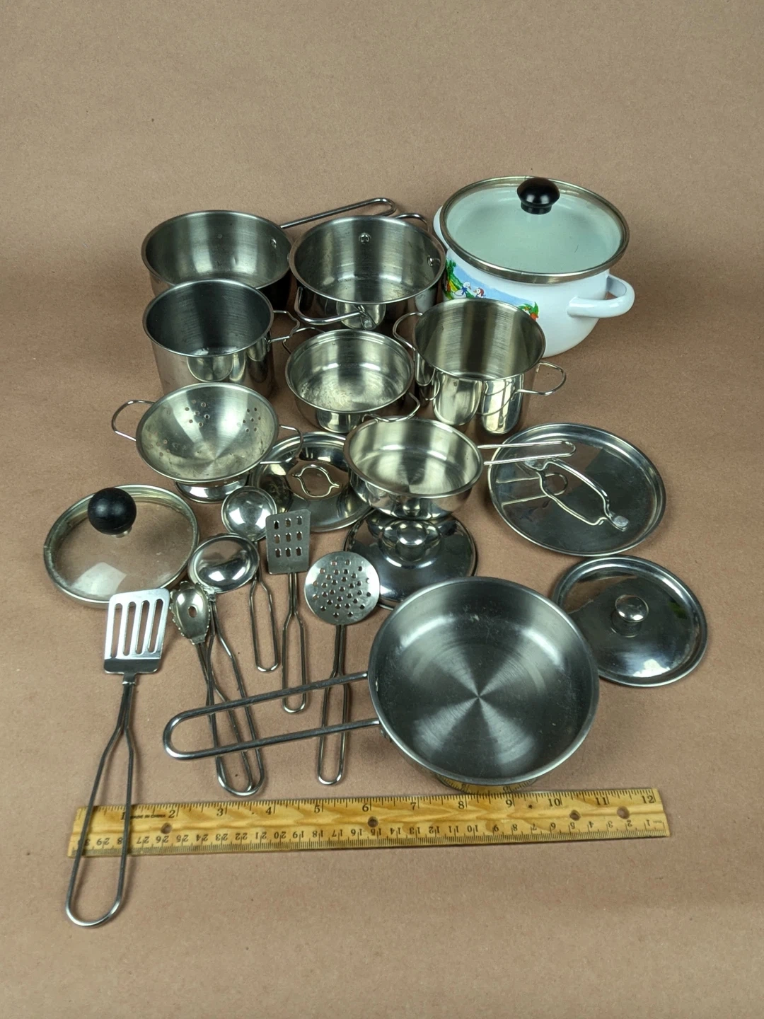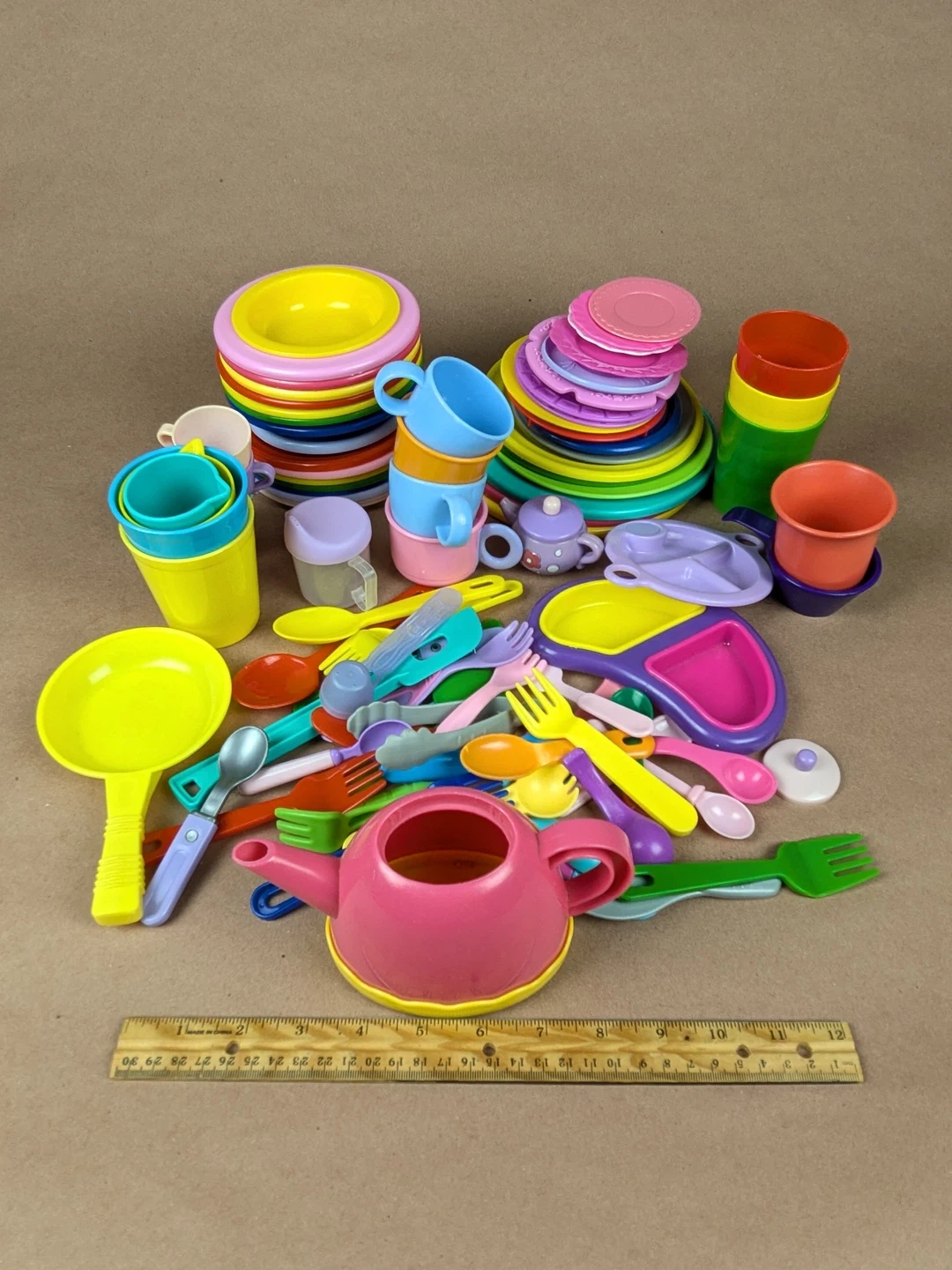 This toy set includes a tea set with a teapot, cups, and saucers, along with various play kitchen items like pots, pans, utensils, and dishes. It's great for imaginative play and hours of fun for kids!