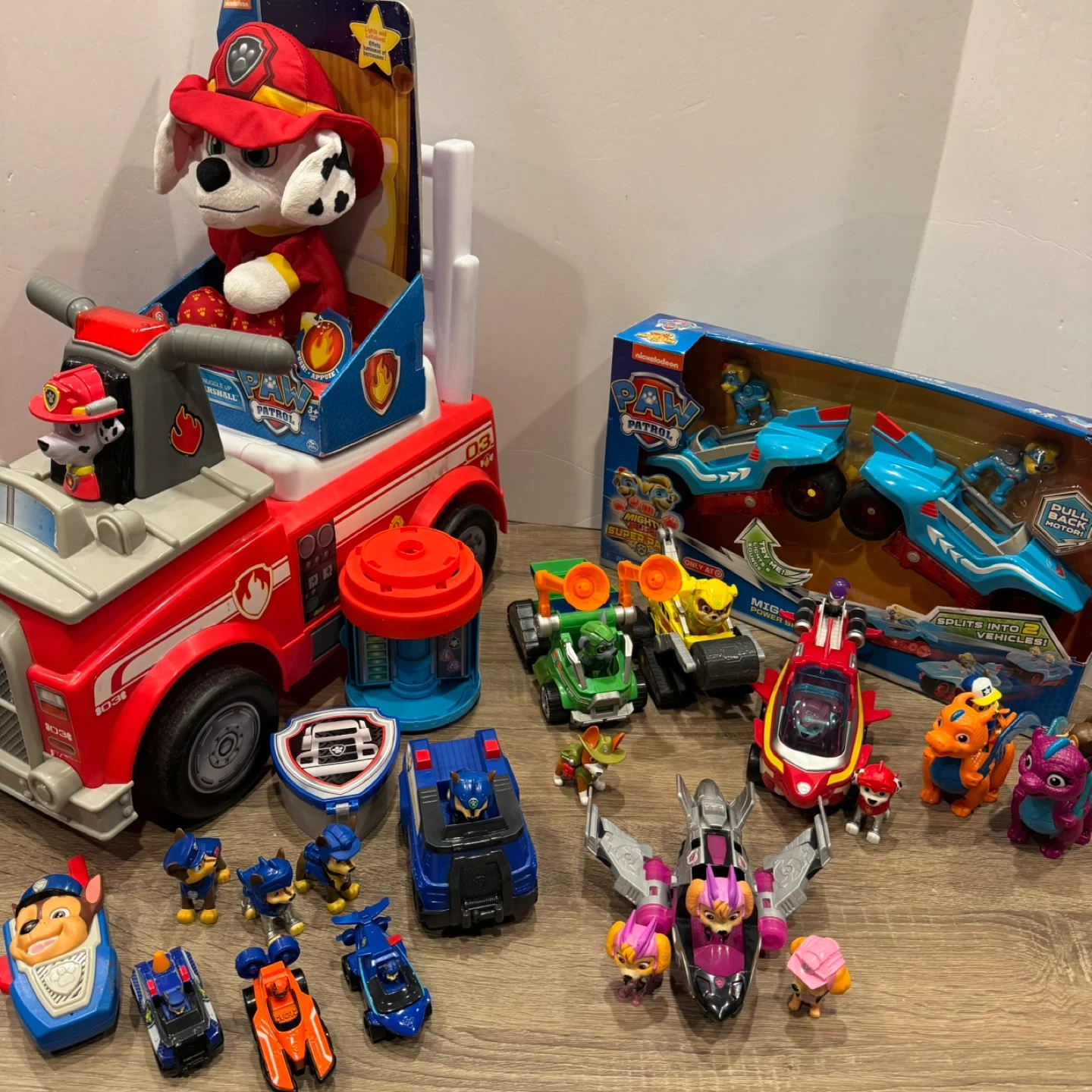 This is a collection of Paw Patrol toys featuring Marshall's fire truck and several character vehicles. Includes a plush Marshall figure.