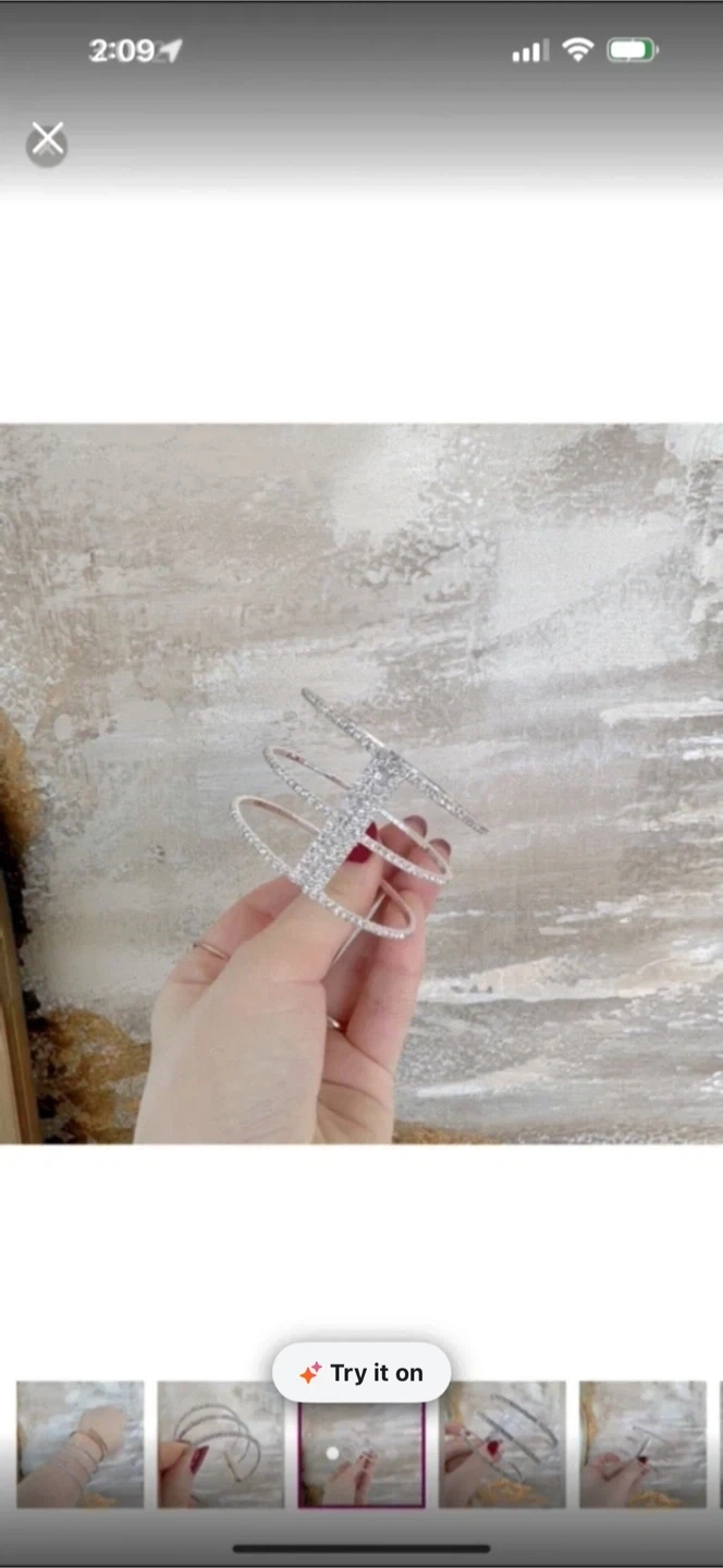 This is a cuff bracelet adorned with rhinestones. It's silver-toned and has a unique, multi-layered design. The bracelet is open-backed for adjustability.