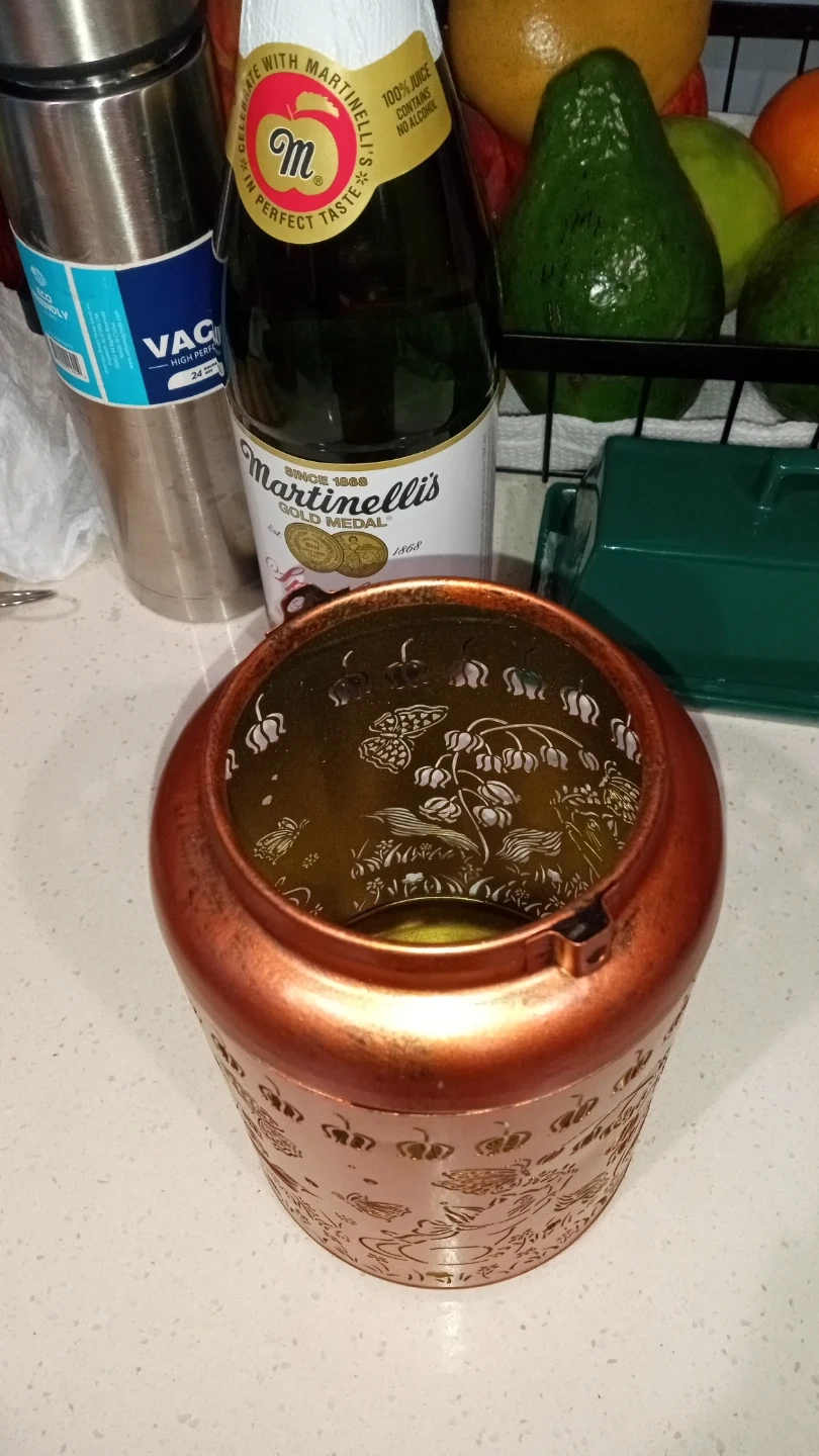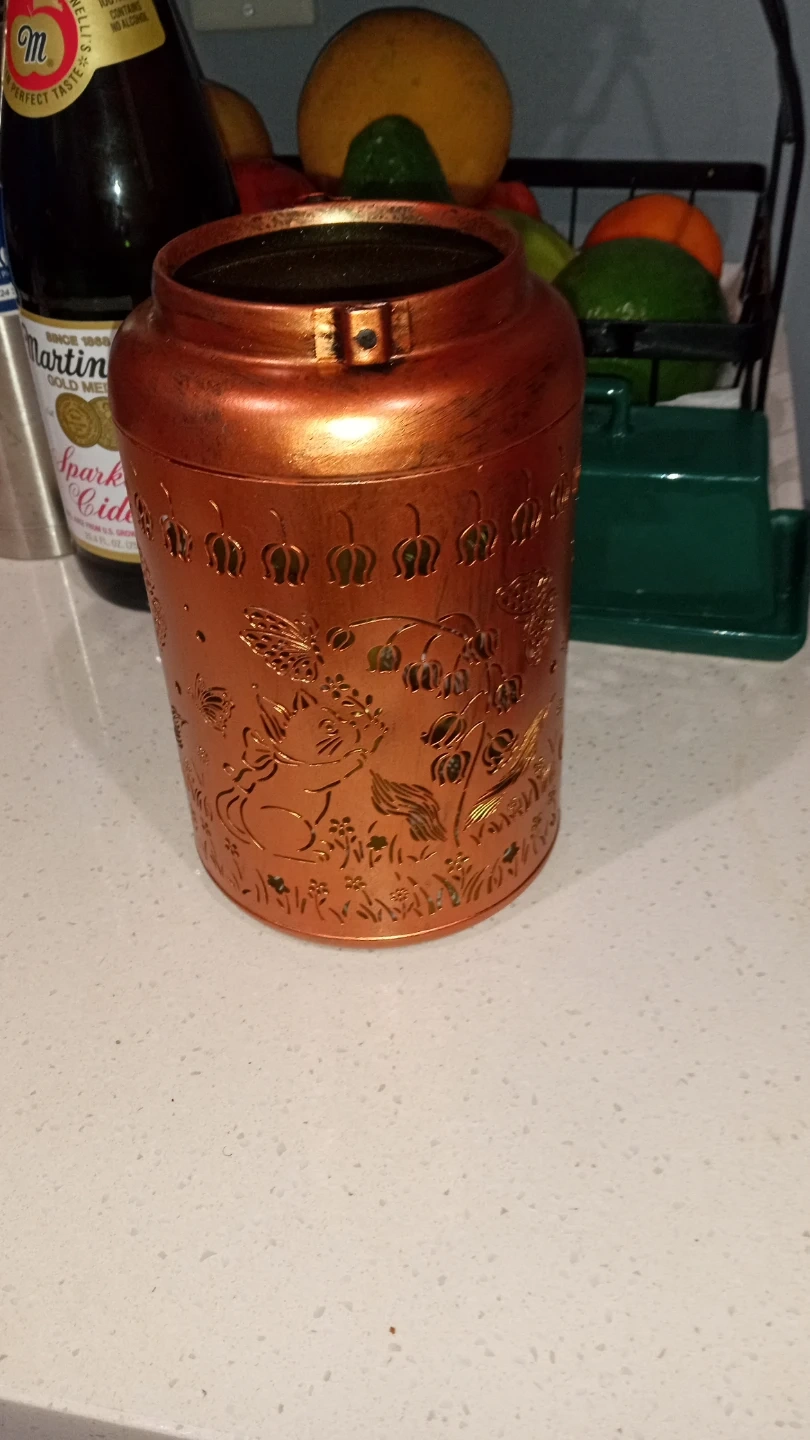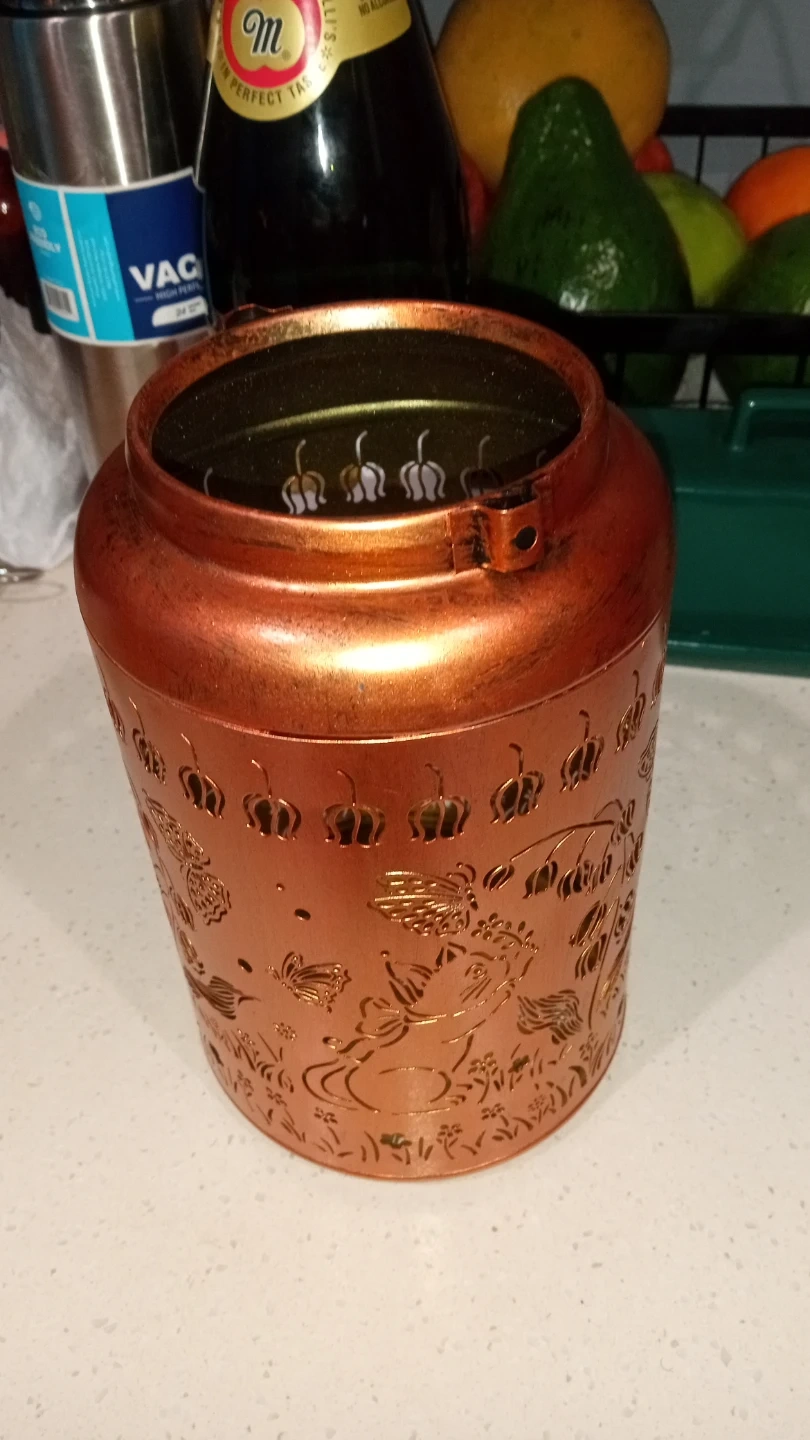 This decorative lantern has a copper finish and intricate cutouts. It's perfect for holding a candle and adding ambiance to any room. Its metal construction ensures durability. BINGO!!
