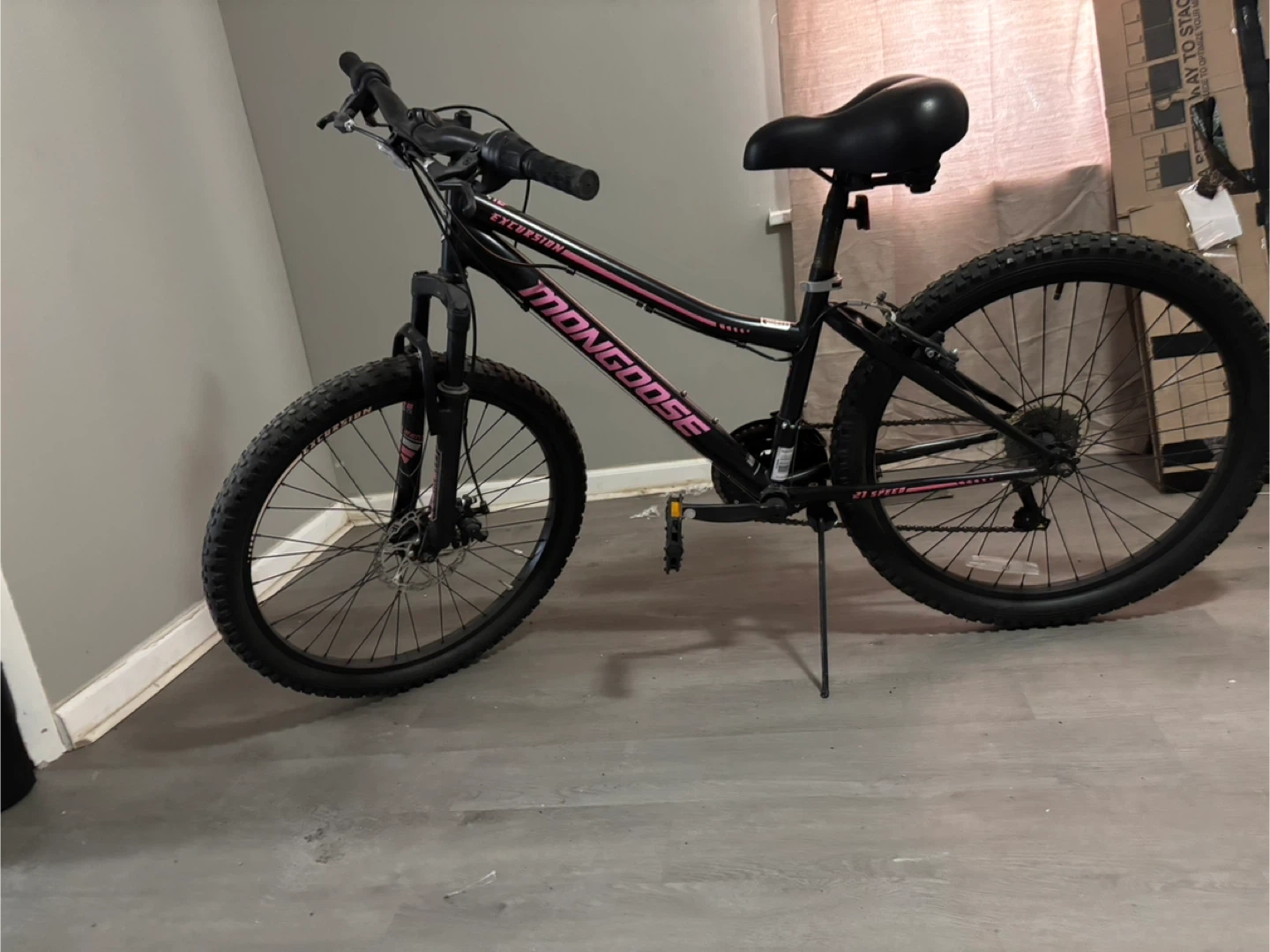 Black Mongoose Excursion mountain bike with pink accents. It's a 21-speed bicycle. Great for trails or casual rides!