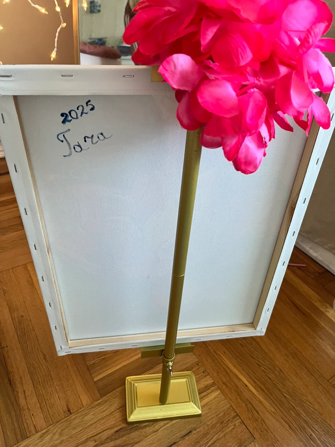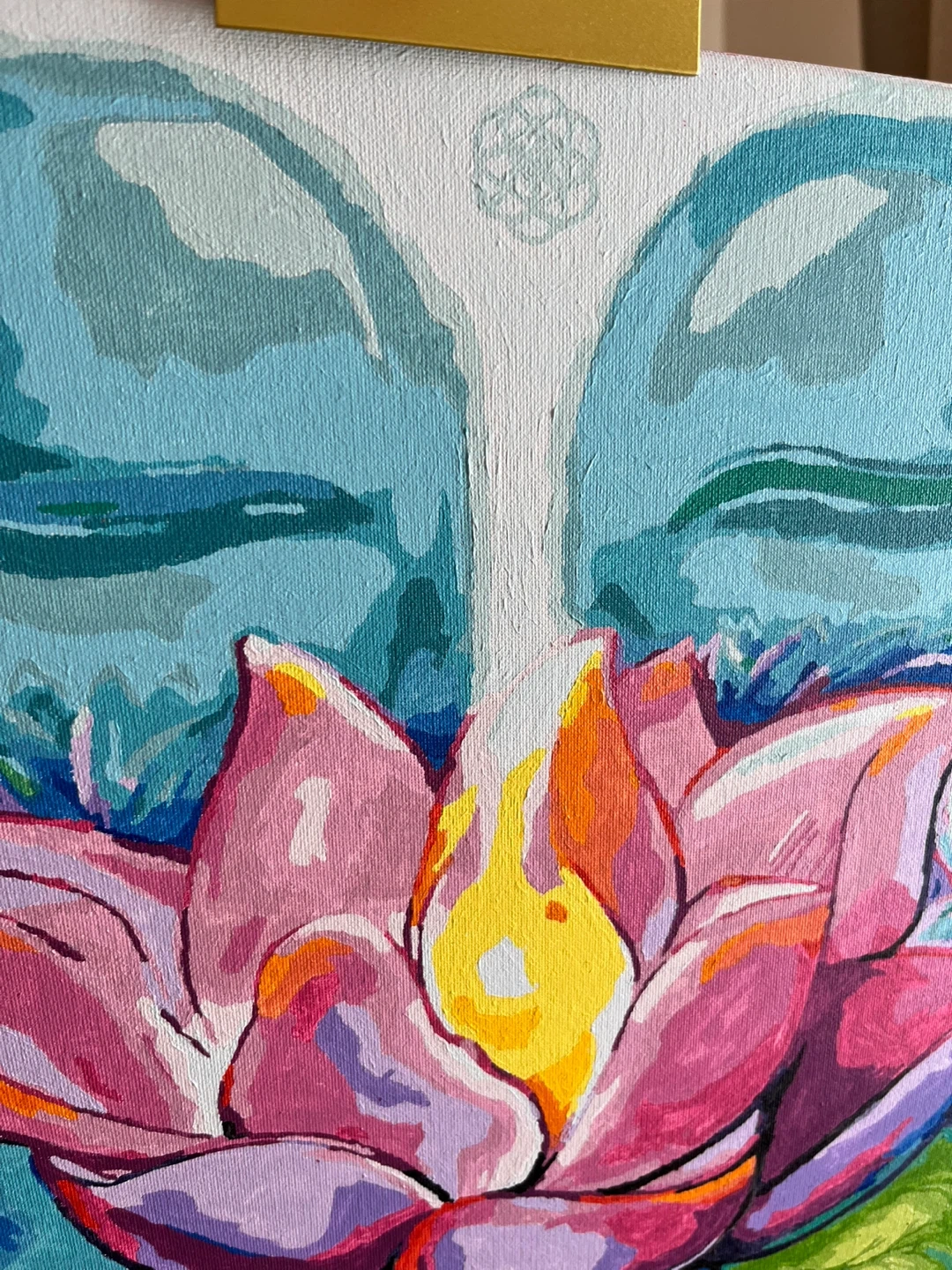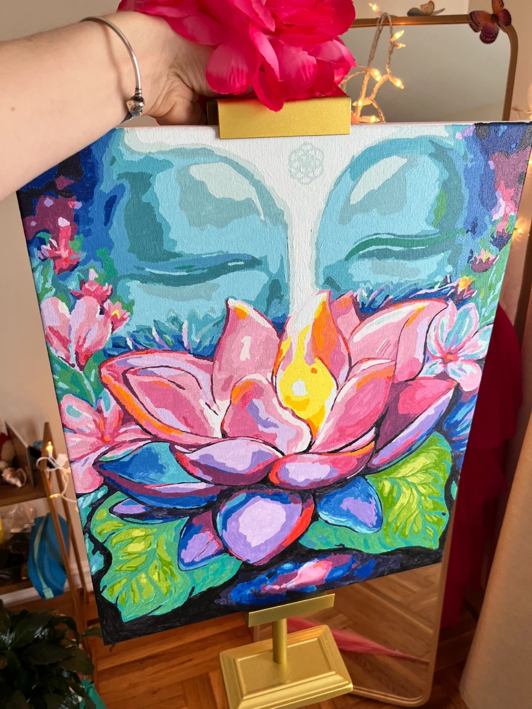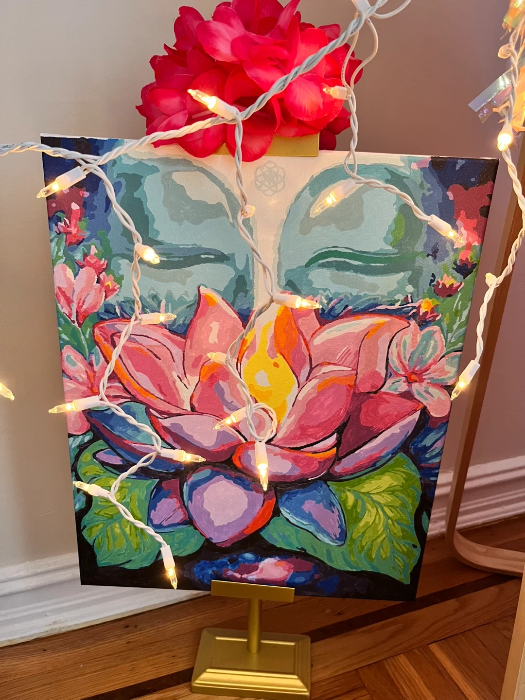 Hand-painted canvas art featuring a serene Buddha face and a vibrant lotus flower. The painting includes a stand and has '2025 Tara' inscribed on the back. This artwork would add a peaceful touch to any meditation space.