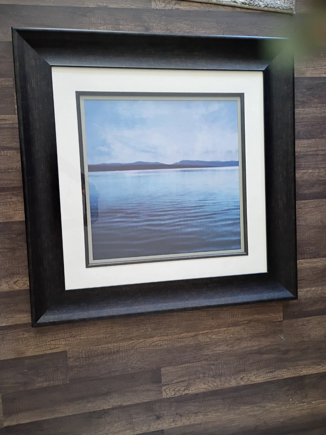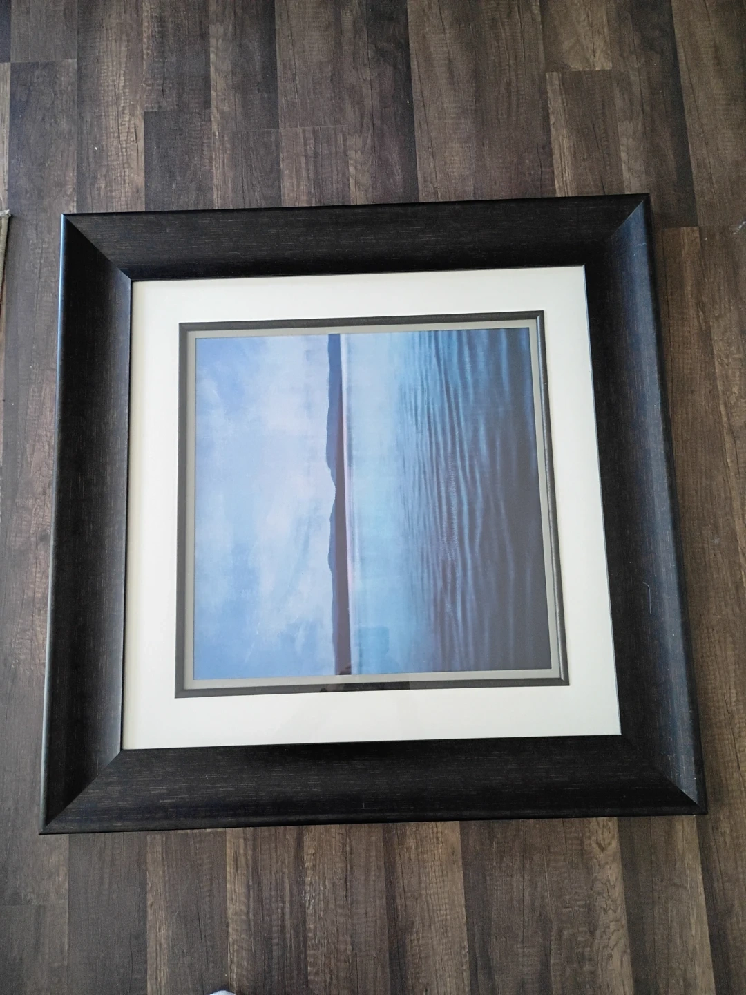 Selling a framed art piece from Z Gallerie called Tranquil Waters 1. It's a beautiful piece with a calming blue water scene. The frame is black and the size is 32x32. Originally bought for $139.95