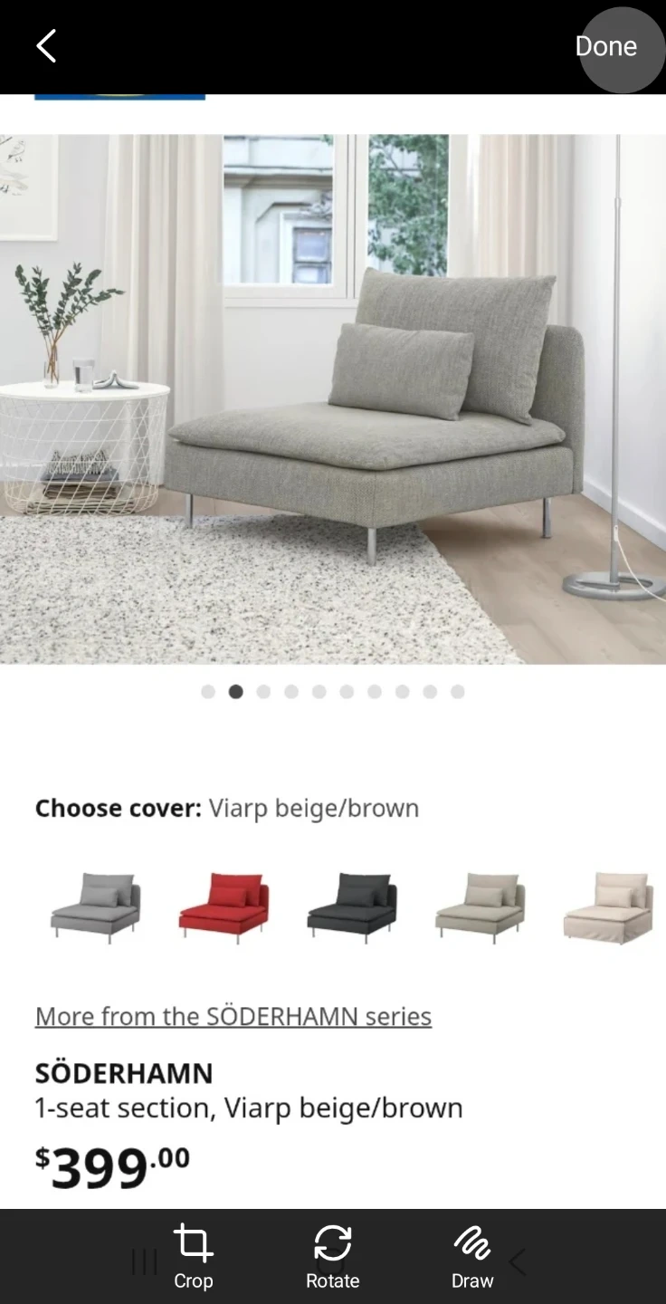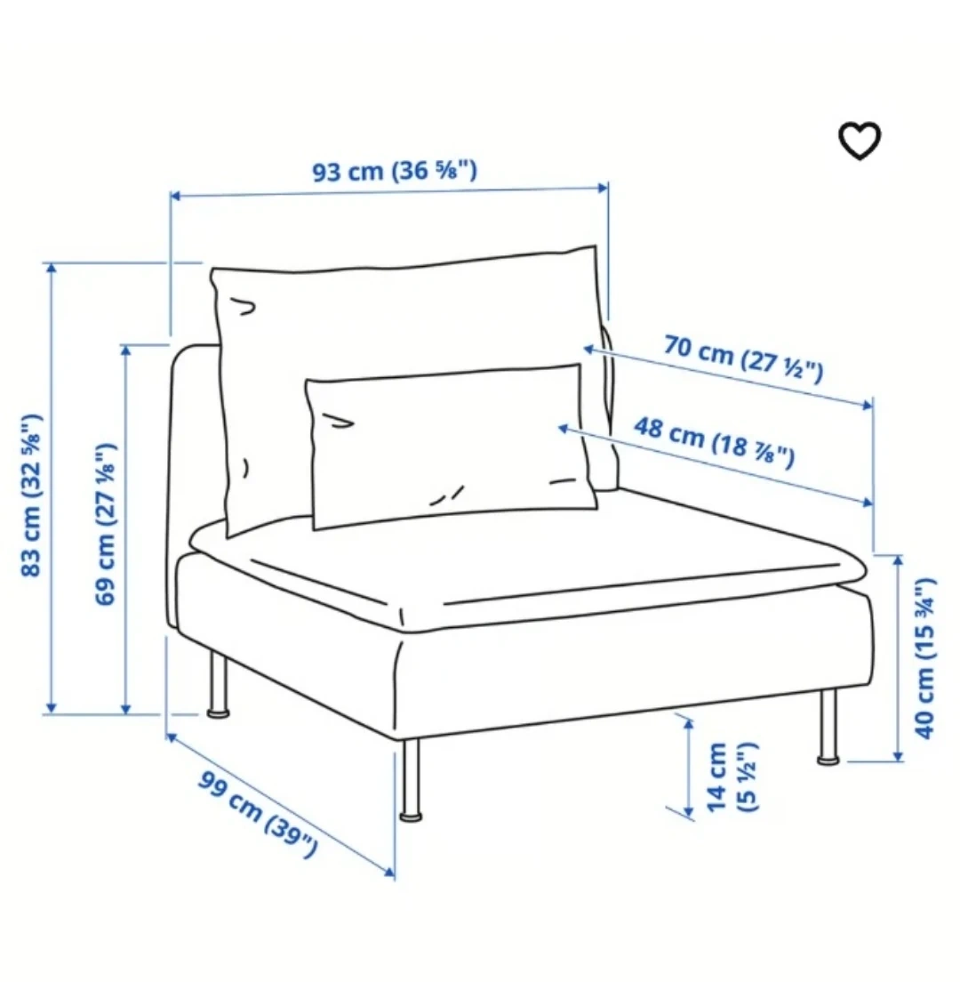 IKEA SÖDERHAMN 1-seat section in tonerud gray. Dimensions: 99 cm (39") wide, 83 cm (32 5/8") high. Seat height is 40 cm (15 3/4"). Comes with two cushions. This modular sofa section works well for smaller spaces.
