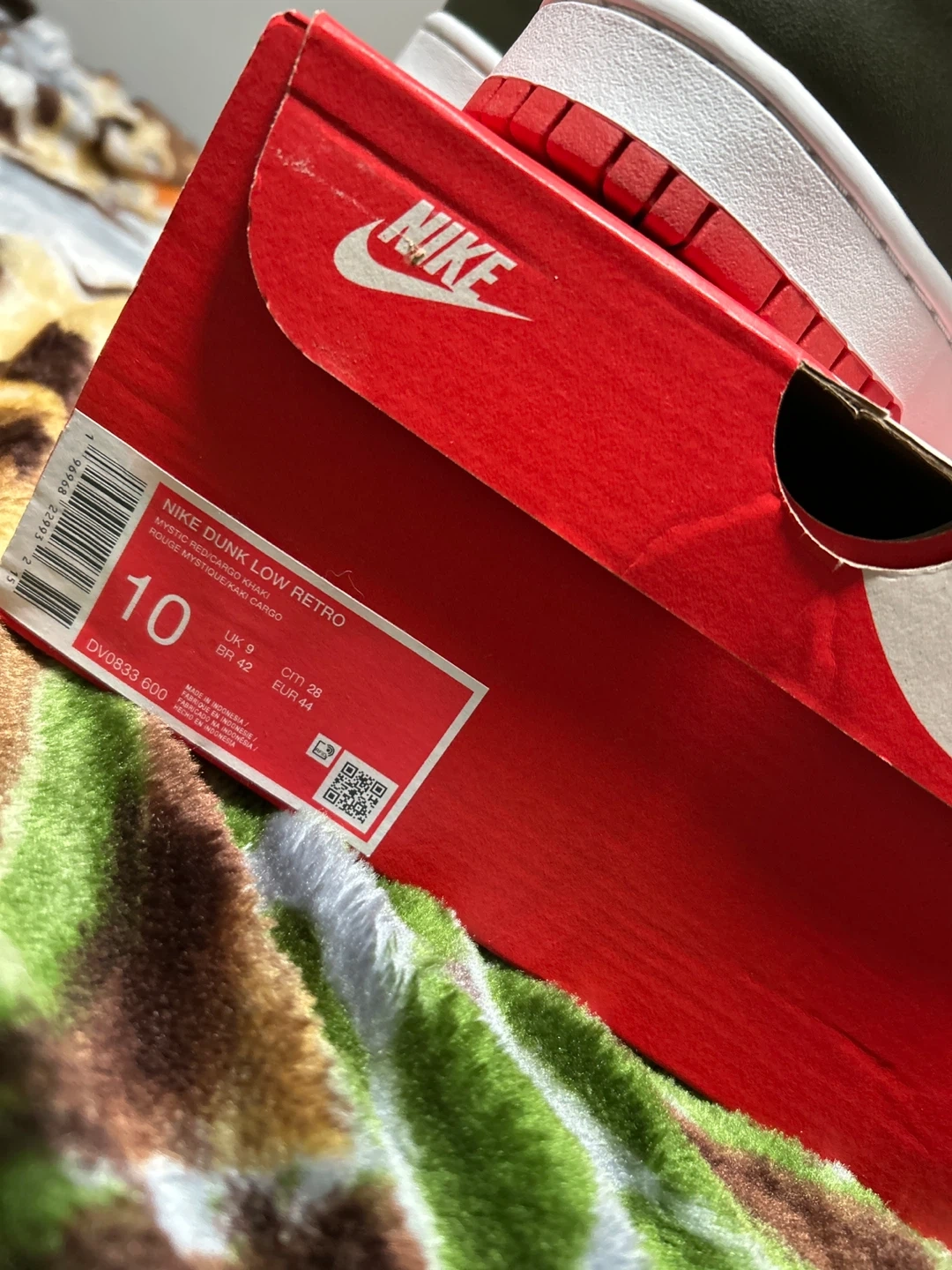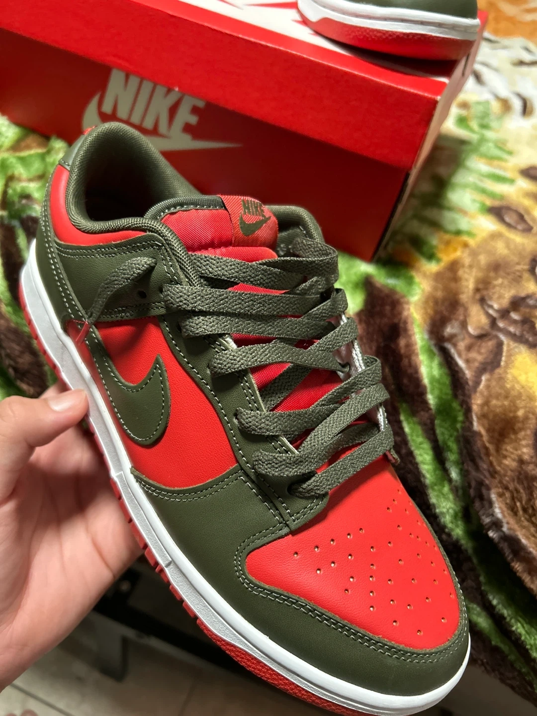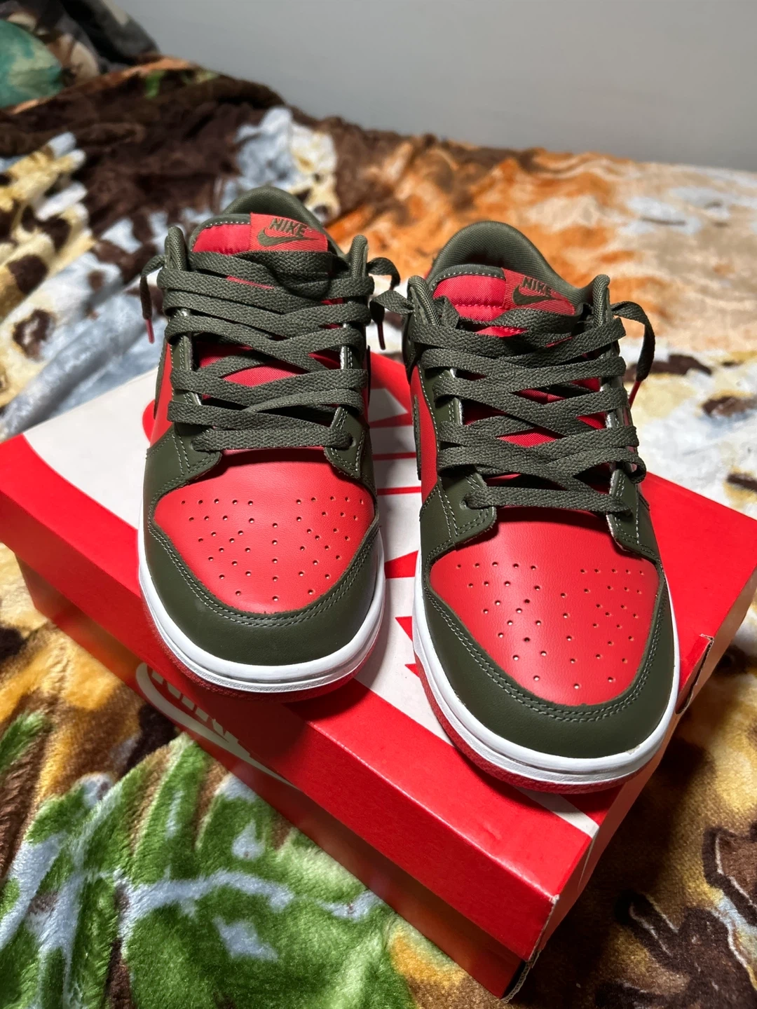 Authentic Nike Dunk Low Retro sneakers in a striking red and olive colorway. These size 10 shoes come with their original box. They're a classic low-top silhouette with a durable rubber sole.
