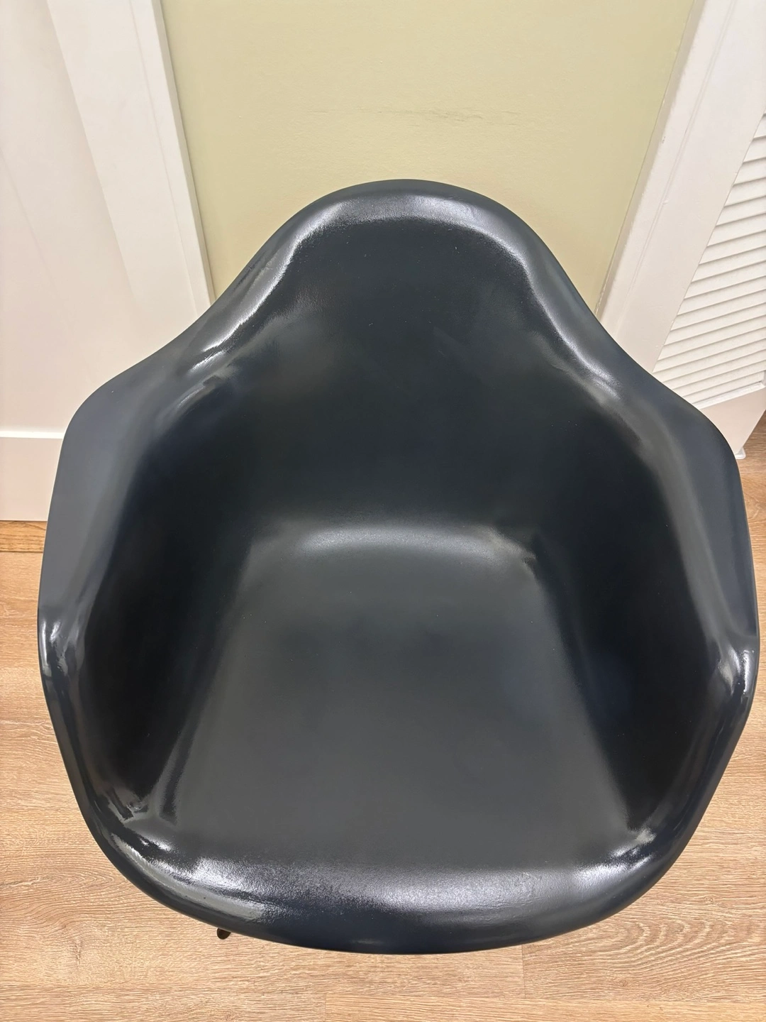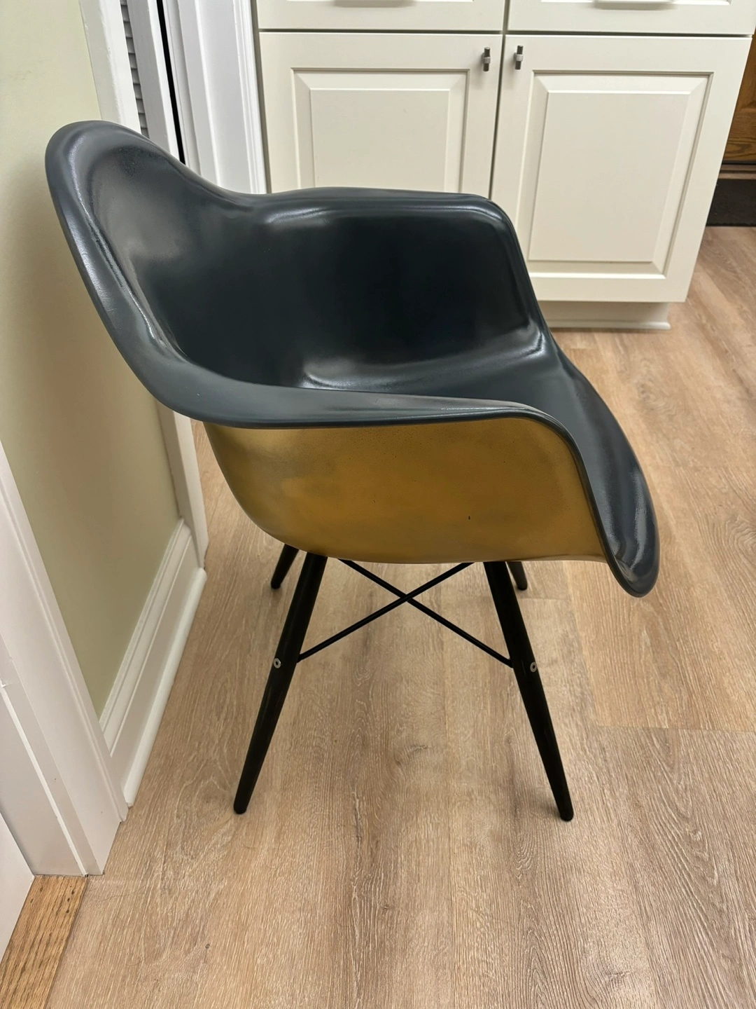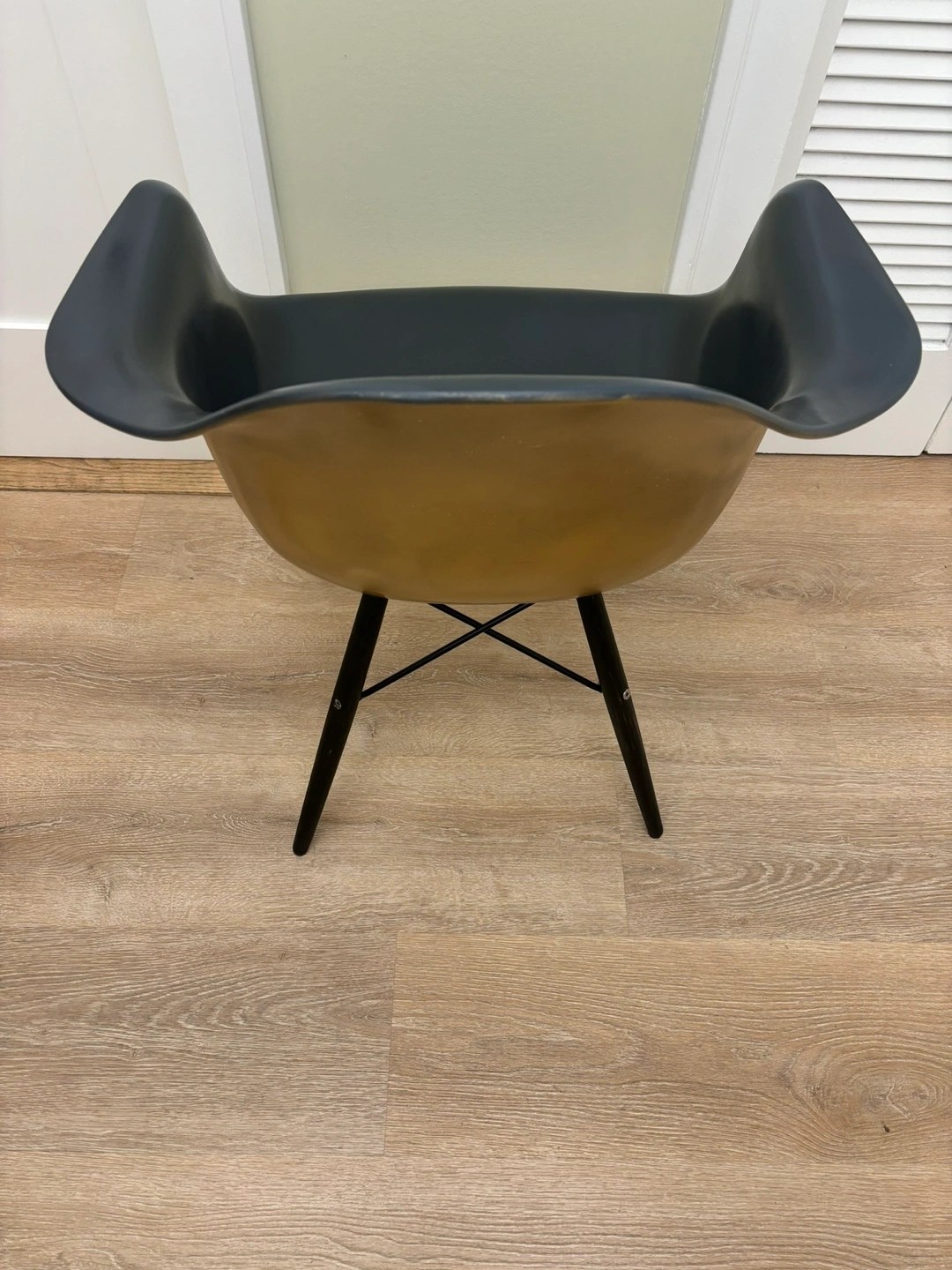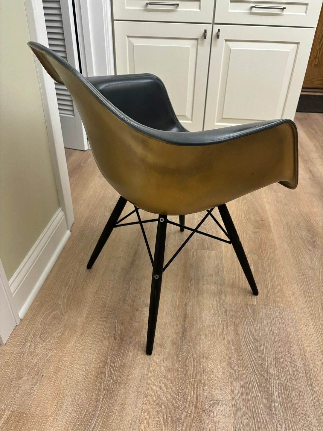 Selling a stylish Eames-style armchair! It features a unique charcoal and gold color combination that would add a touch of modern flair to any room. The chair is in good condition and ready for a new home