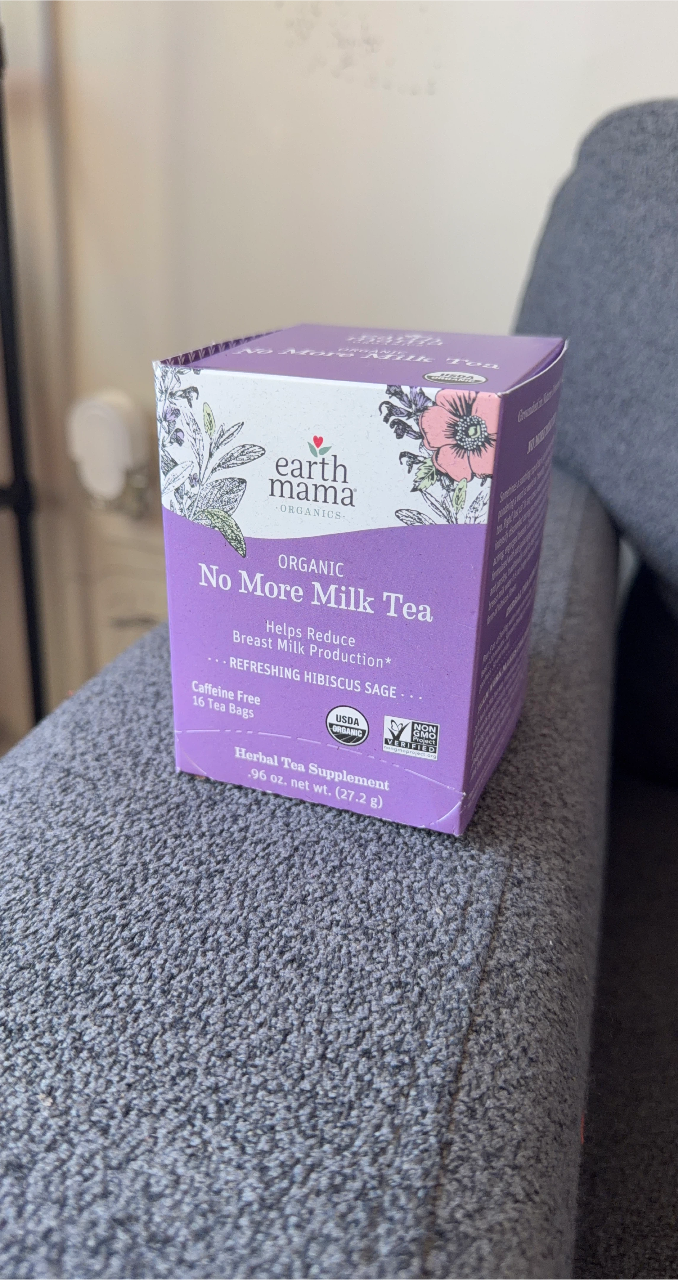 60Selling a box of Earth Mama Organics No More Milk Tea! This organic herbal tea supplement helps reduce breast milk production and has a refreshing hibiscus sage flavor. It is caffeine-free and contains 16 tea bags. Perfect for anyone looking for a natural way to manage milk production