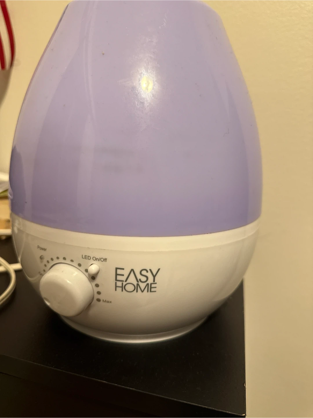 80Selling a used Easy Home humidifier. It features a power control knob and an LED on/off switch. It has a white and lavender color scheme.