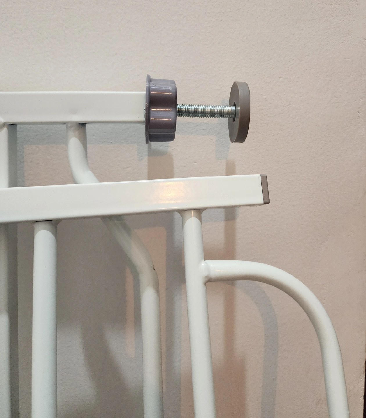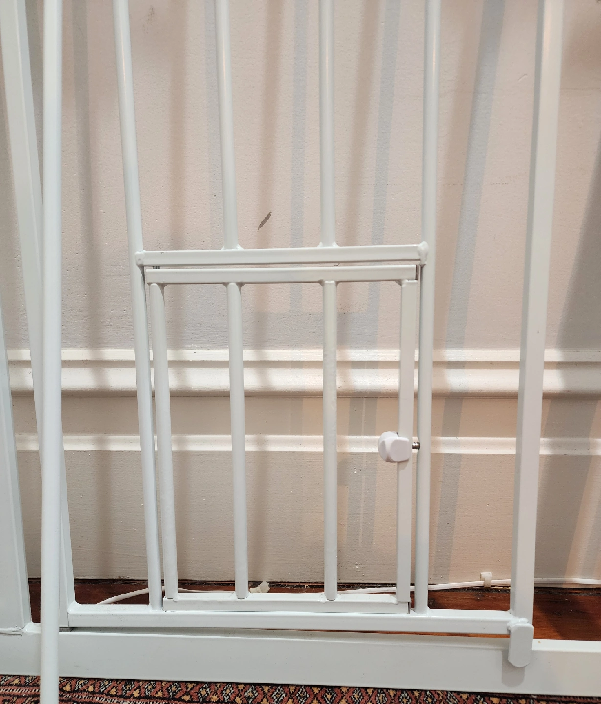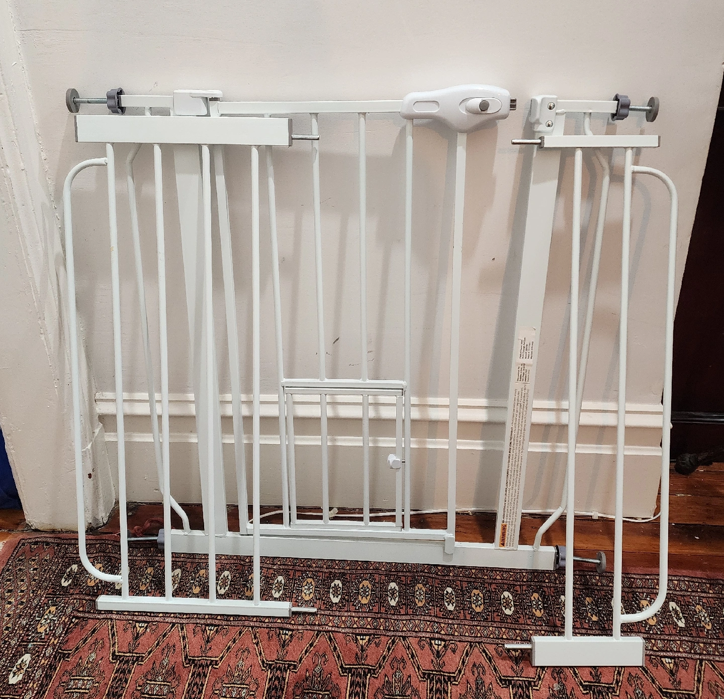 5Selling a baby/pup/cat gate in white with optional extensions. It's in good condition and ready to keep your little one safe! Includes a small usable gate perfect for cats or small dogs. Perfect for doorways or hallways.