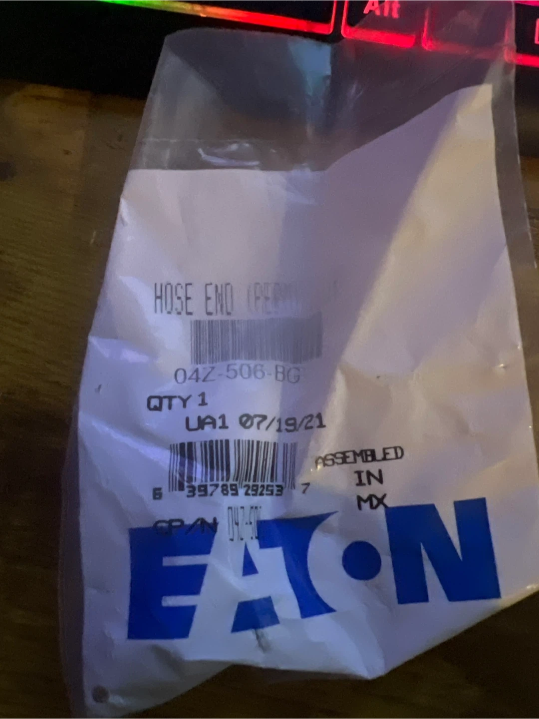 80Selling an Eaton hose end fitting. It's still in its original packaging. Assembled in MX. UA1 07/19/21. I have 6 of them