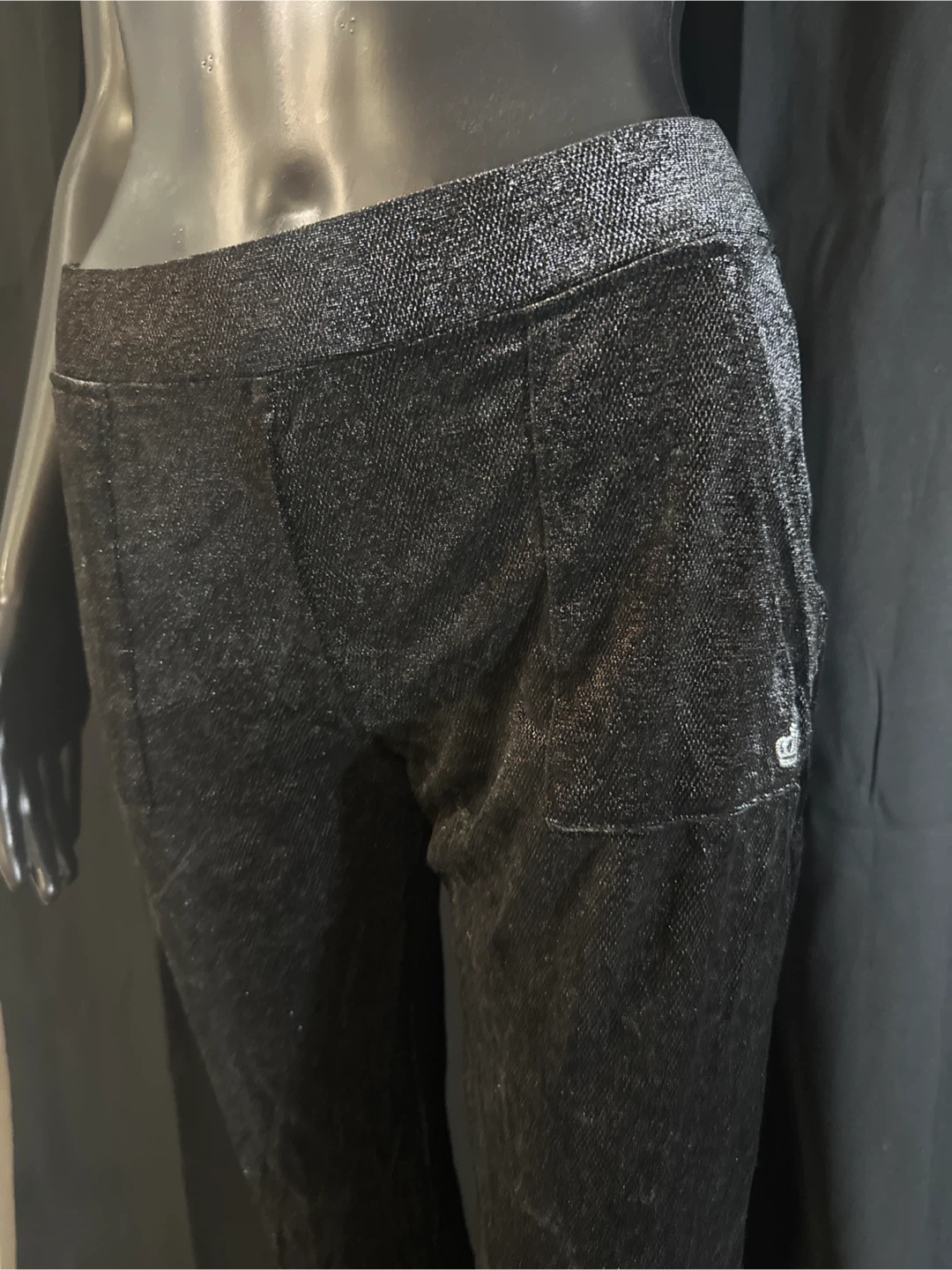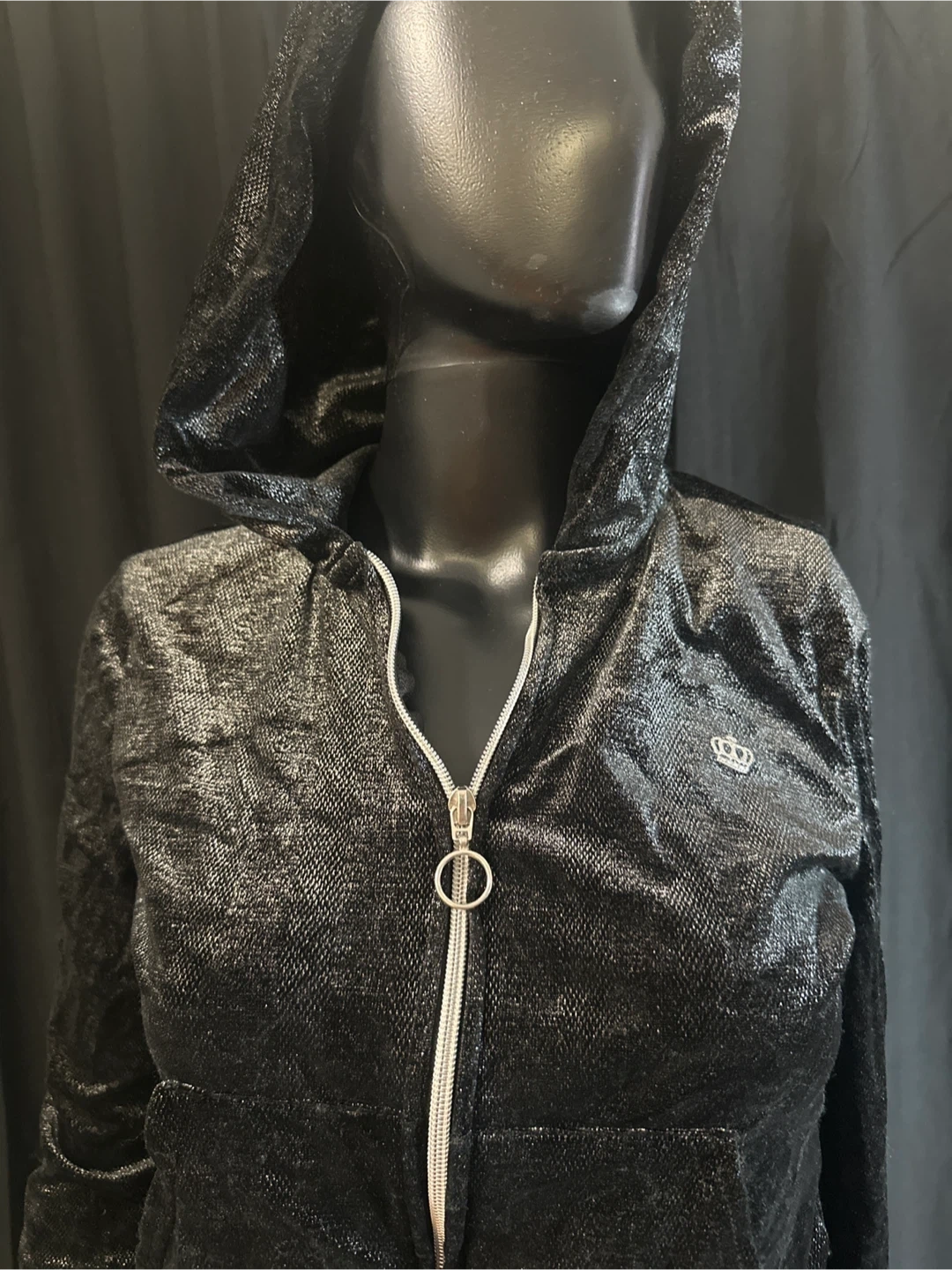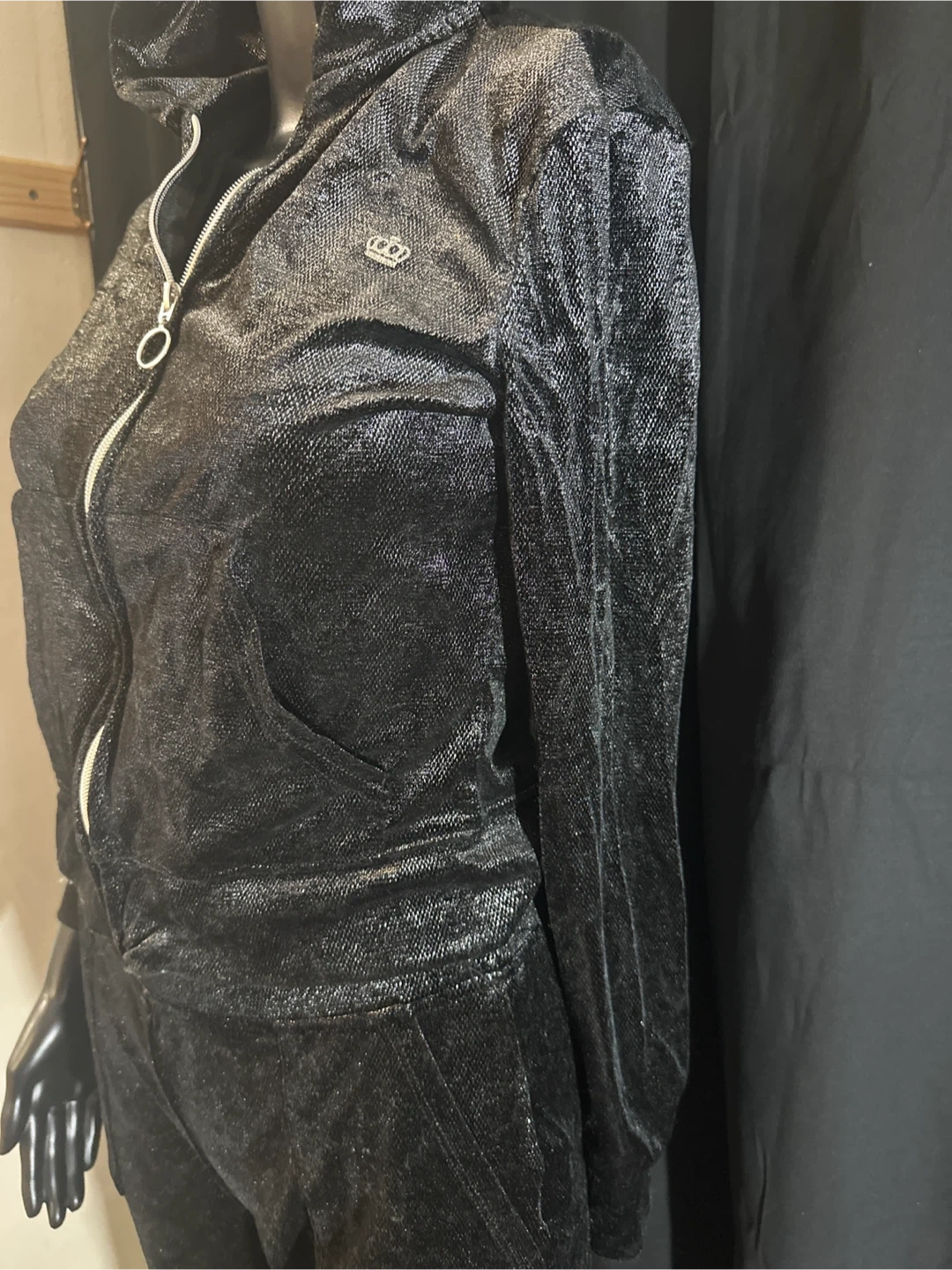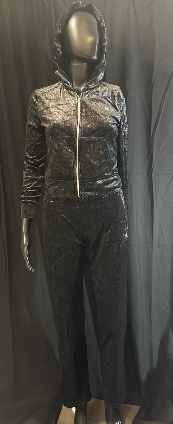 This Juicy Couture velour tracksuit set features a zip-up hoodie and matching pants. It's made of a soft, sparkly black velour material. Perfect for a comfortable and stylish lounge outfit!