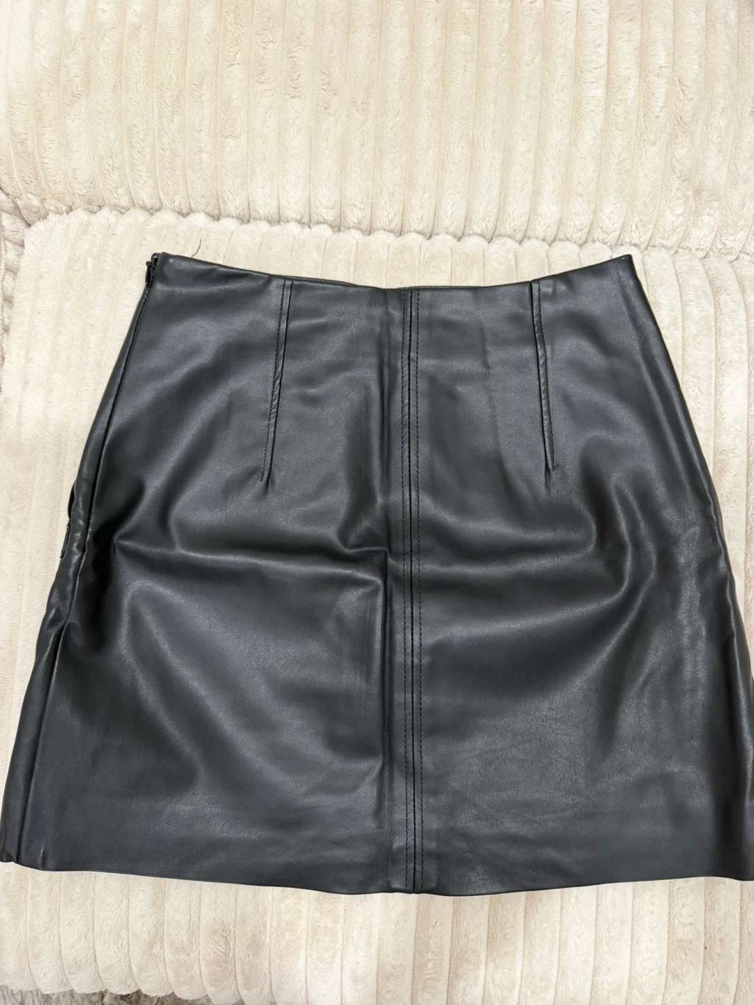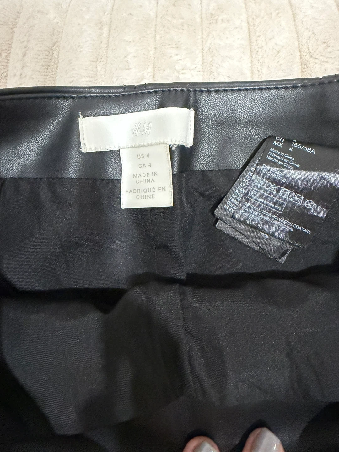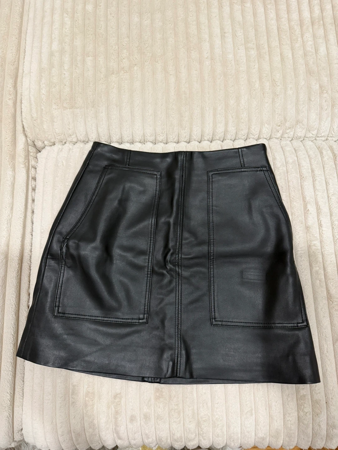 This H&M black faux leather skirt is a size US 4. It features a classic A-line silhouette with two front patch pockets.