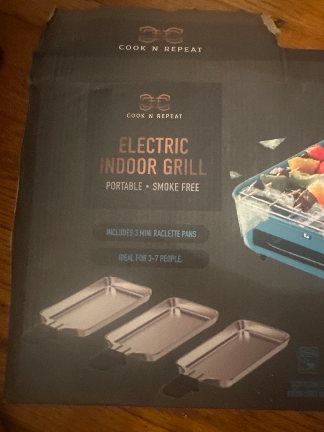 This is a Cook N Repeat Electric Indoor Grill. It's portable and smoke-free. Includes 3 mini raclette pans and is ideal for 3-7 people. Features a dual-purpose design with a warming pan and grill for versatility.