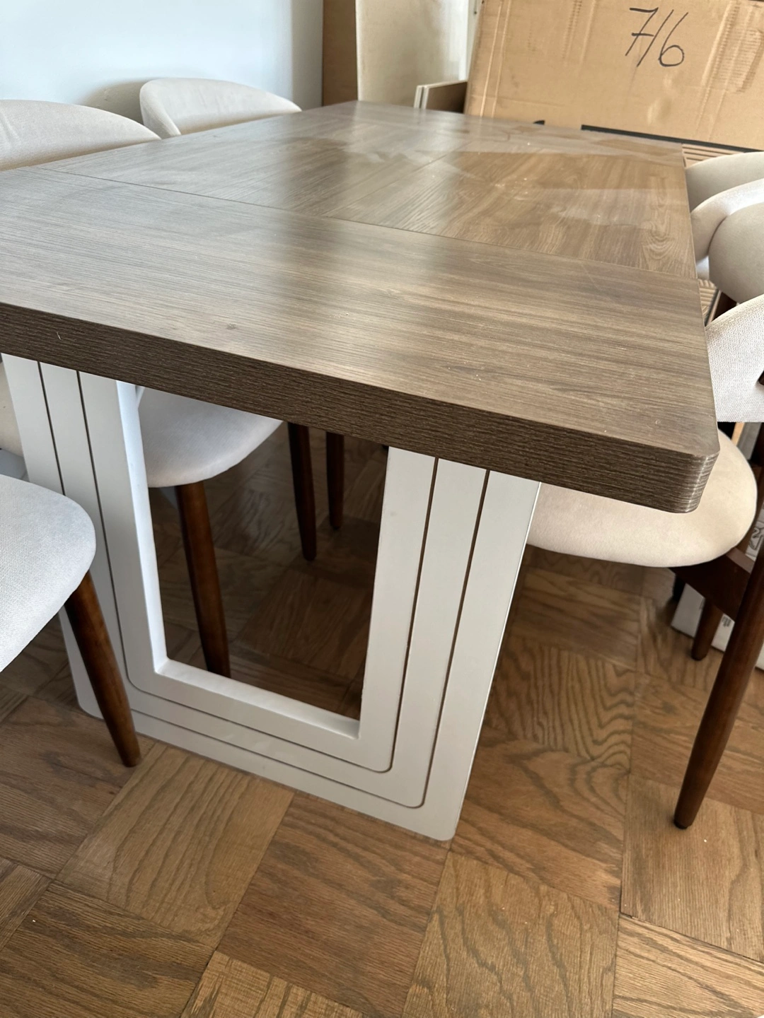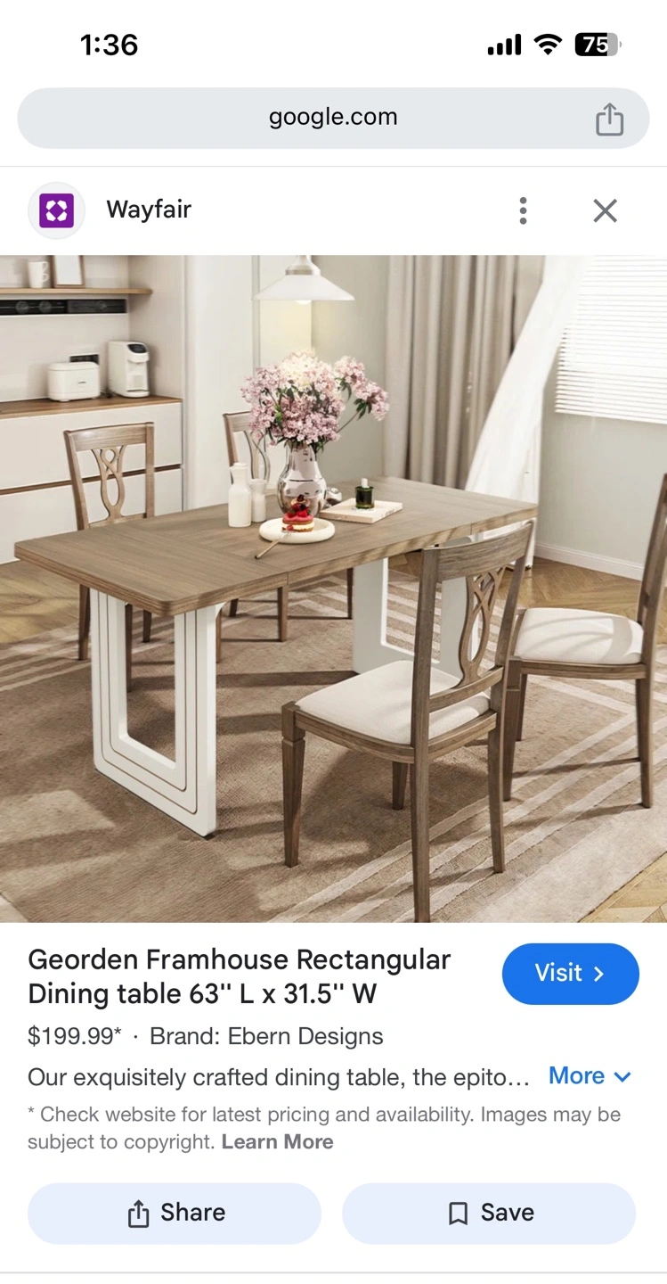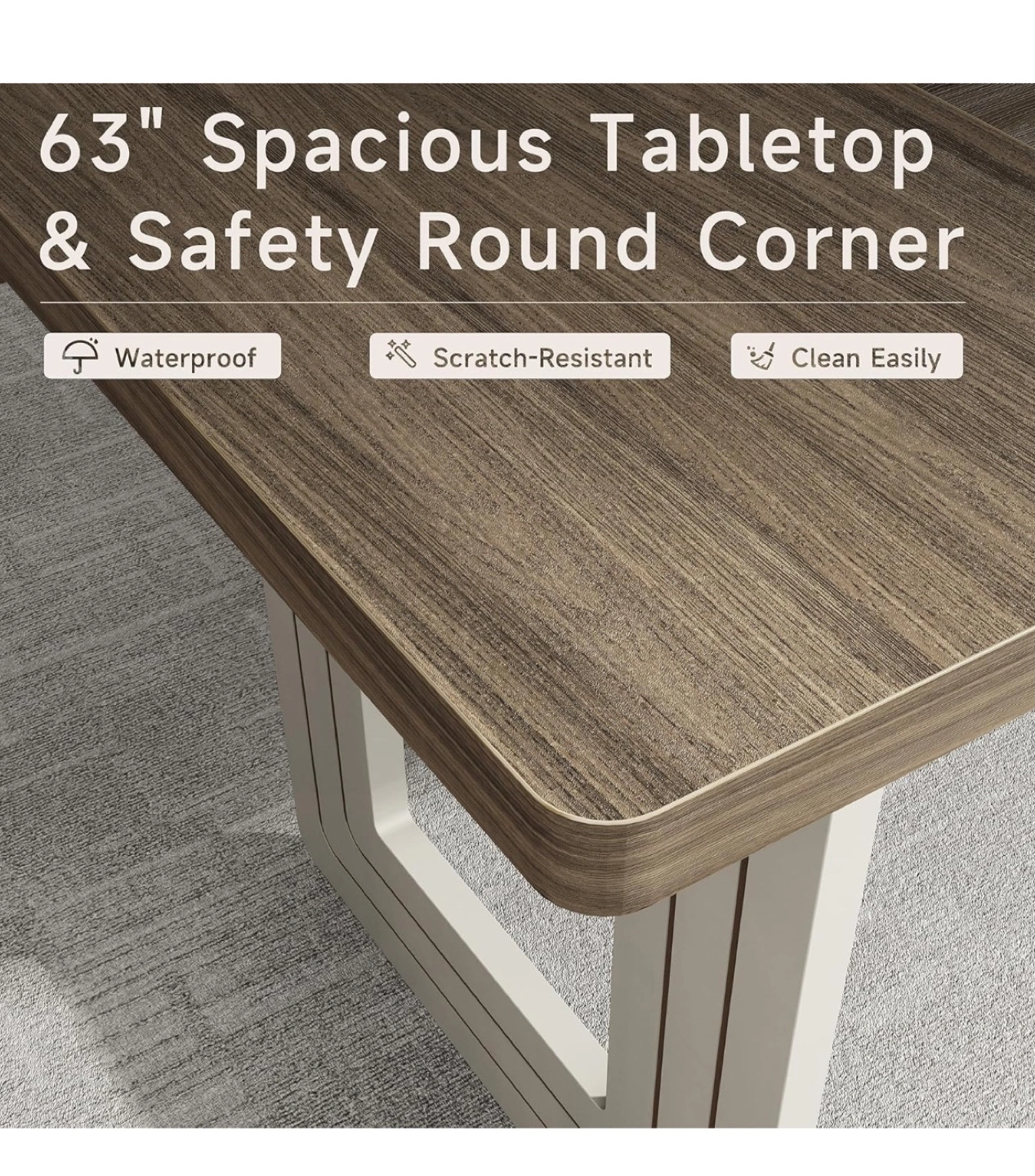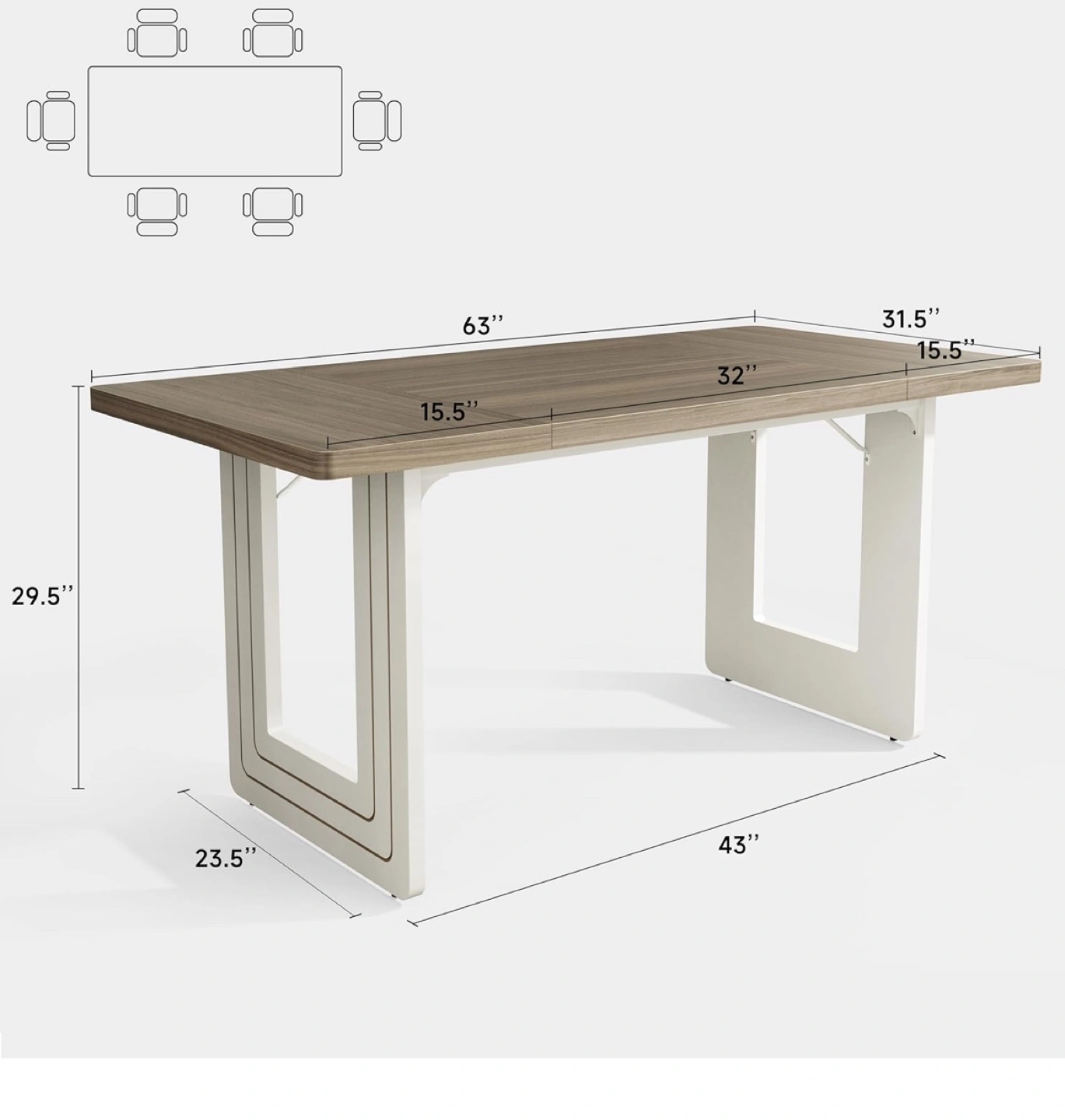 1063"L x 31.5"W rectangular dining table. Waterproof, scratch-resistant, and easy to clean. Features a modern farmhouse style with a gray wood top and white base. Great for any dining room. No chairs included Cash/Venmo/Zelle and pick up only