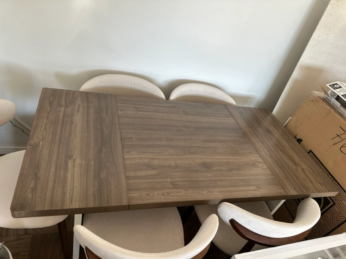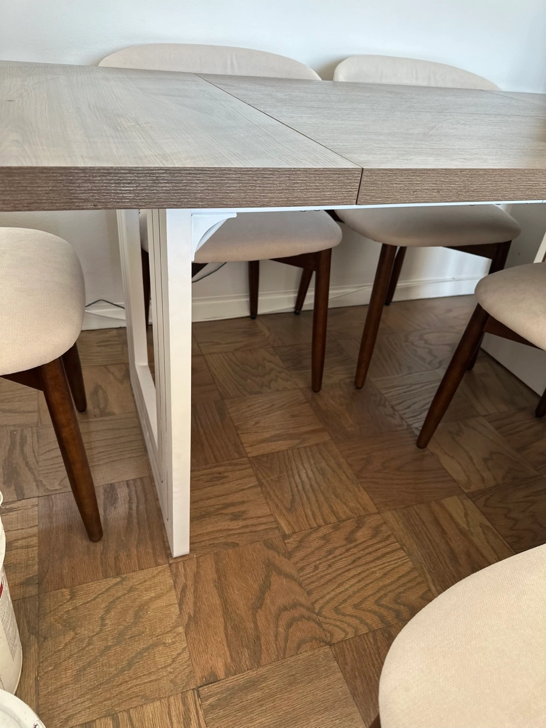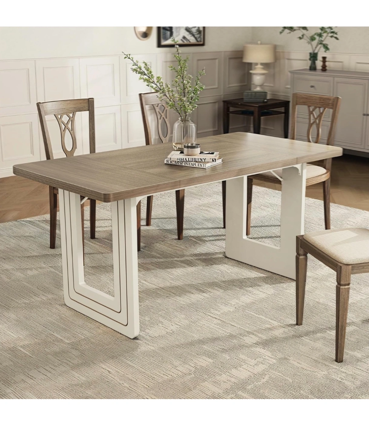 1063"L x 31.5"W rectangular dining table. Waterproof, scratch-resistant, and easy to clean. Features a modern farmhouse style with a gray wood top and white base. Great for any dining room. No chairs included Cash/Venmo/Zelle and pick up only