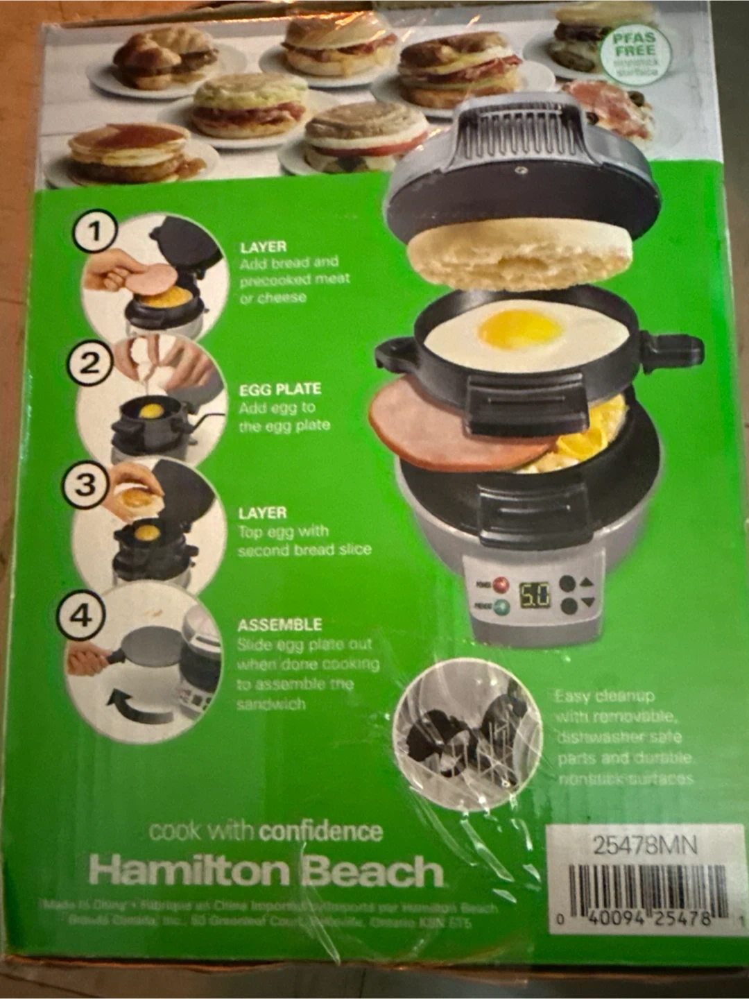 Make hot breakfast sandwiches in just 5 minutes. It's easy to use with simple steps. Dishwasher safe parts for easy cleanup. Nonstick surfaces.