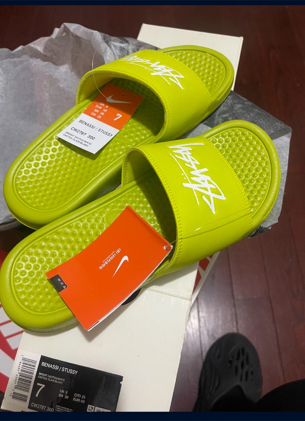 Selling a pair of Nike x Stussy Benassi slides in a vibrant bright cactus color! They are a US size 7. The model number is CW2787 300. These slides are super comfy and perfect for everyday wear!