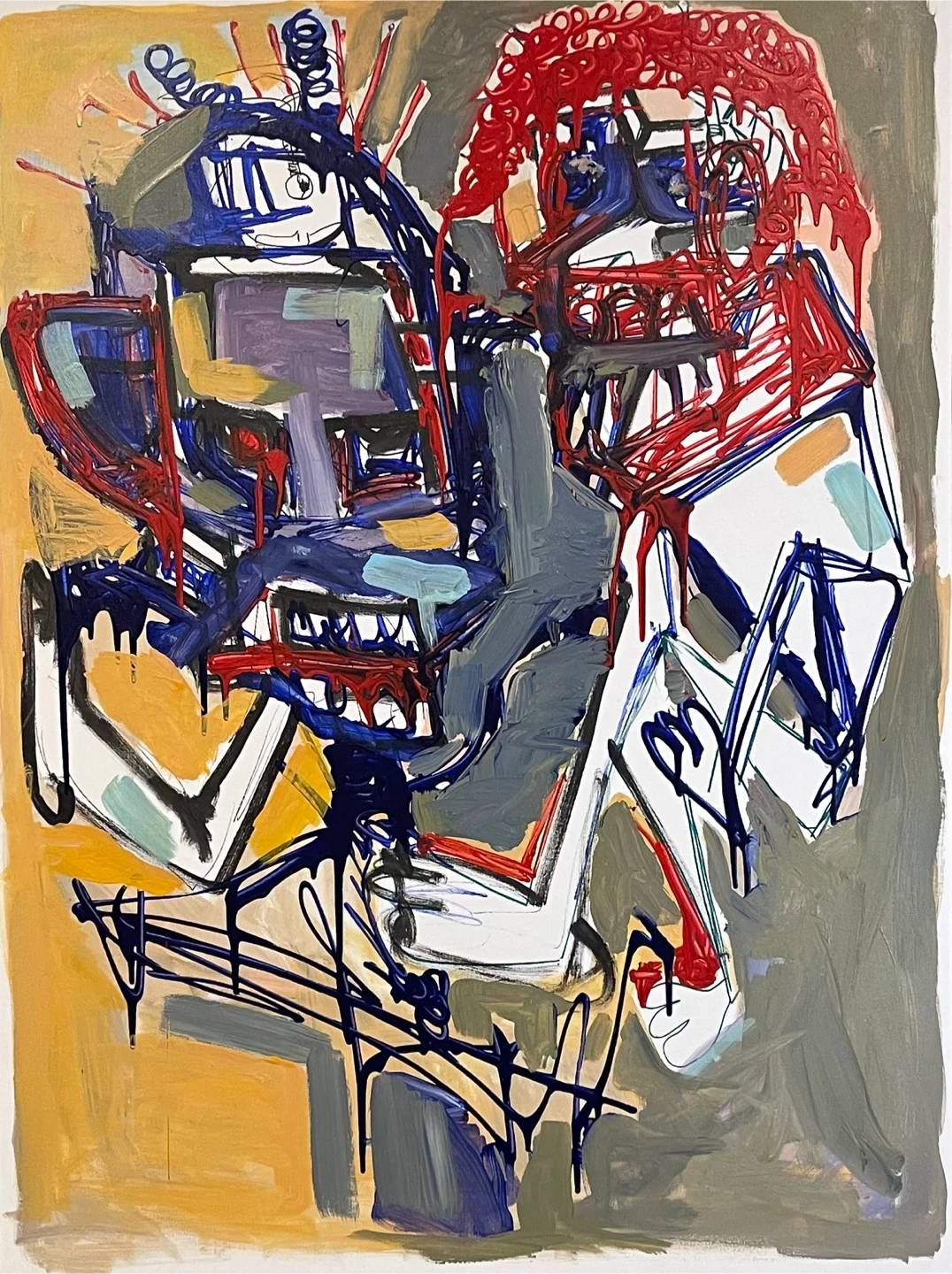 This is an abstract expressionist painting with bold colors and dynamic lines. The artwork features a chaotic yet deliberate composition with layers of paint, drips, and energetic brushstrokes. It's a large-scale piece that commands attention in any space.