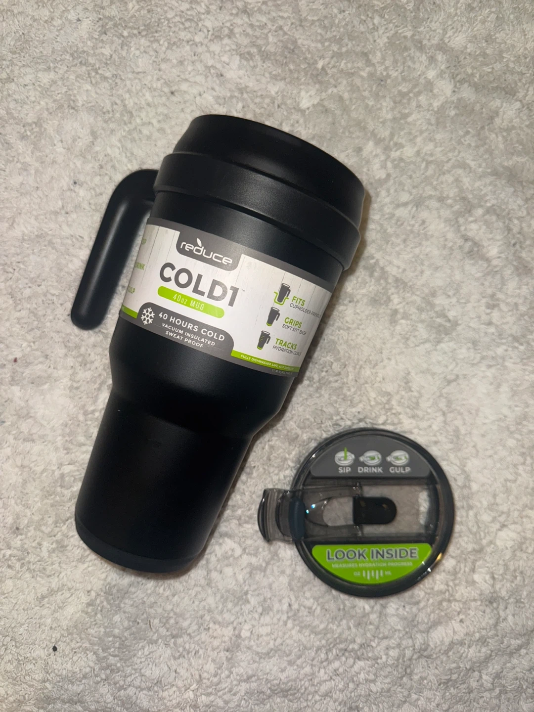 Reduce COLDI 40 oz insulated mug. Keeps drinks cold for 40 hours. Vacuum insulated and sweat proof. Includes lid with sip, drink, and gulp options. Measures hydration progress.