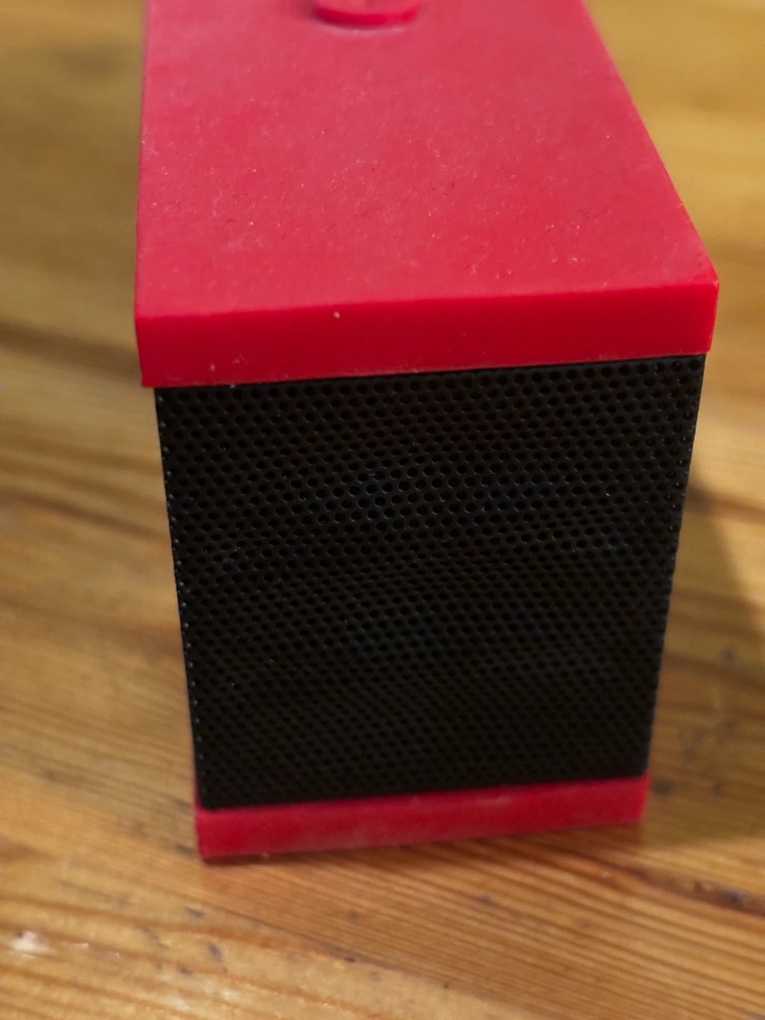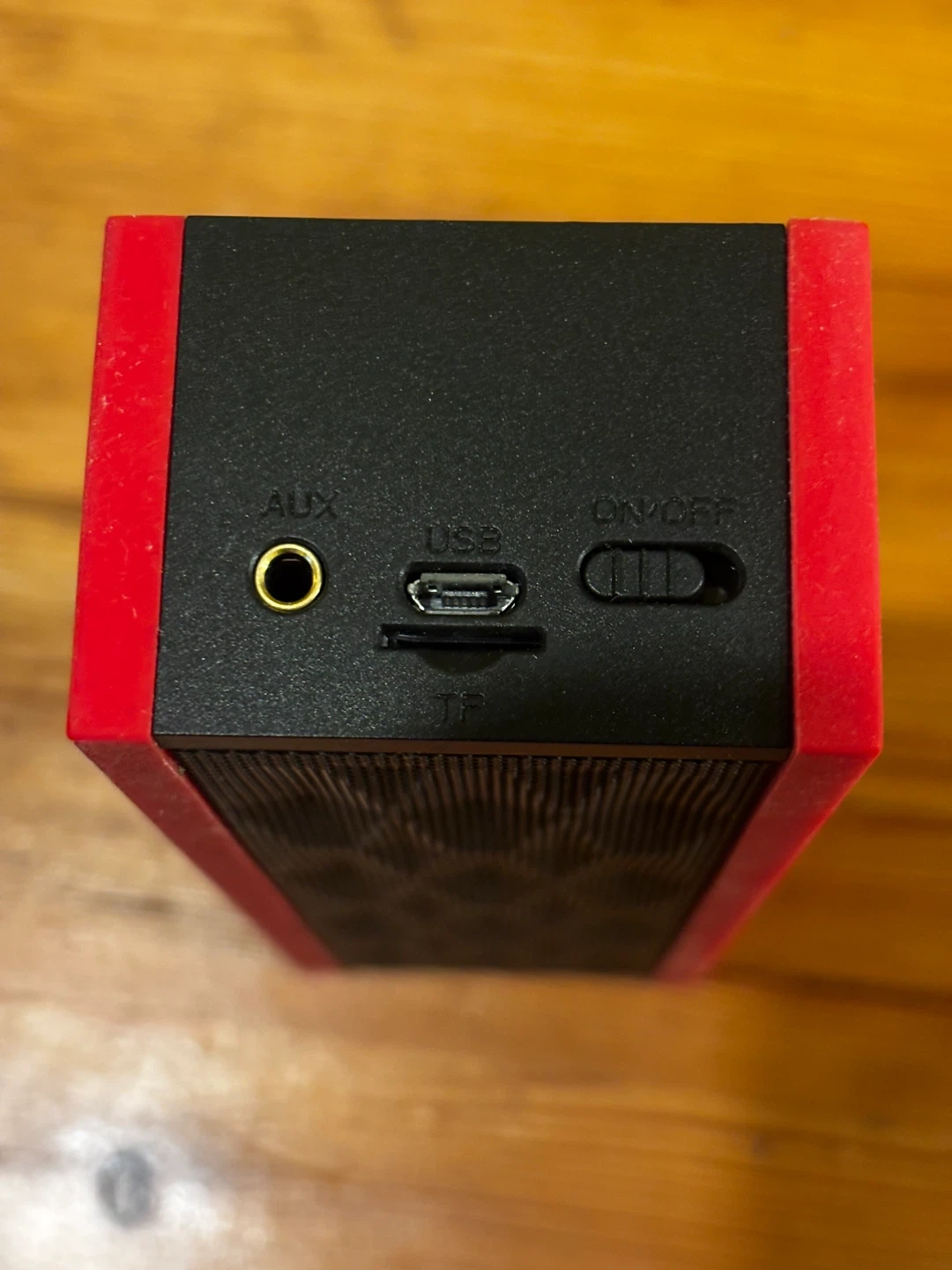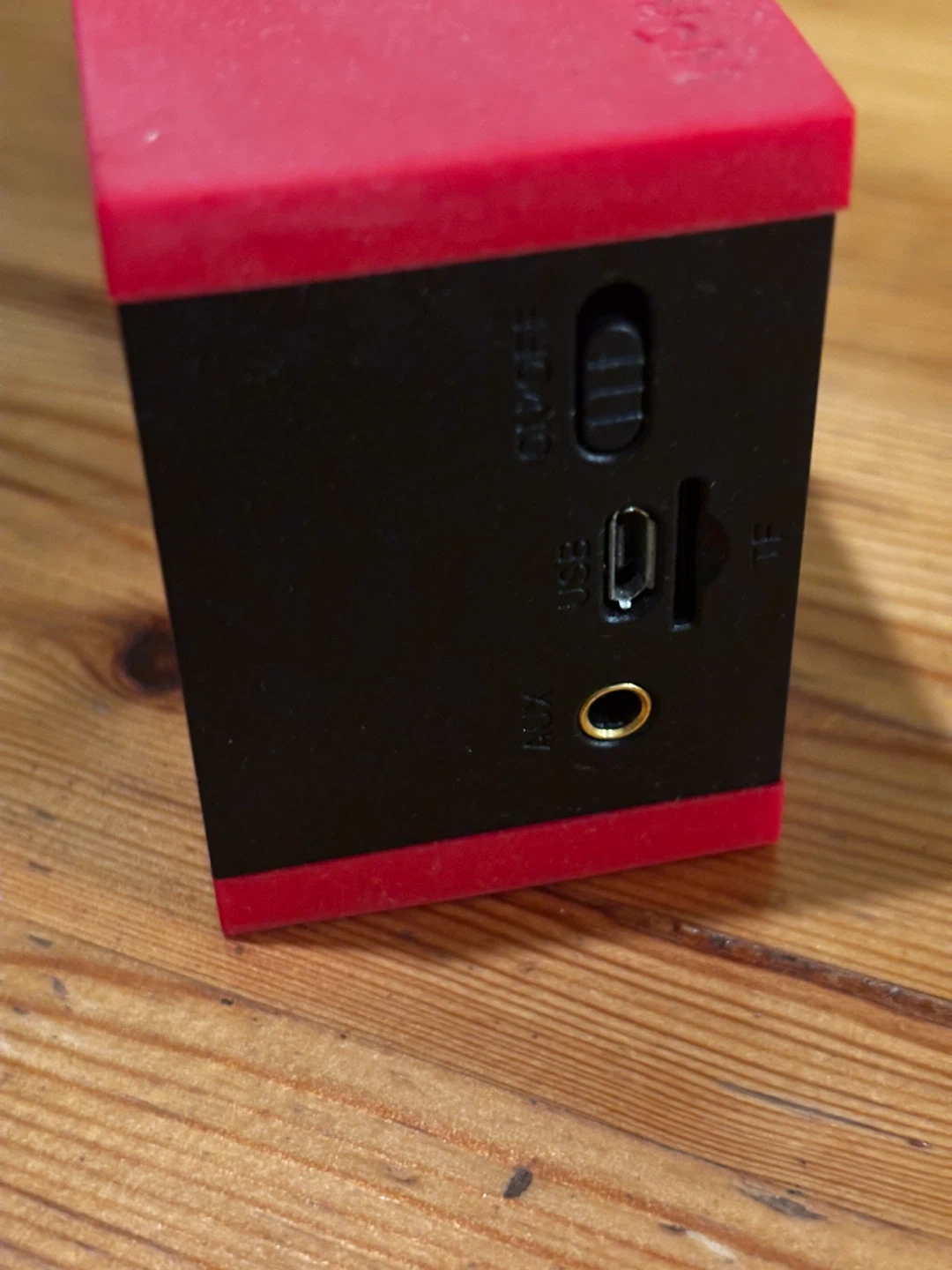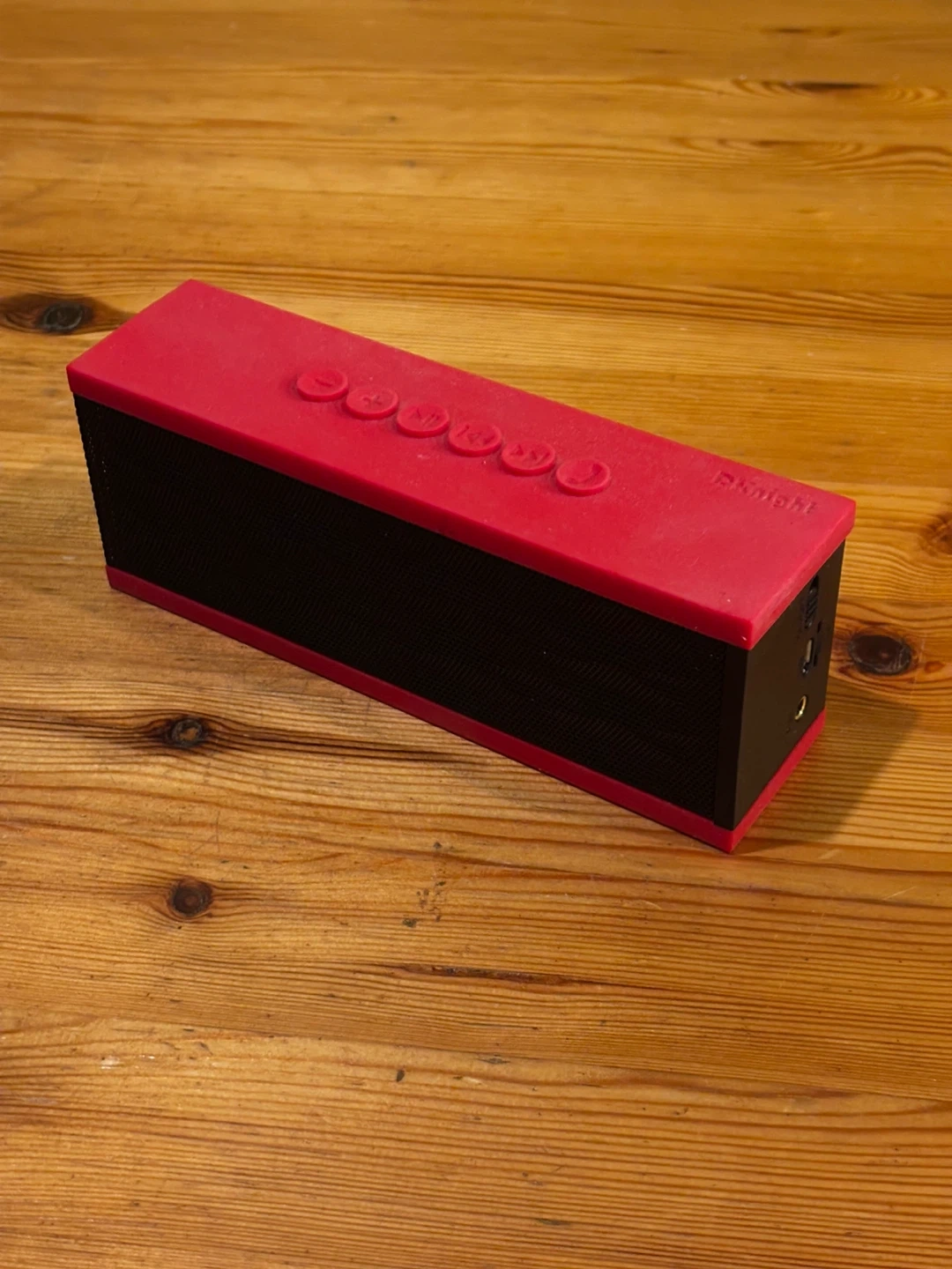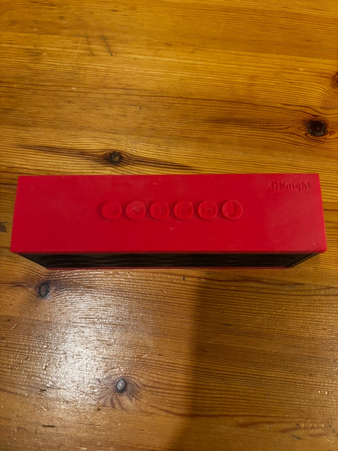 This is a DKnight Magicbox portable Bluetooth speaker. It's red and black with speaker grille details. It has buttons on top and ports on the side for USB and SD card input. 6w-1.5d-2”h