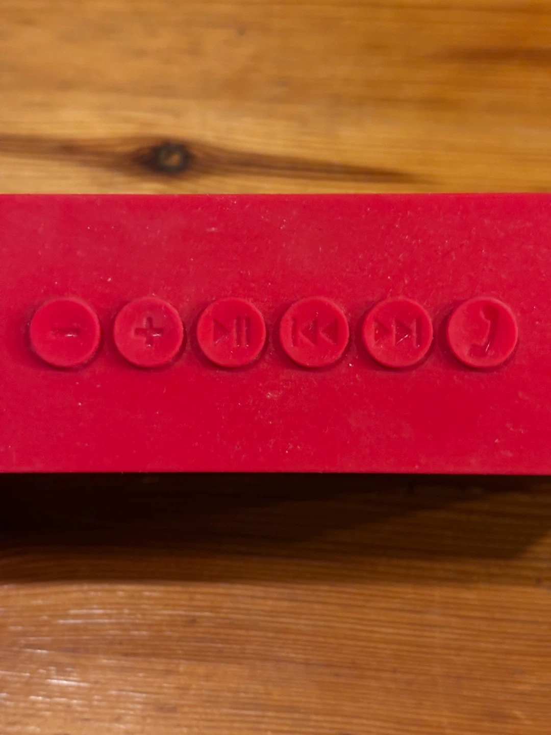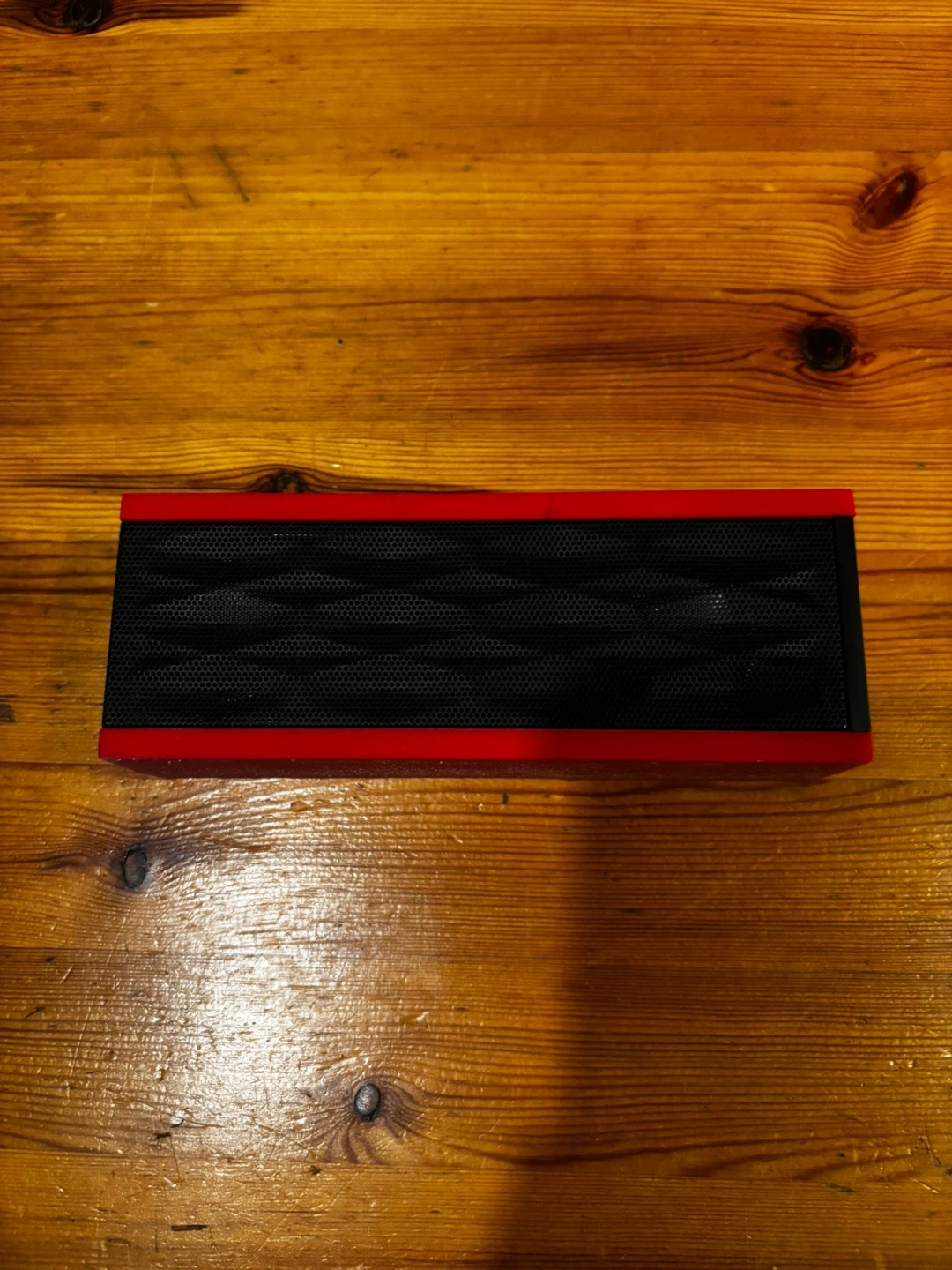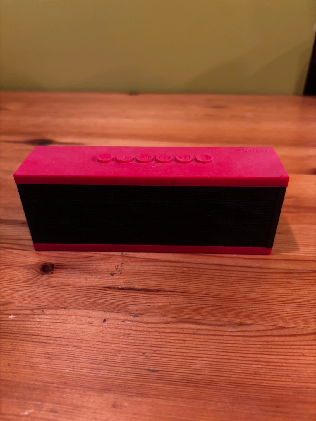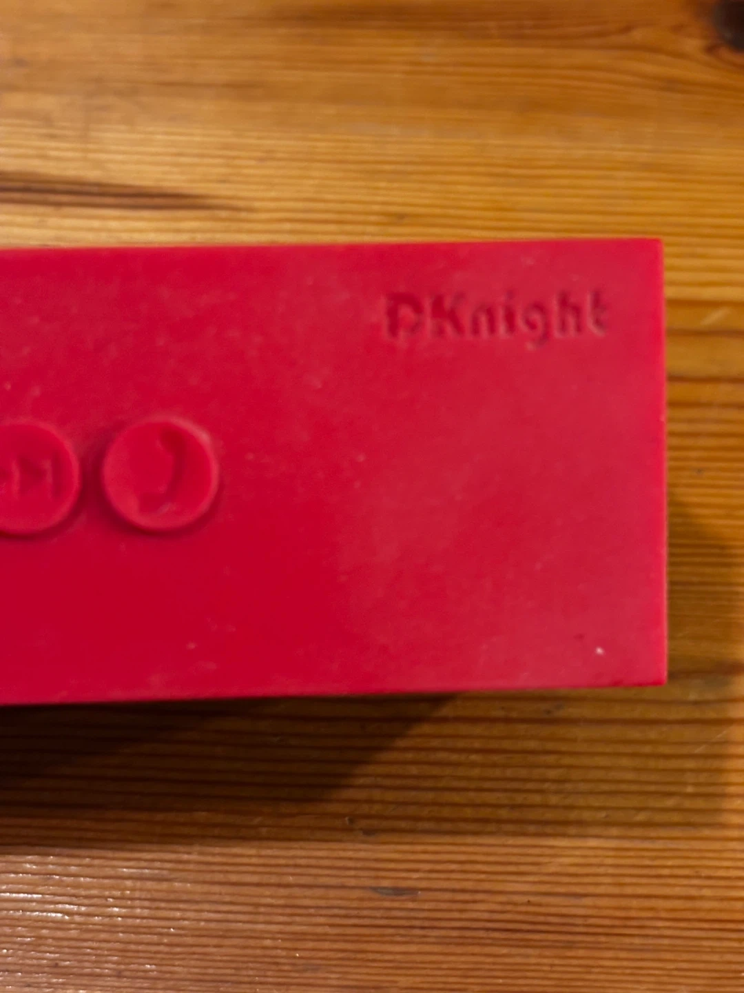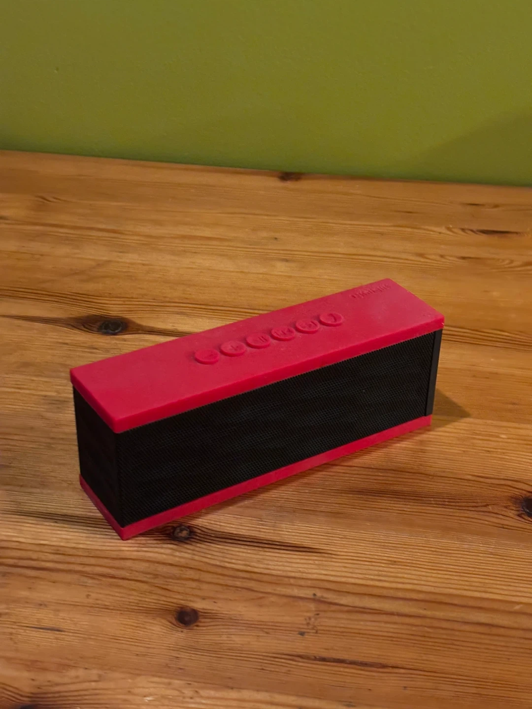 This is a DKnight Magicbox portable Bluetooth speaker. It's red and black with speaker grille details. It has buttons on top and ports on the side for USB and SD card input. 6w-1.5d-2”h