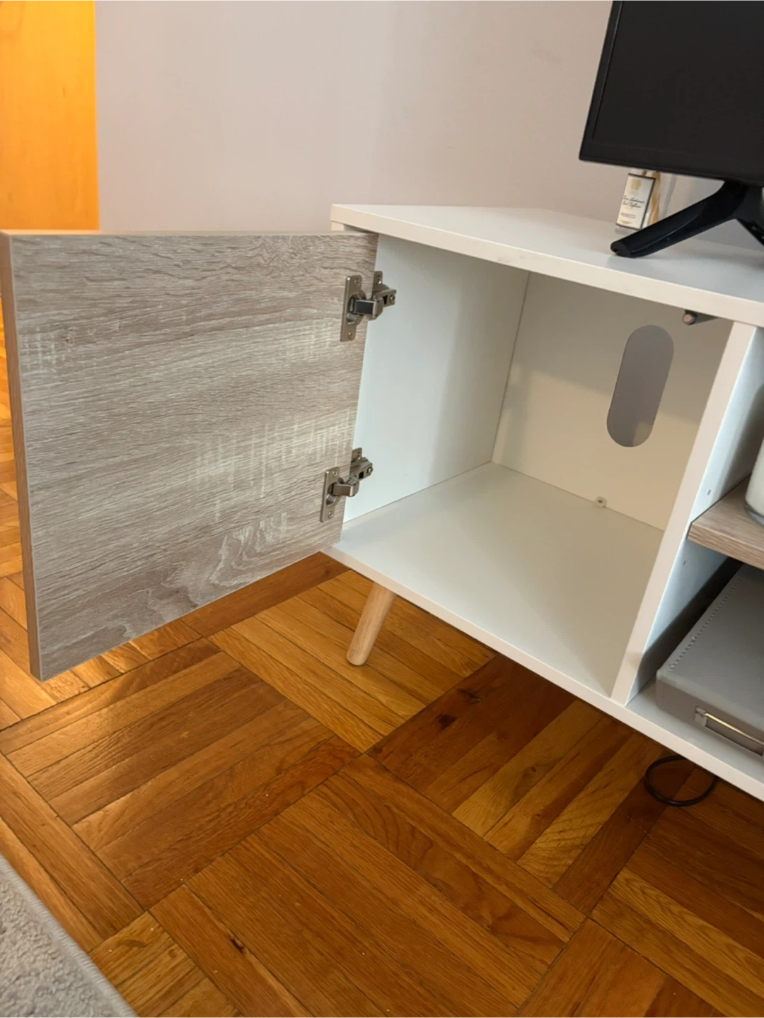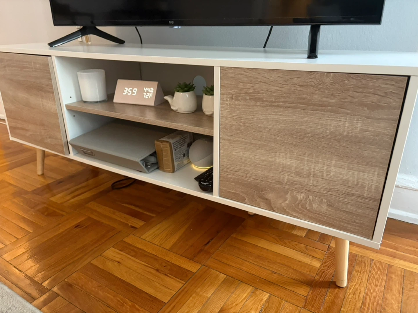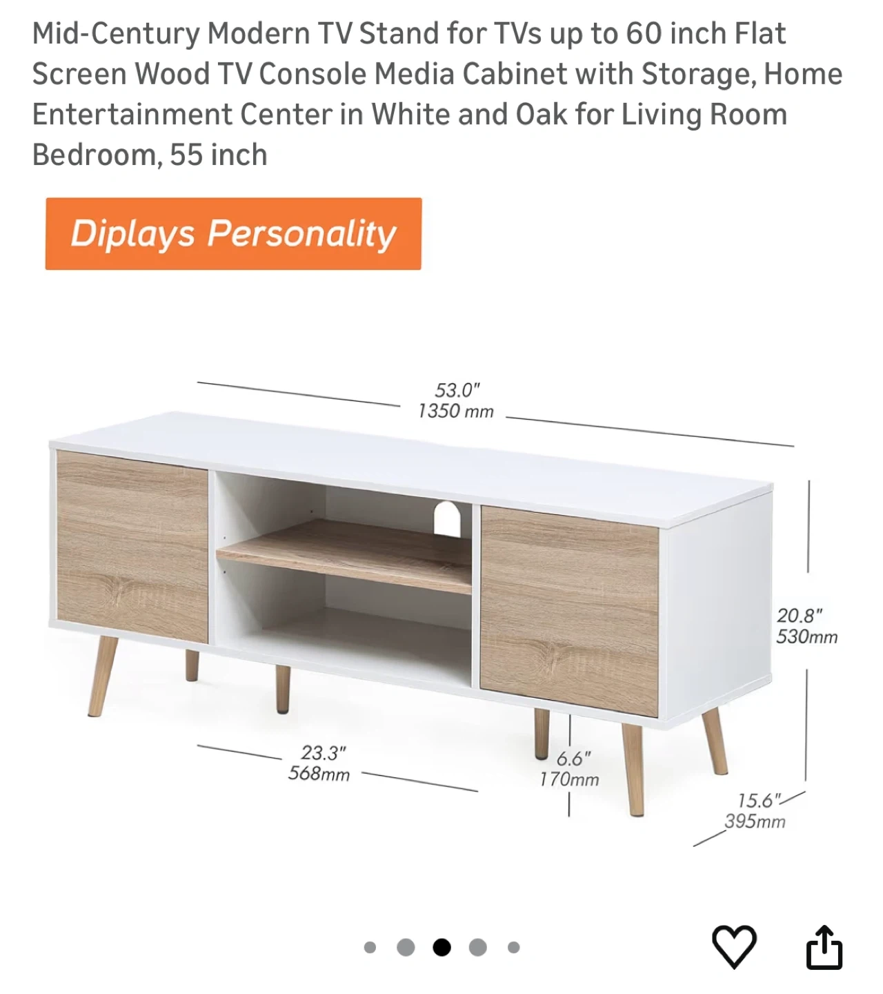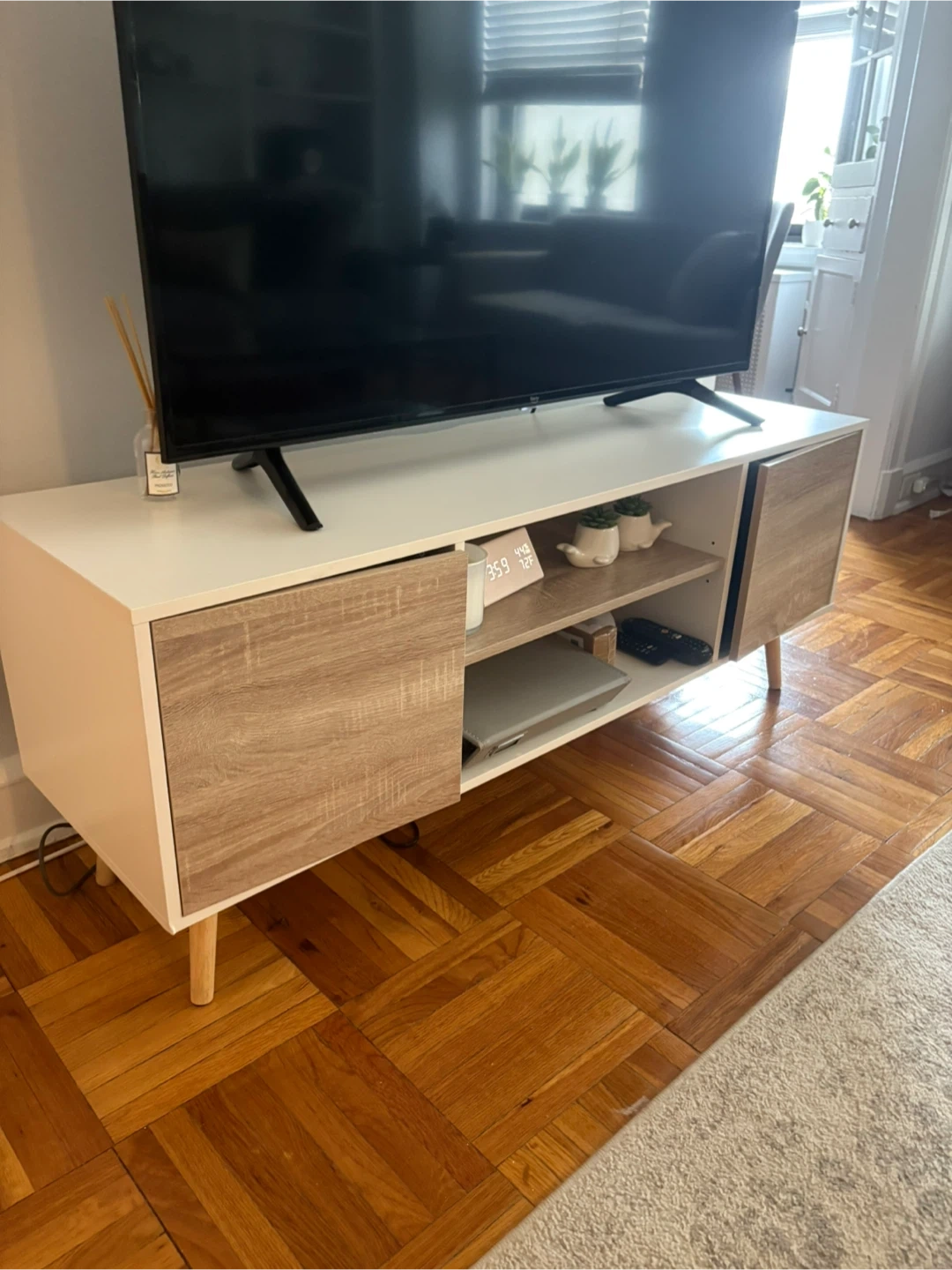 Selling a mid-century modern TV stand! It's perfect for TVs up to 60 inches. The TV console has a clean white finish with oak accents on the doors. It offers plenty of storage with its media cabinet design. Dimensions are 53 inches wide, 20.8 inches high, and 23.3 inches deep.