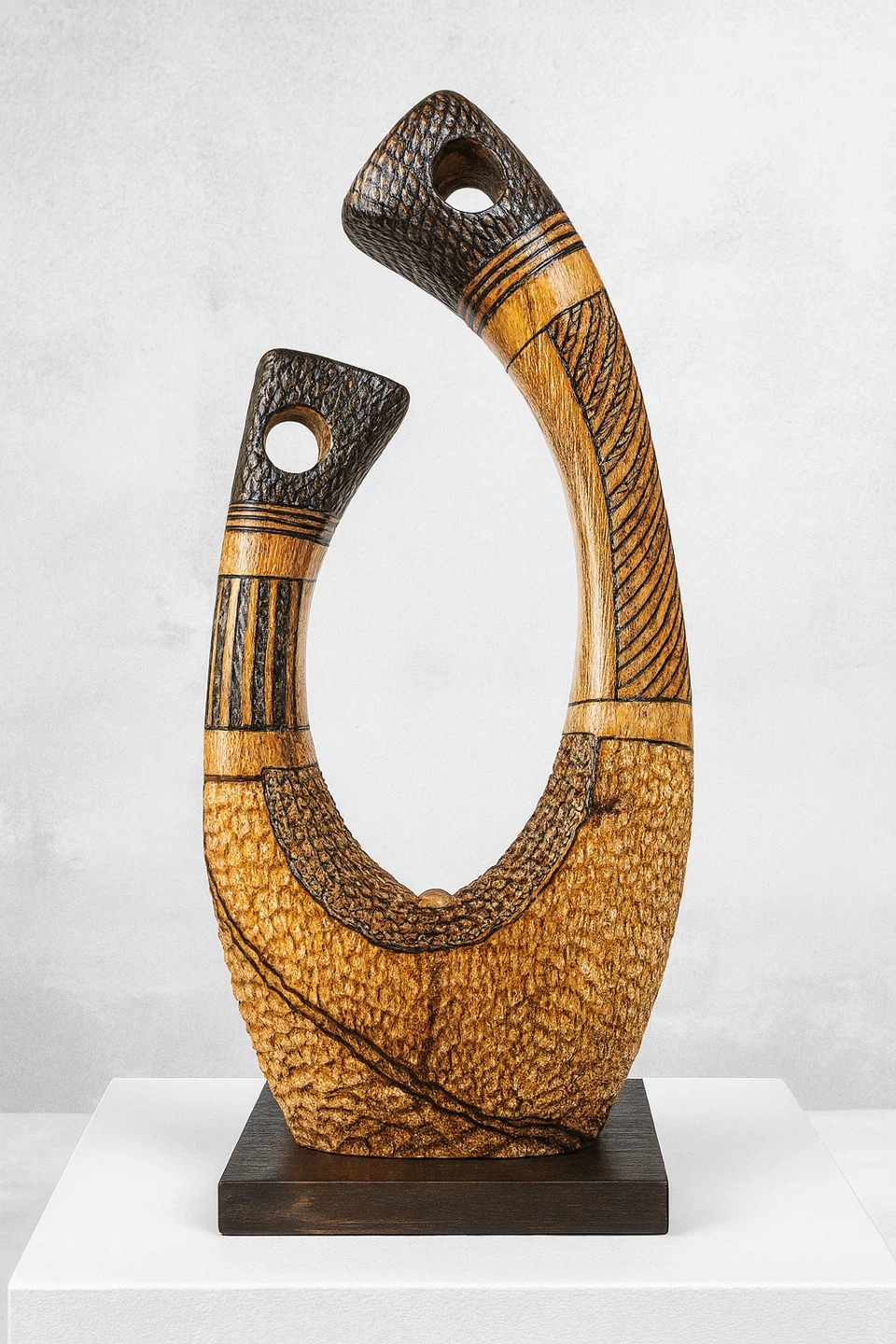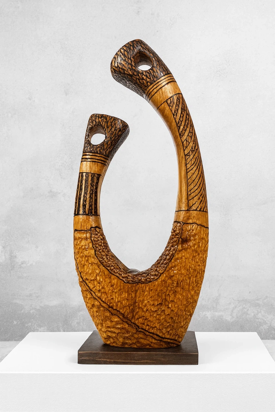Eclipsed in Union is a one-of-a-kind reclaimed wood sculpture that speaks to the beauty of connection and the balance between individuality and unity. Hand-carved in the signature form-and-void style of AbstraMotifs, this piece blends smooth, organic curves with textured surfaces, inviting the eye to move in a continuous loop of discovery. Crafted from sustainably sourced reclaimed hardwood, the sculpture features two upward-reaching forms joined in an embrace of shared space, each retaining its own character while harmonizing with the other. The carved voids symbolize openness and trust, while the intricate surface detailing reflects the depth that comes from a life fully lived. Whether displayed as a centerpiece in a modern home, an office, or an art collection, Eclipsed in Union is a statement of resilience, sustainability, and the timeless elegance of handcrafted design. Features: One-of-a-kind — no reproductions made Hand-carved from reclaimed hardwood in Chicago, IL Textured and smooth contrast finish for visual and tactile depth Protective eco-conscious stain and lacquer finish Dimensions: [20”H x 10”W x 4”D] Weight: [15 lb.] Ideal for display on shelves, mantels, pedestals, or gallery walls