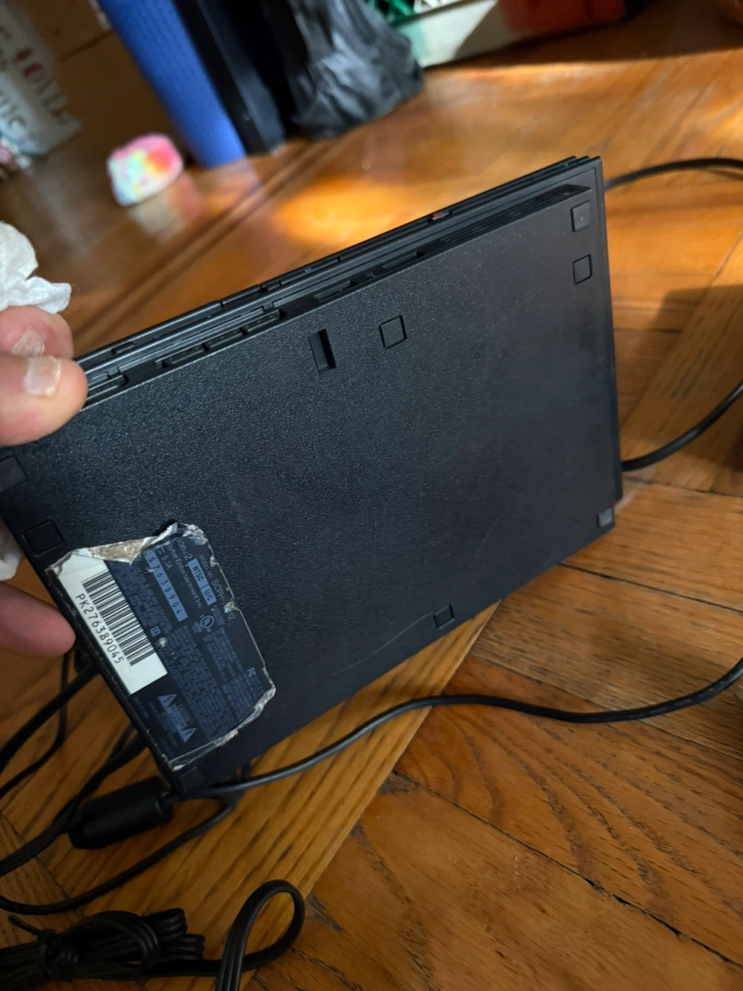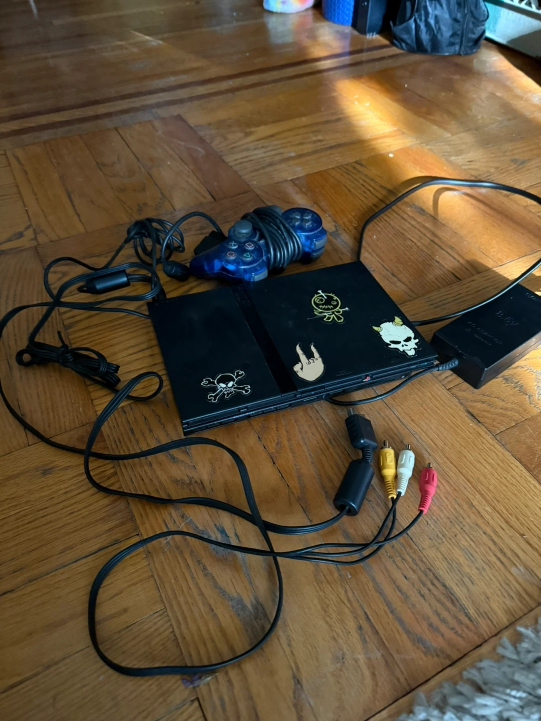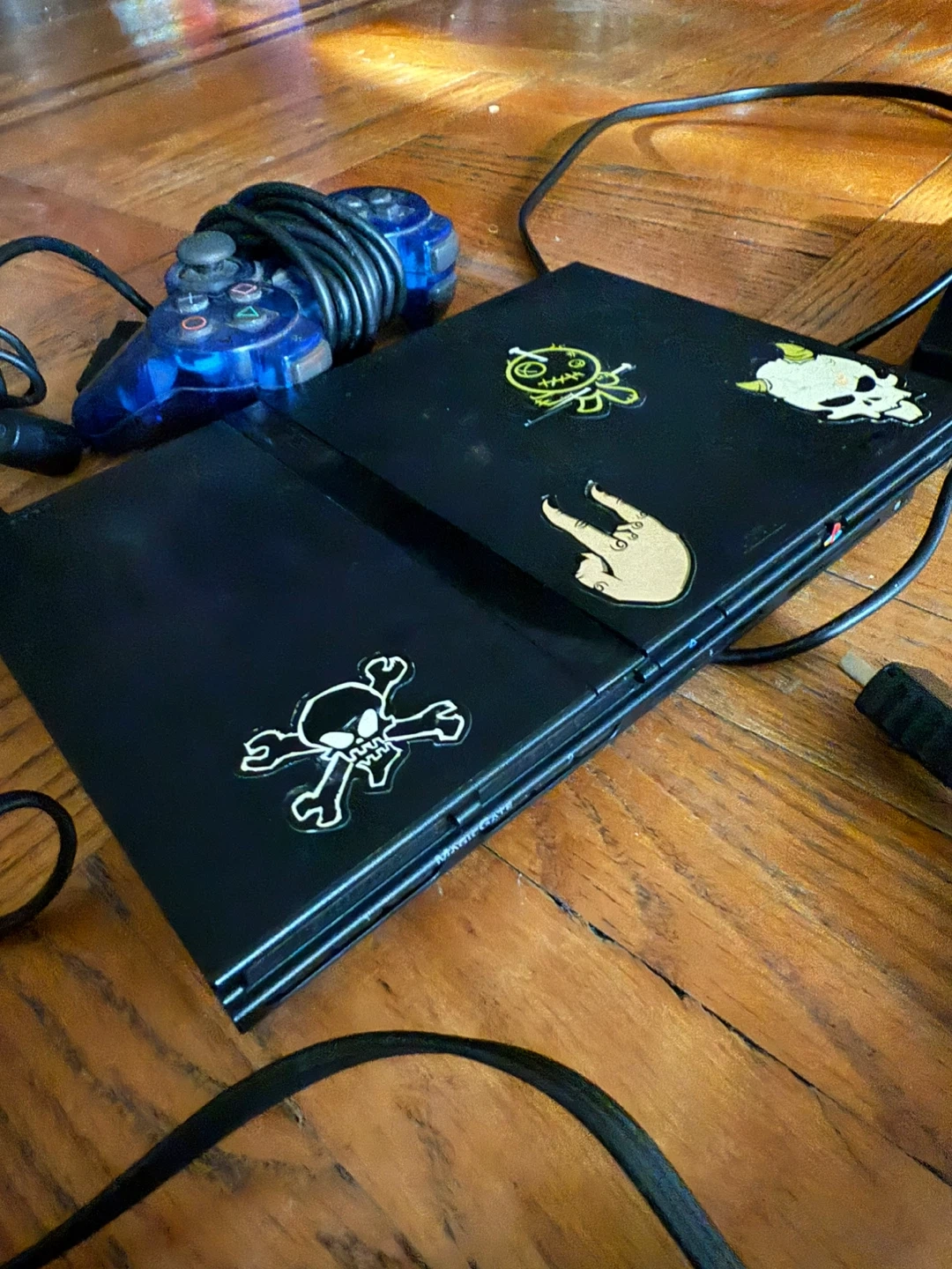 This is a black Sony PlayStation 2 console. It comes with a blue controller and all necessary cables for setup. The console has some stickers on it, including skulls and a cartoon character.