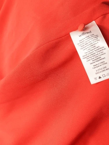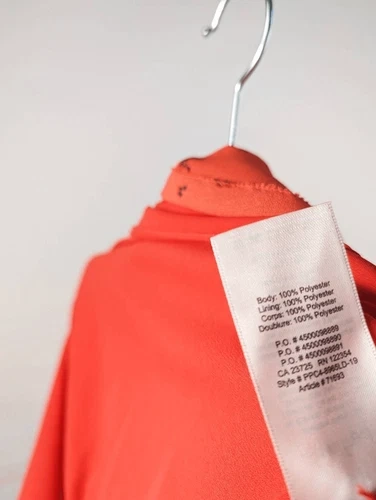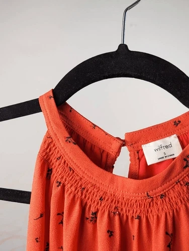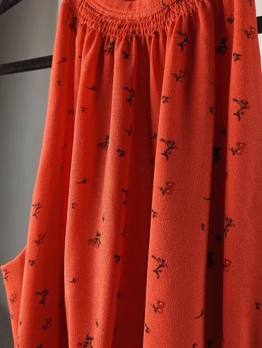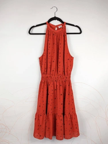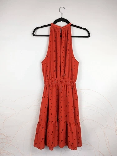 Excellent pre-owned condition. Red-orange color, halter neck, sleeveless, open back, elasticized waist, lined dress.