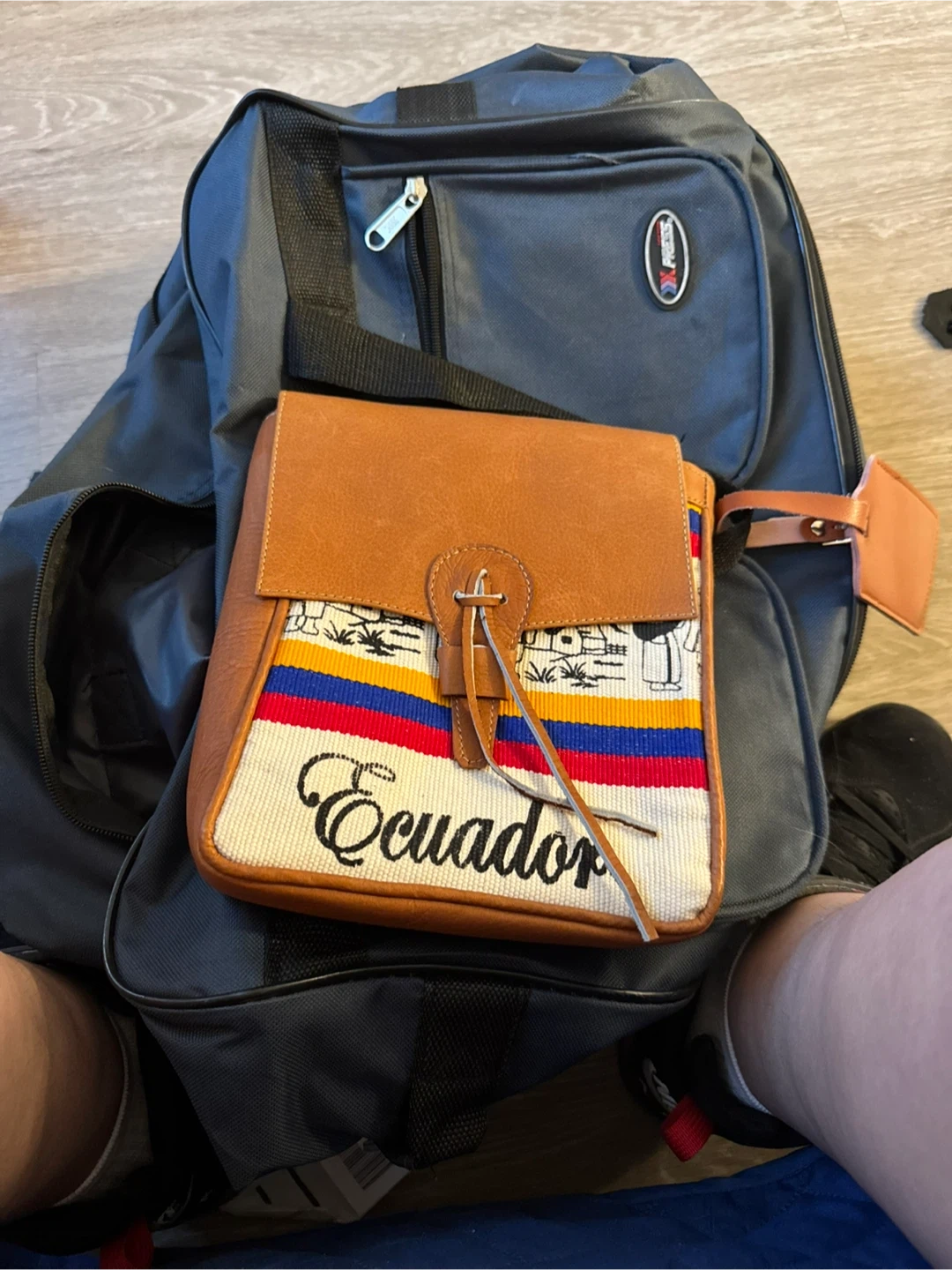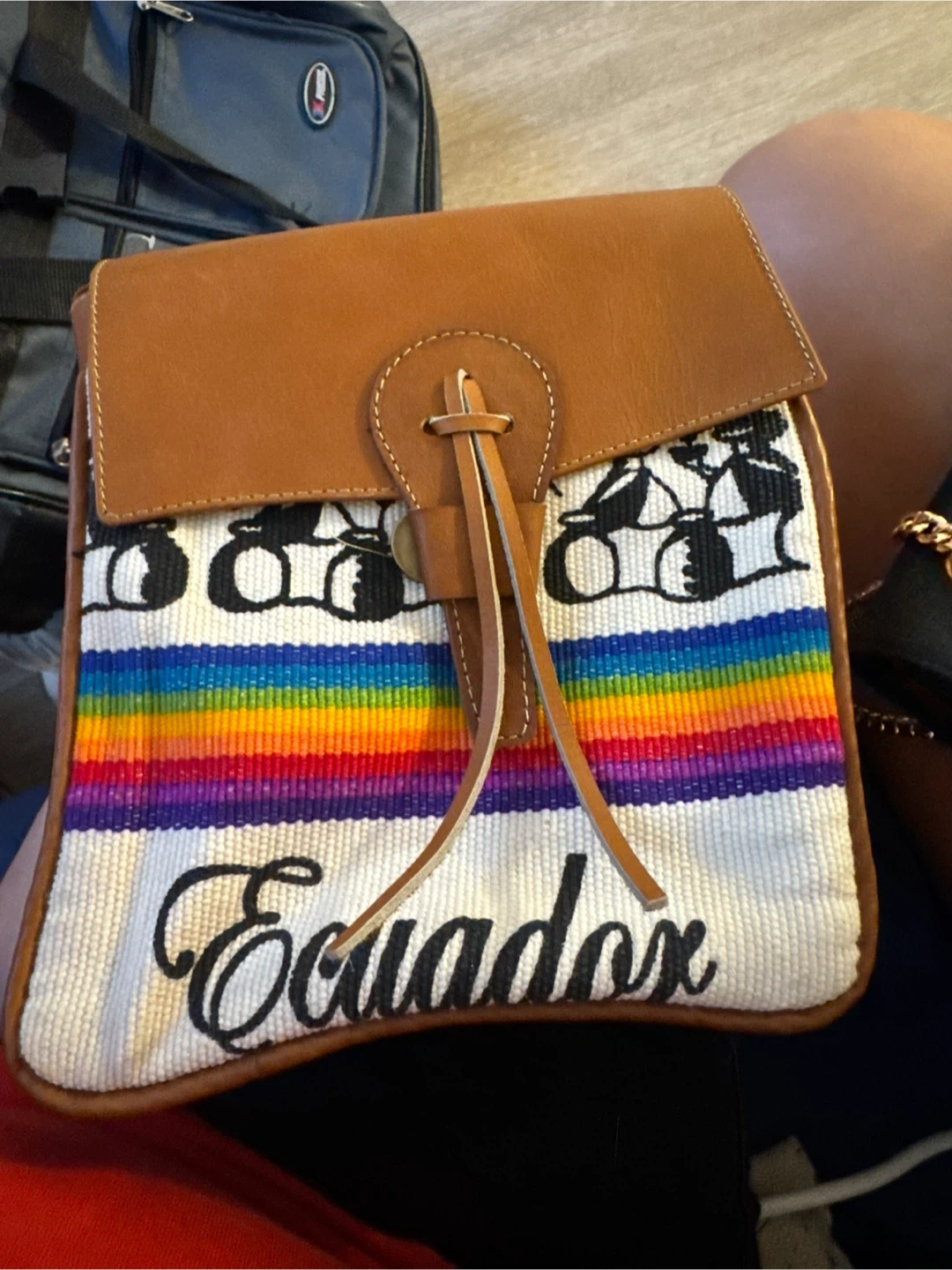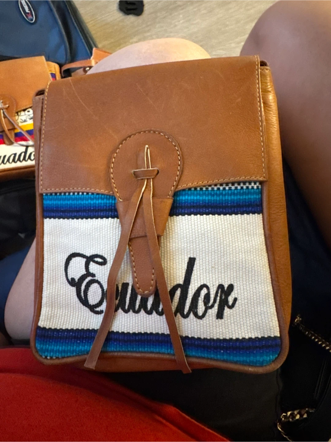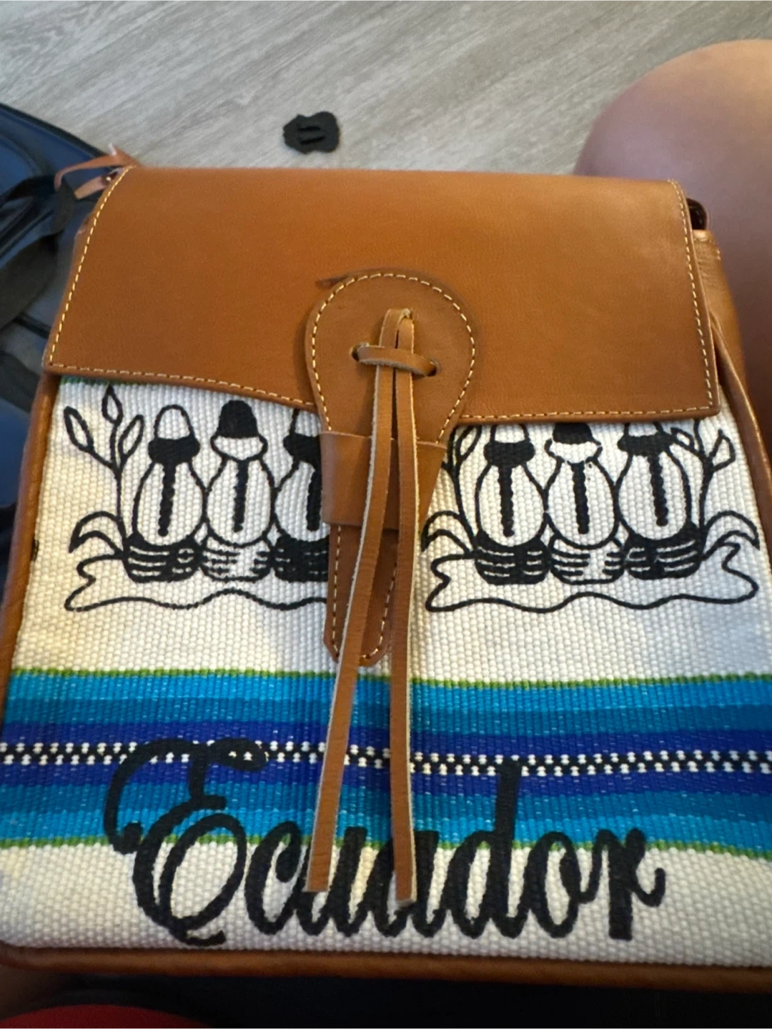 10Cute leather shoulder bag with "Ecuador" design! It has a tan leather flap and woven detailing with colorful stripes. Perfect for adding a unique touch to your outfit each one cost 40