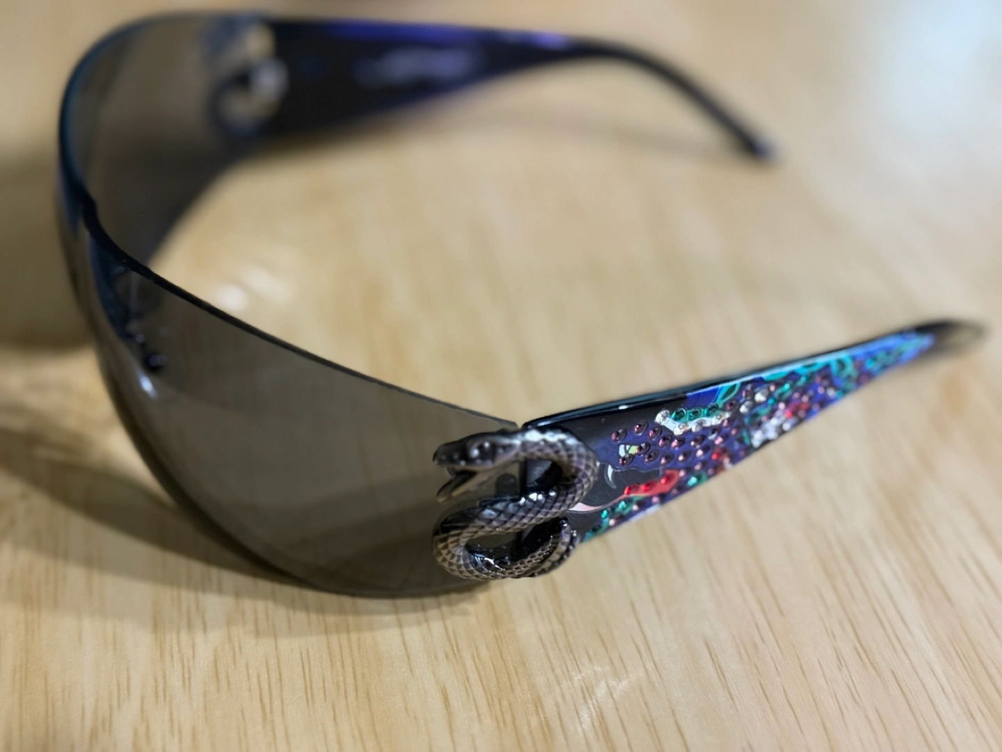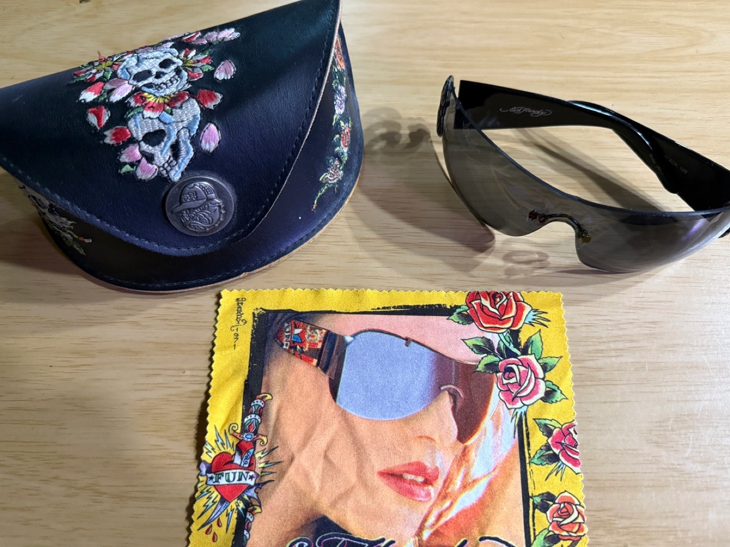 102Unique Ed Hardy sunglasses. Features a snake design and rhinestones. Includes a leather case with skull embroidery. Pre-owned.