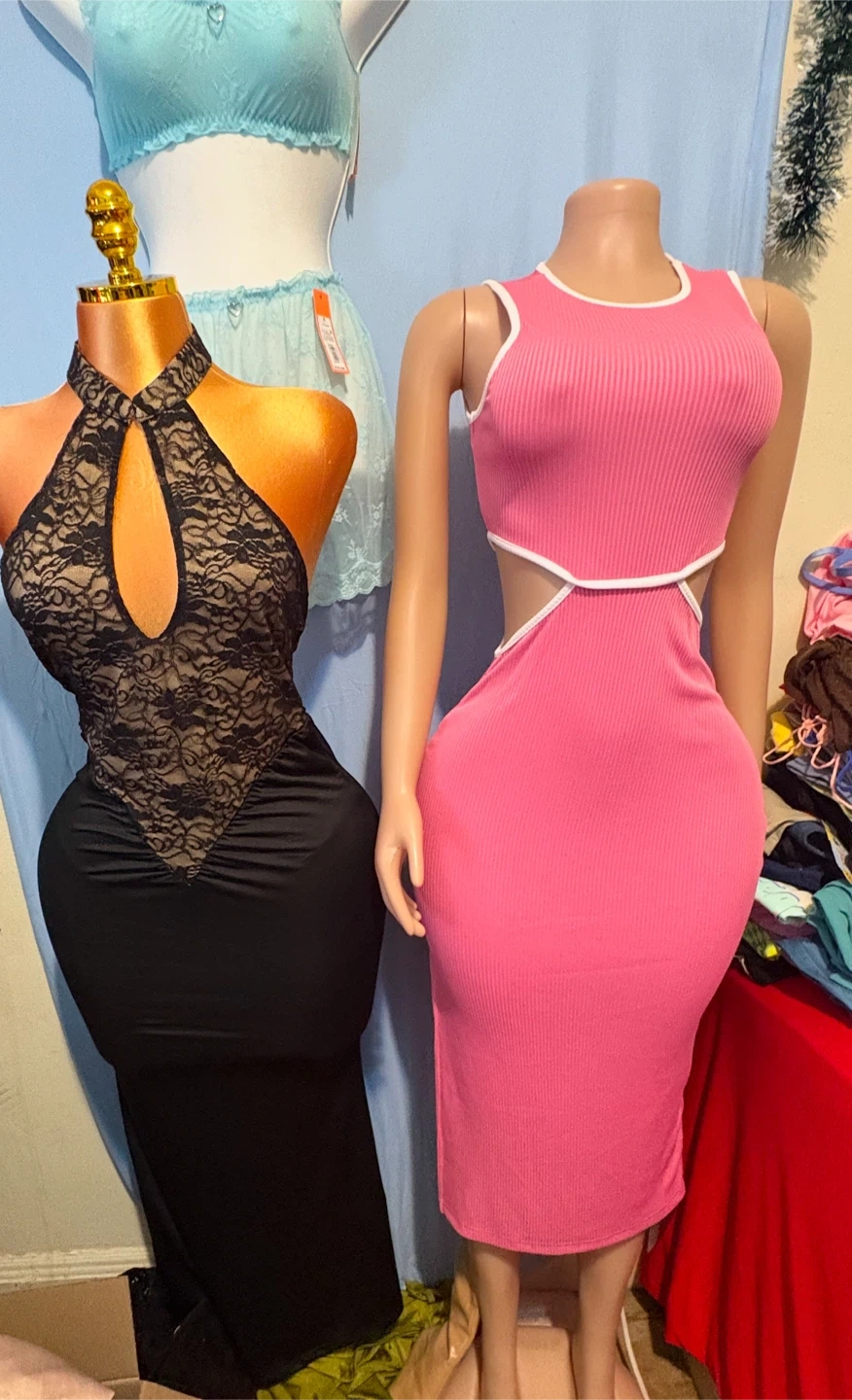 This pink ribbed midi dress features a flattering cutout design and white trim. It's a sleeveless, bodycon style perfect for a night out. Made from a stretchy knit material.