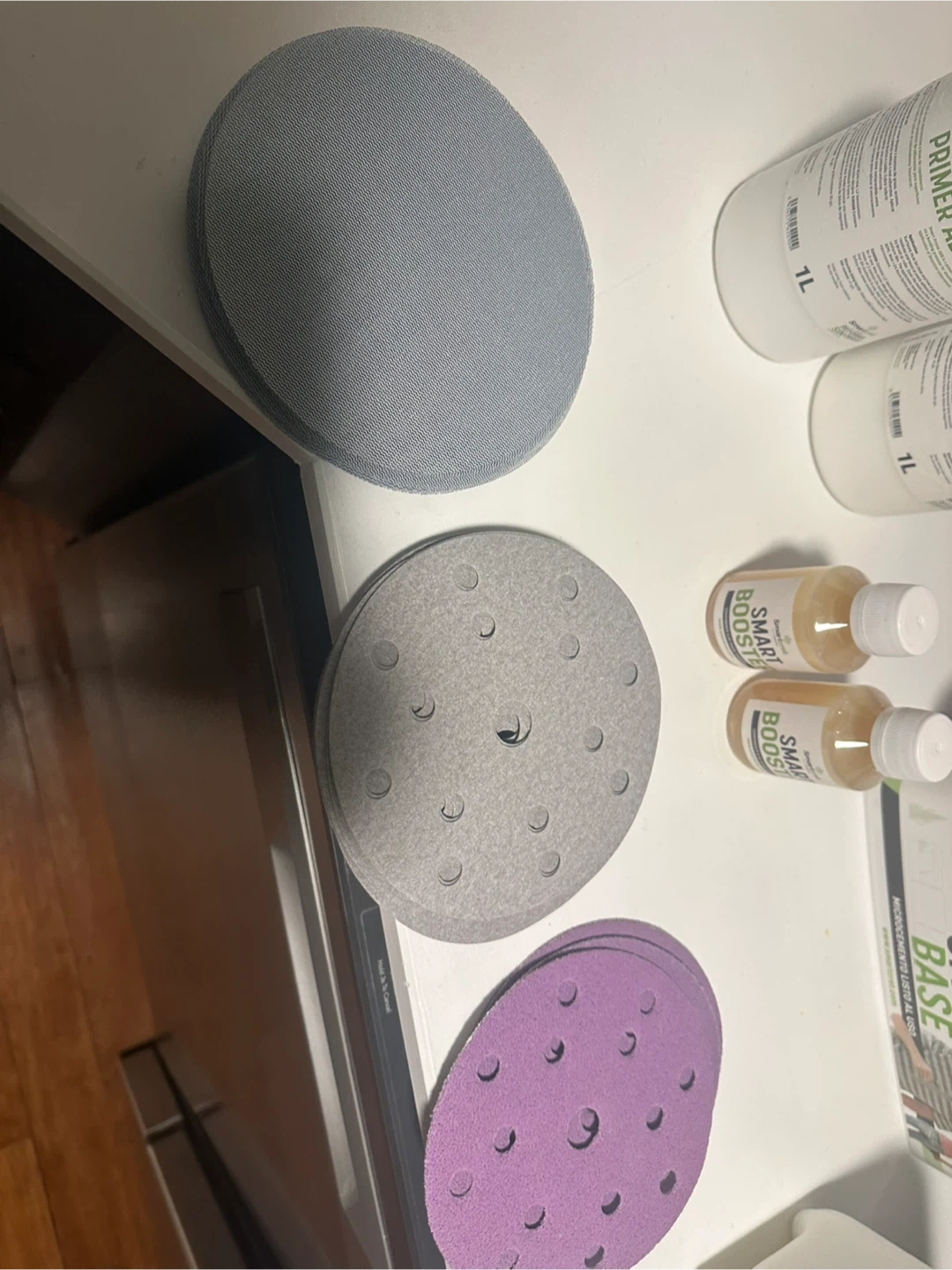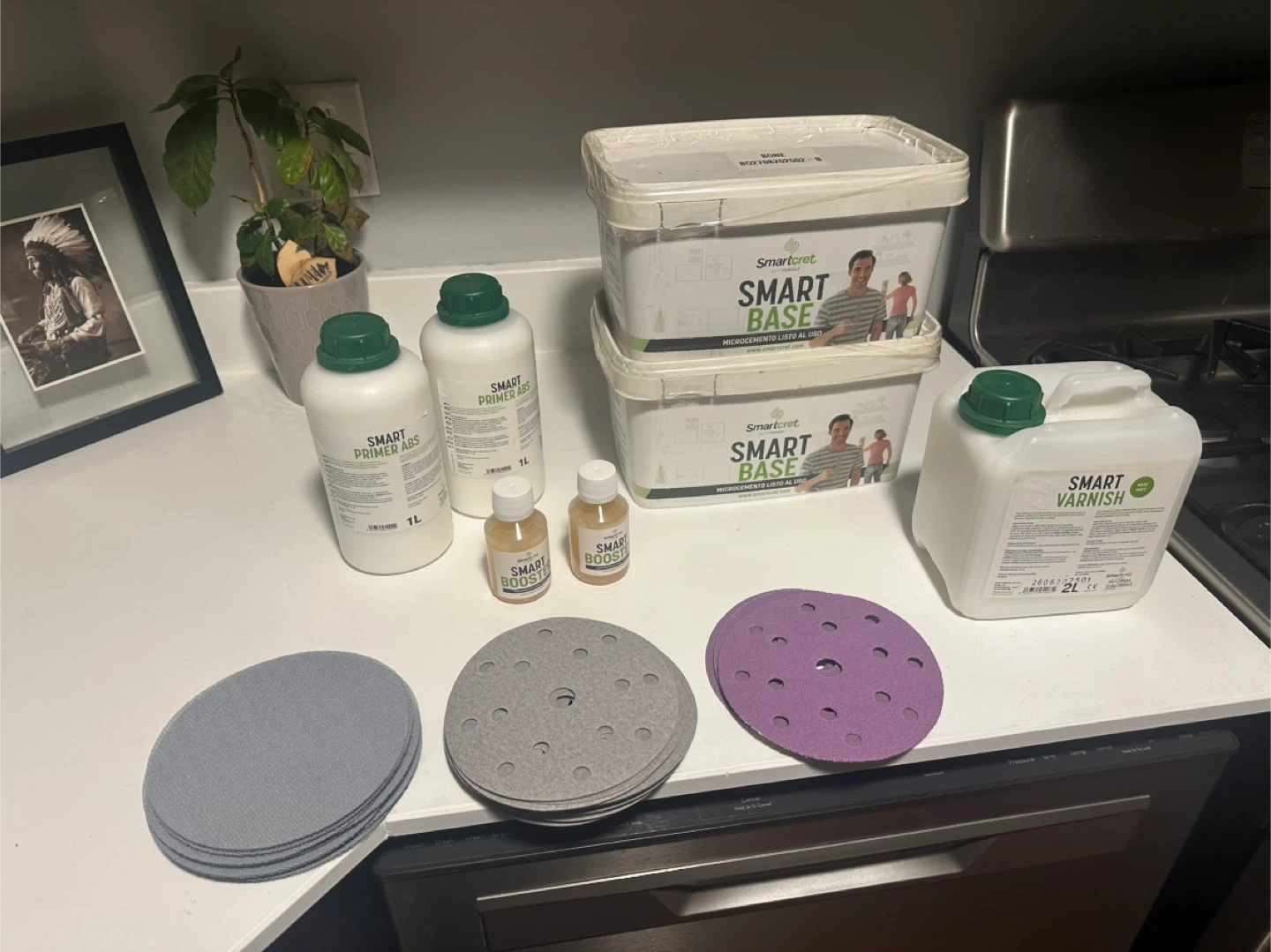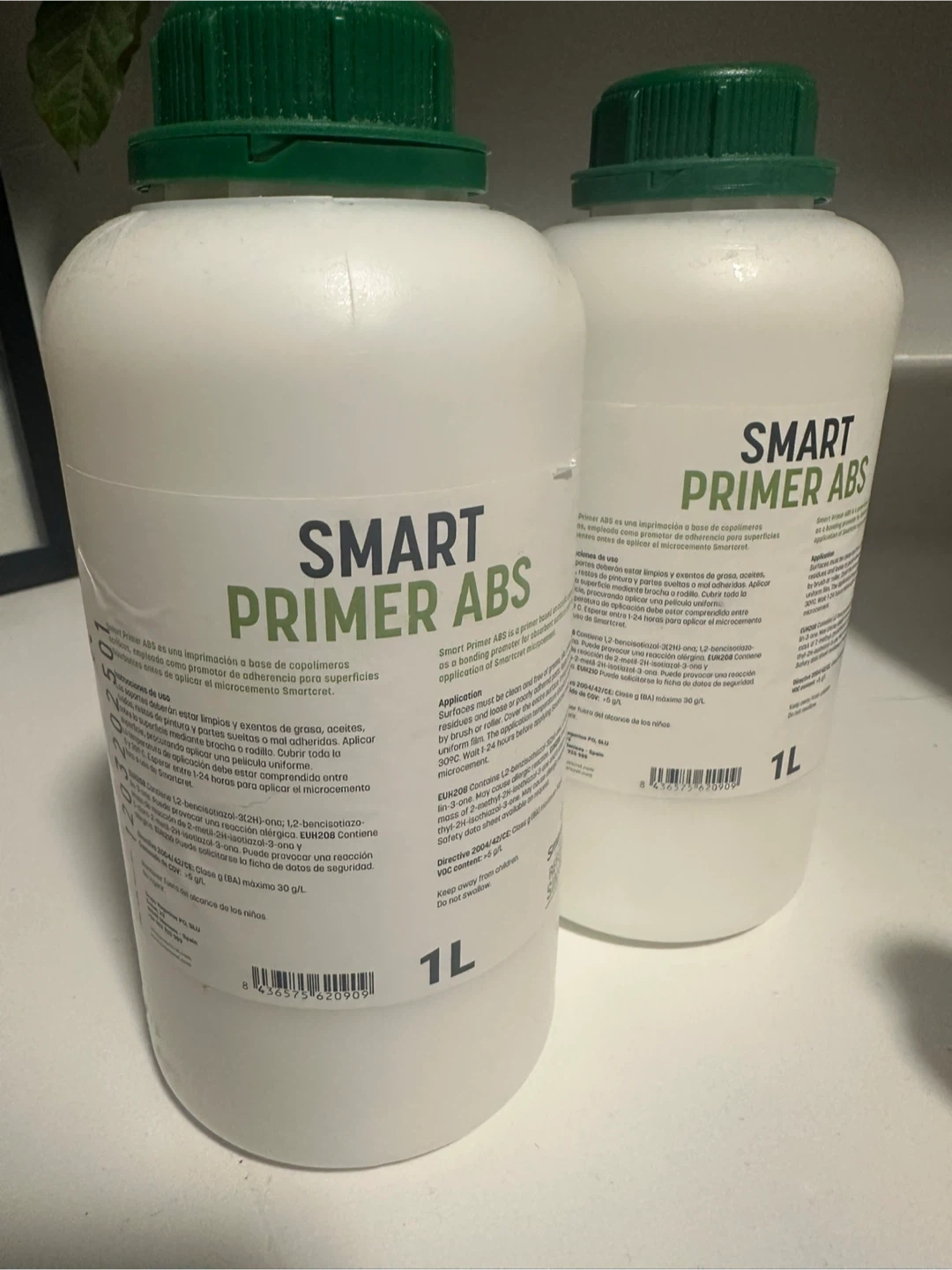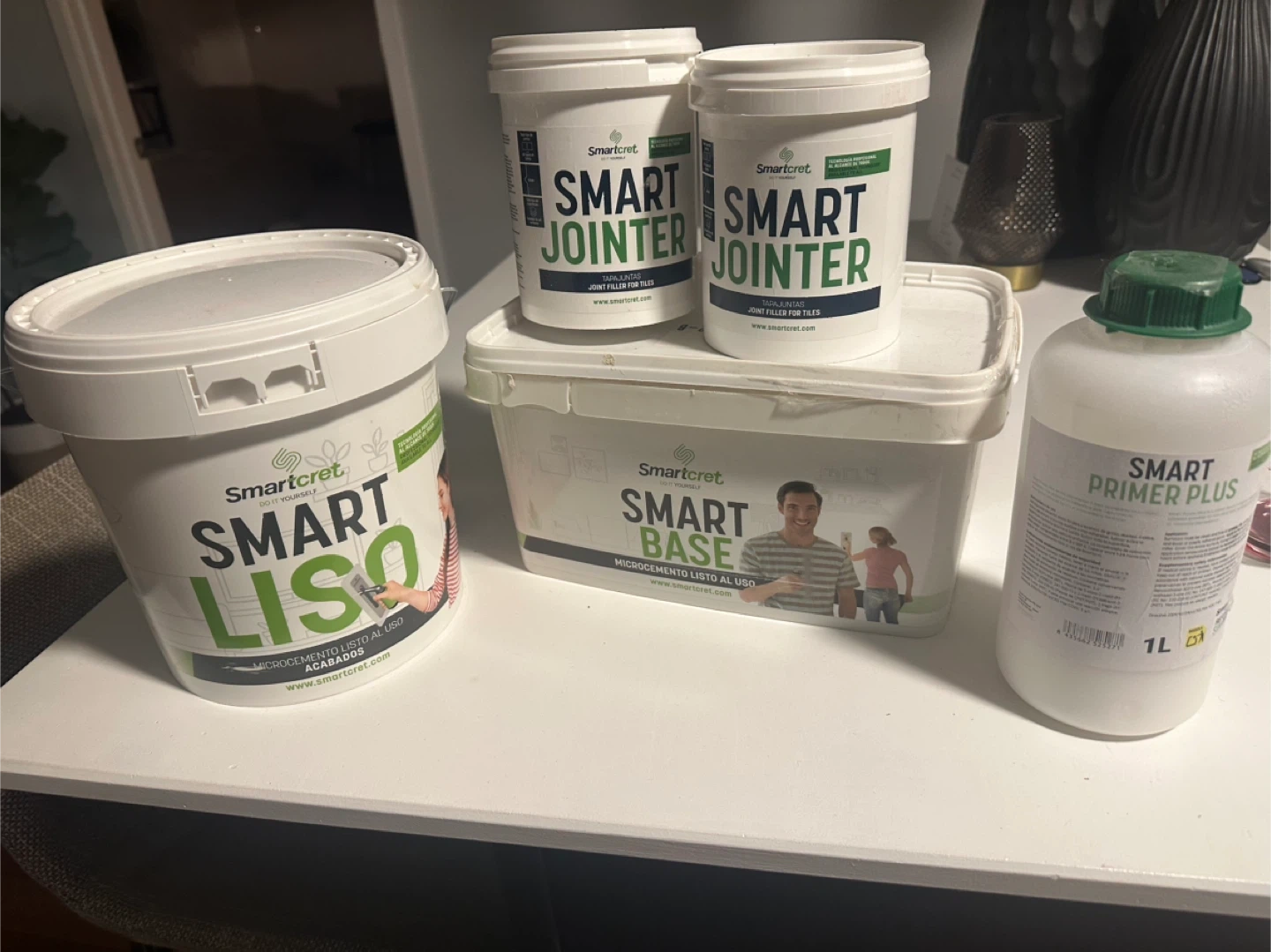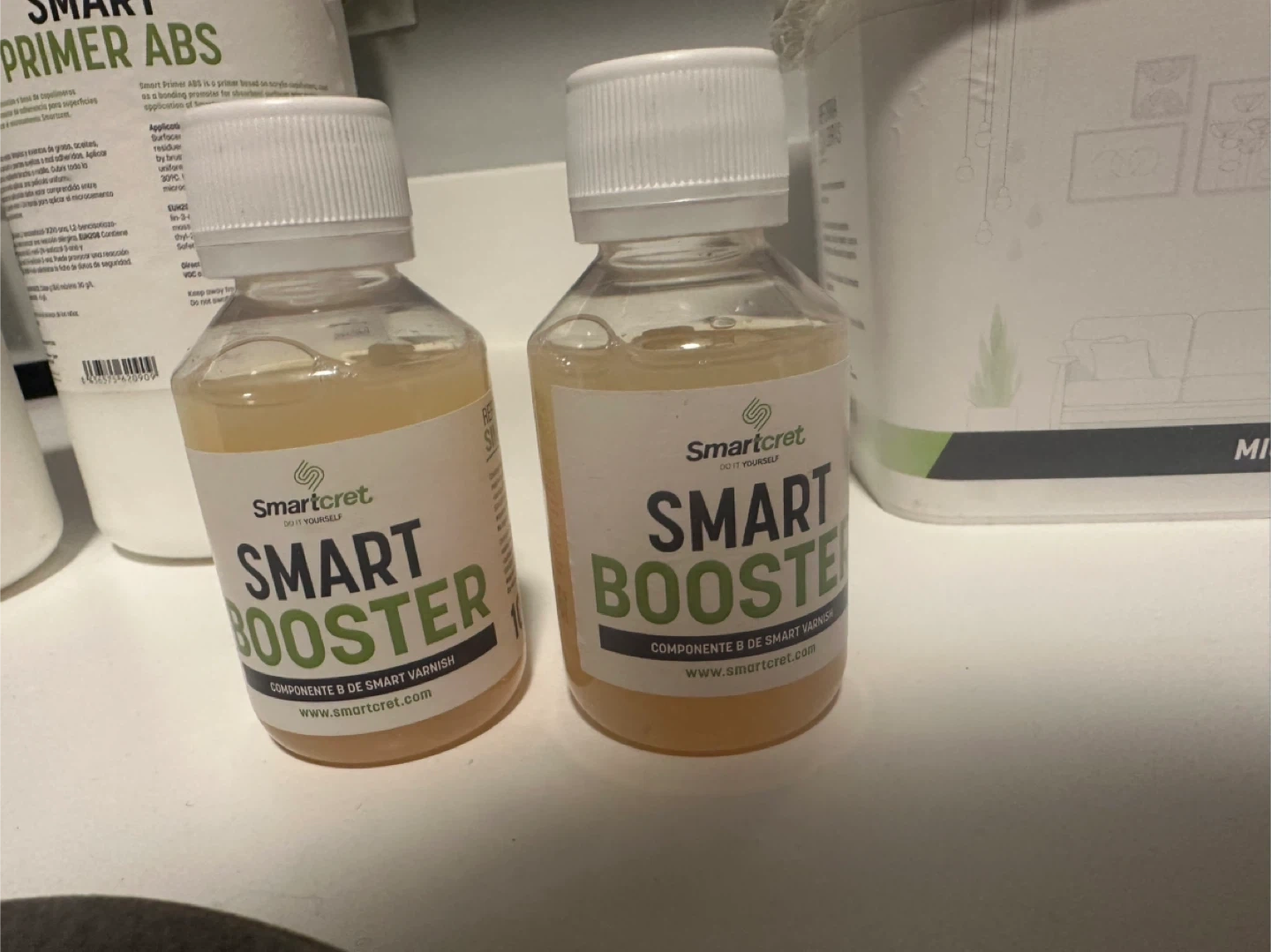 This kit includes Bone color (all) new Smart Base (2x), new Smart Primer ABS (2x 1L), new Smart Booster (2x), and Smart Varnish (2L). Also includes sanding discs. Perfect for creating a seamless microcement finish on bathroom walls, ceiling or floor. Plus some free leftovers from Smart Liso, another Smart Base, Smart Joiner, and Pimer.