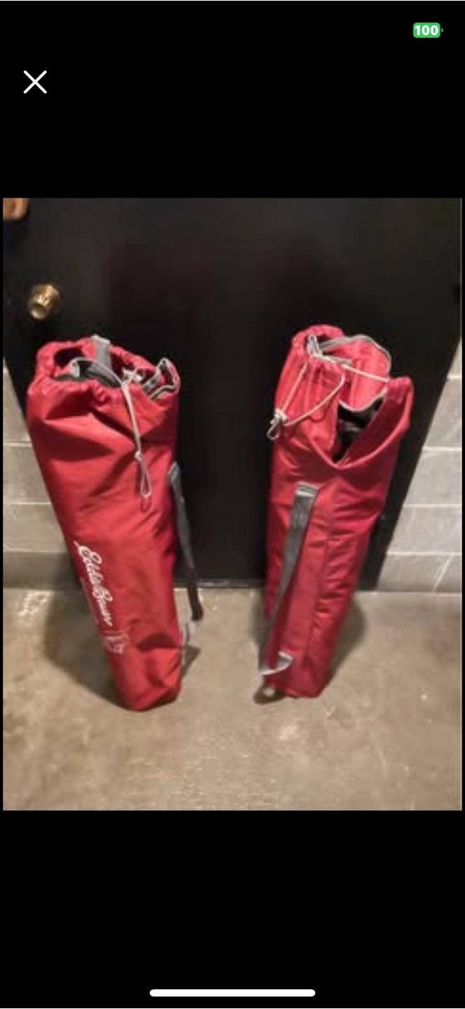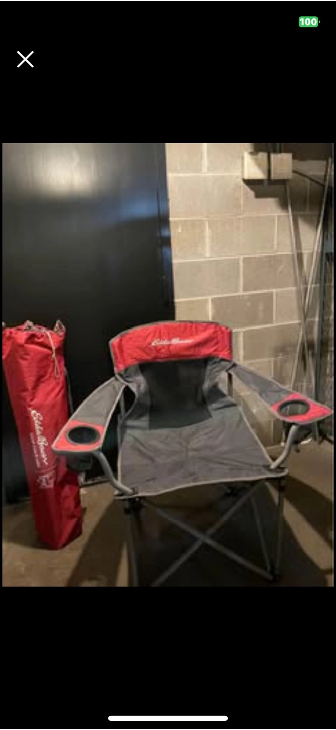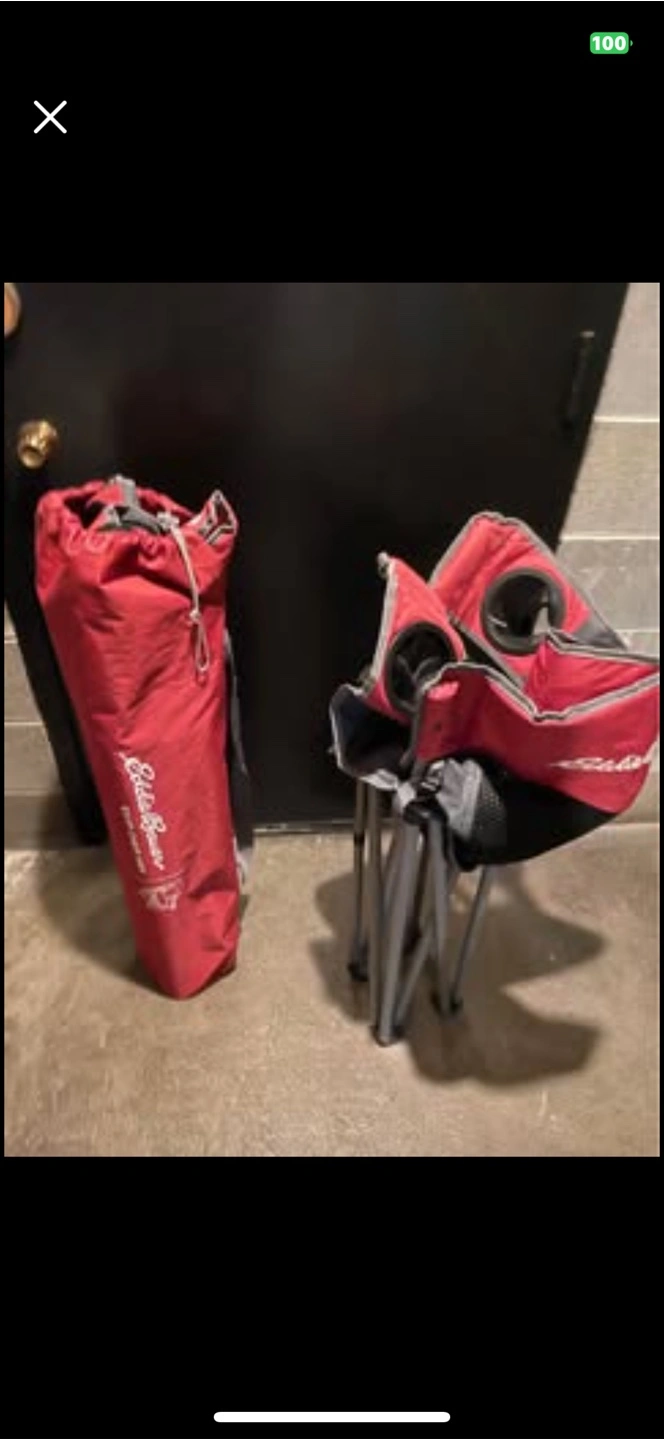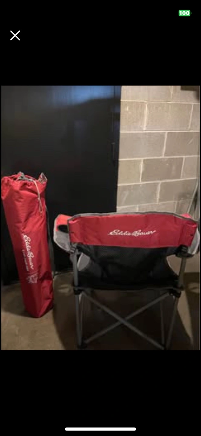 75Two Eddie Bauer folding camp chairs. Red and gray. Carry bags included. Great for camping or outdoor events.