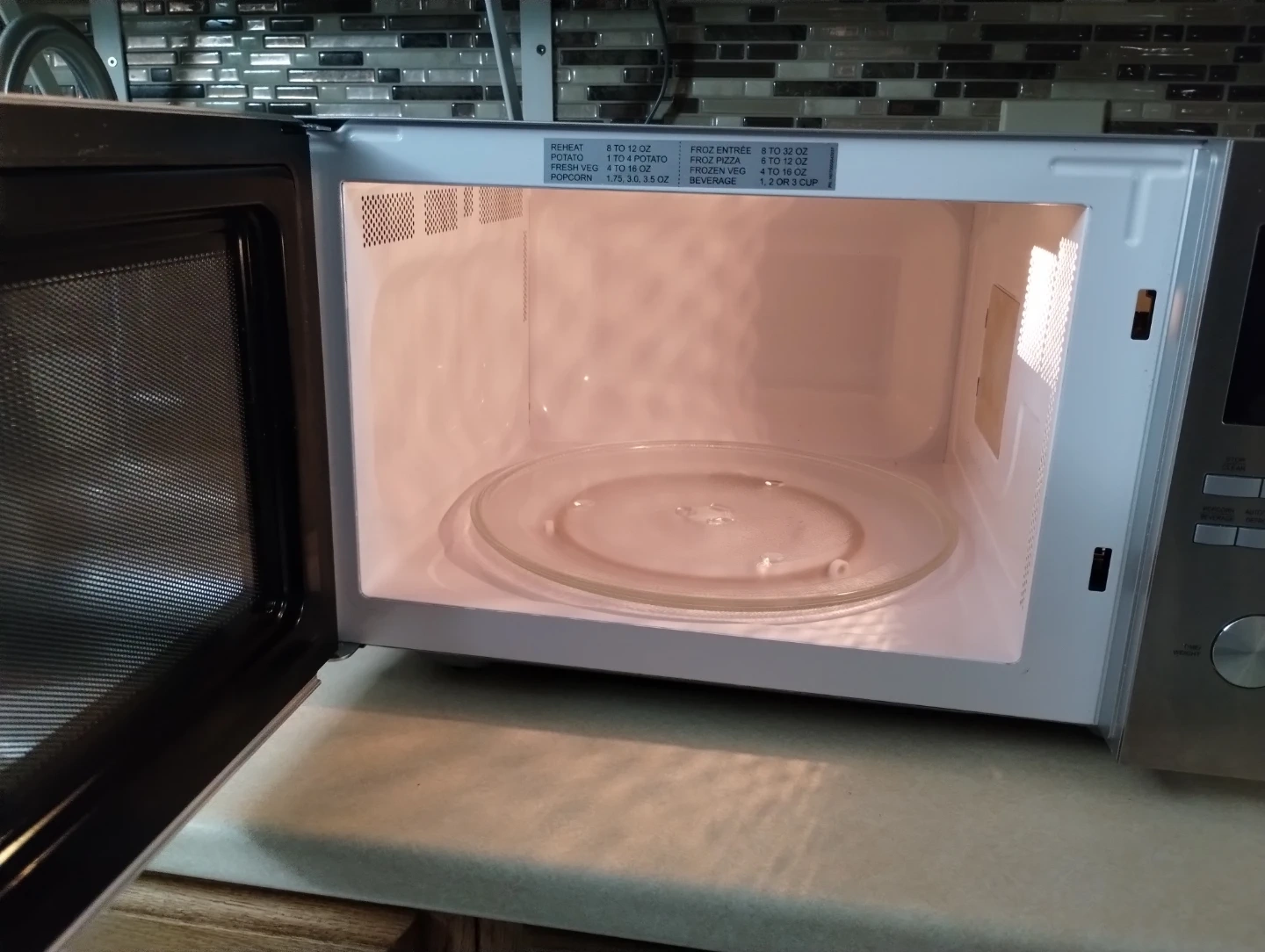 Stainless steel microwave with a 19-inch width, 12.5-inch height, and 22-inch length. Features a glass turntable inside for even cooking. It's a convenient kitchen appliance for quick heating and cooking.